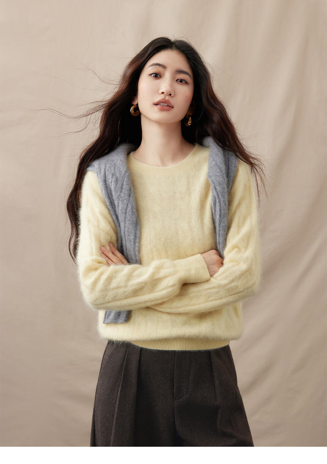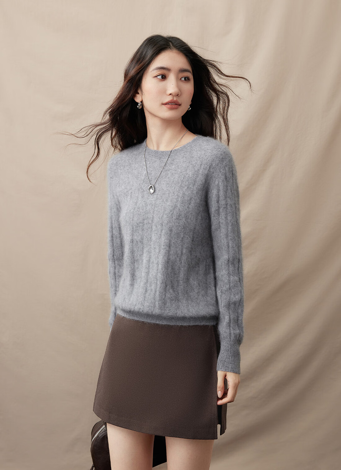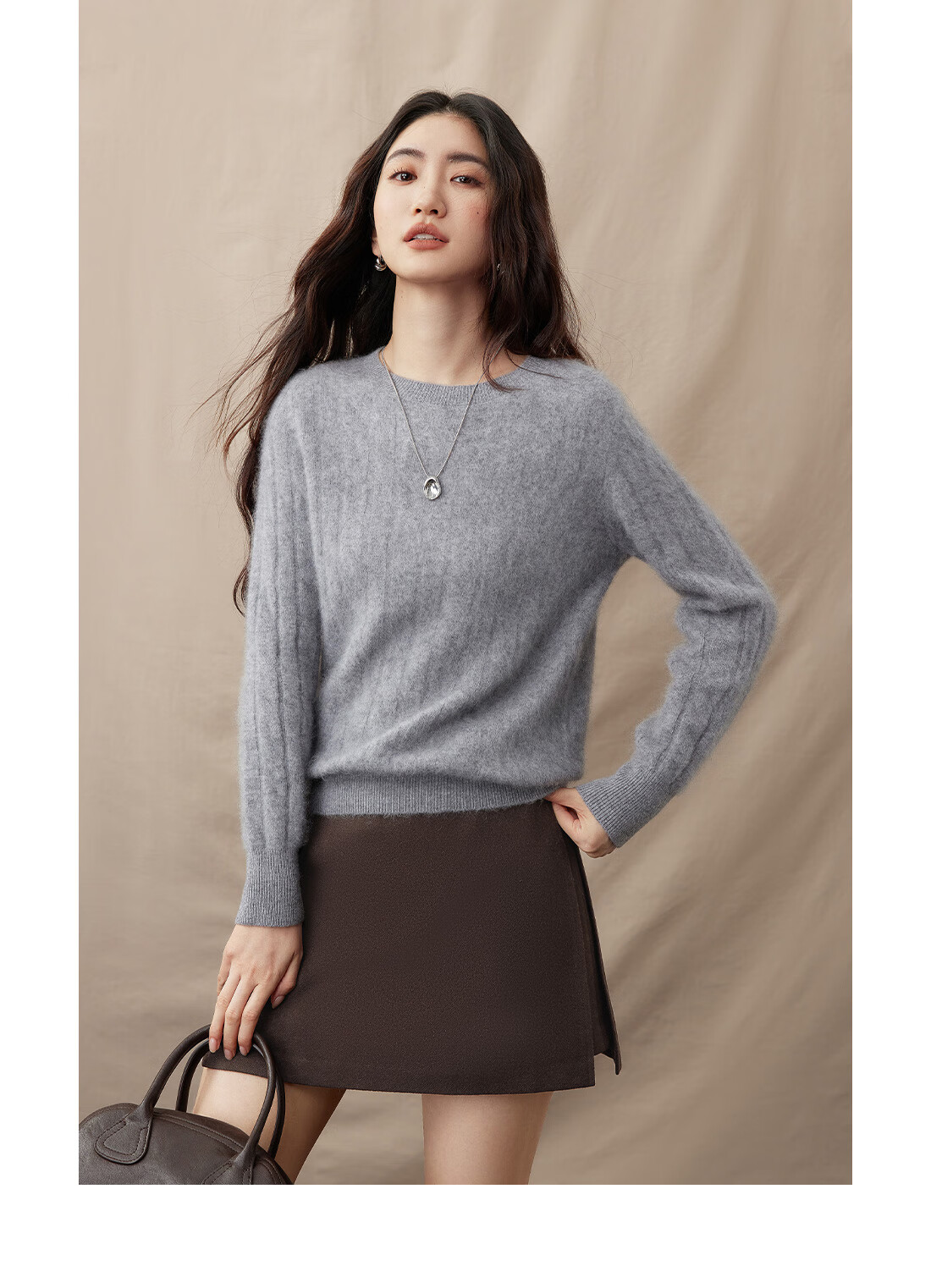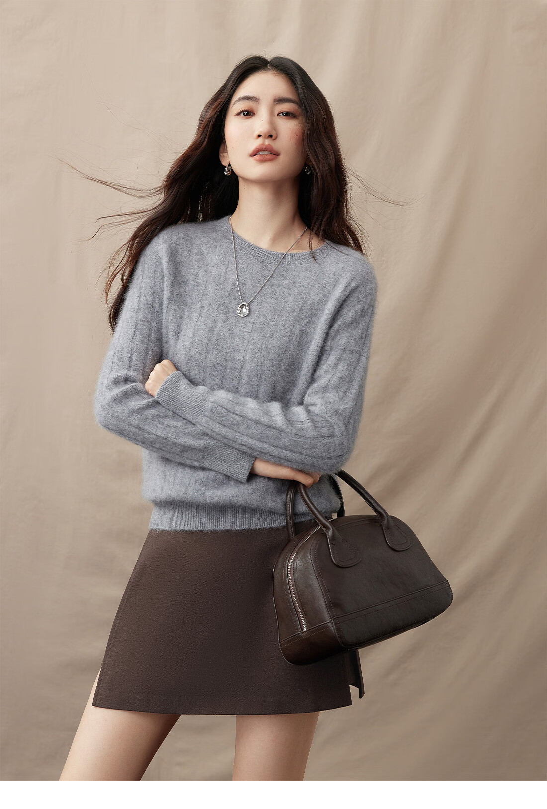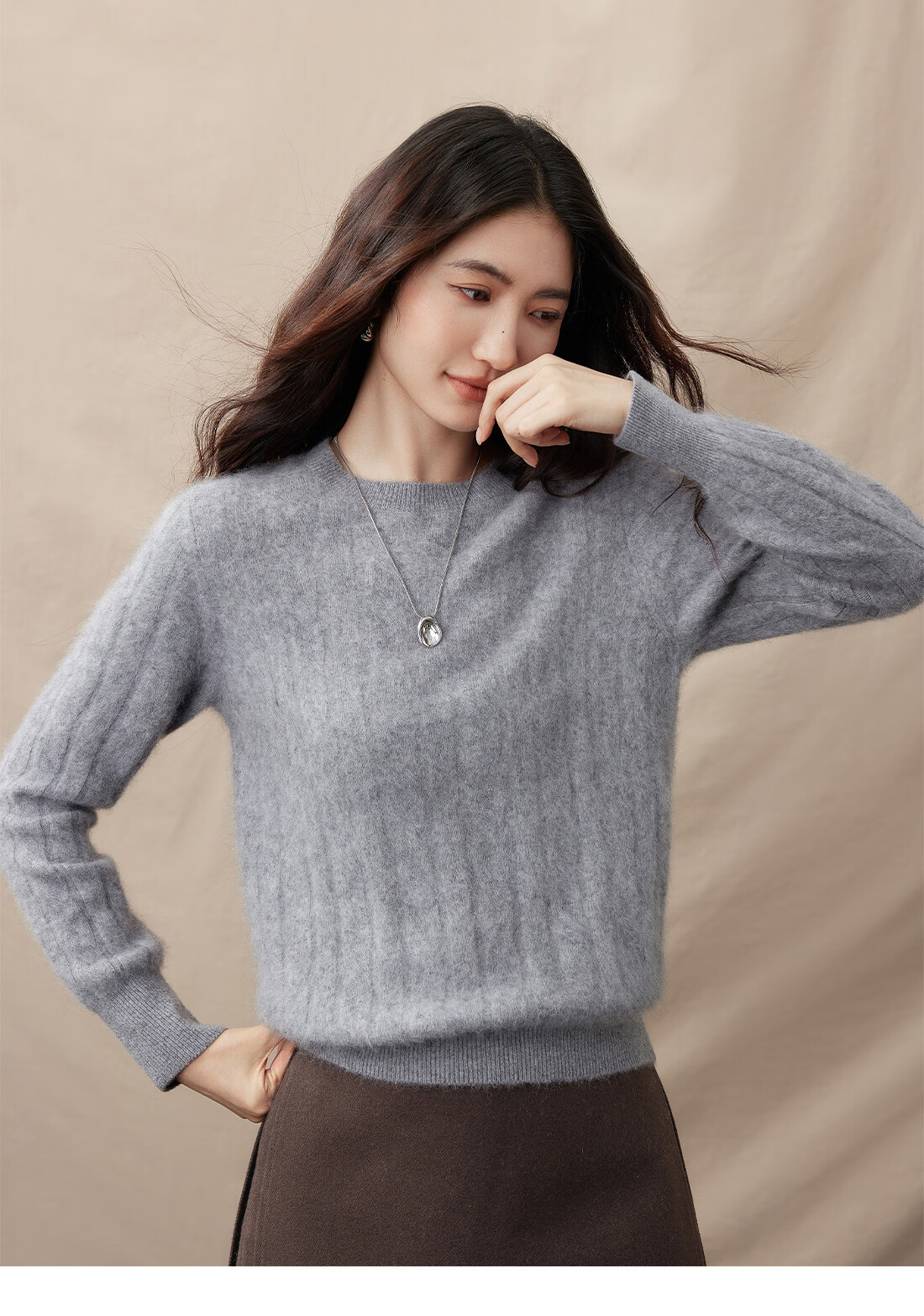 L.WEST crew neck pullover women's 2025 winter new simple commuting 100% wool cable knit sweater gray S 85-100Jin Jin equals 0.5 kg