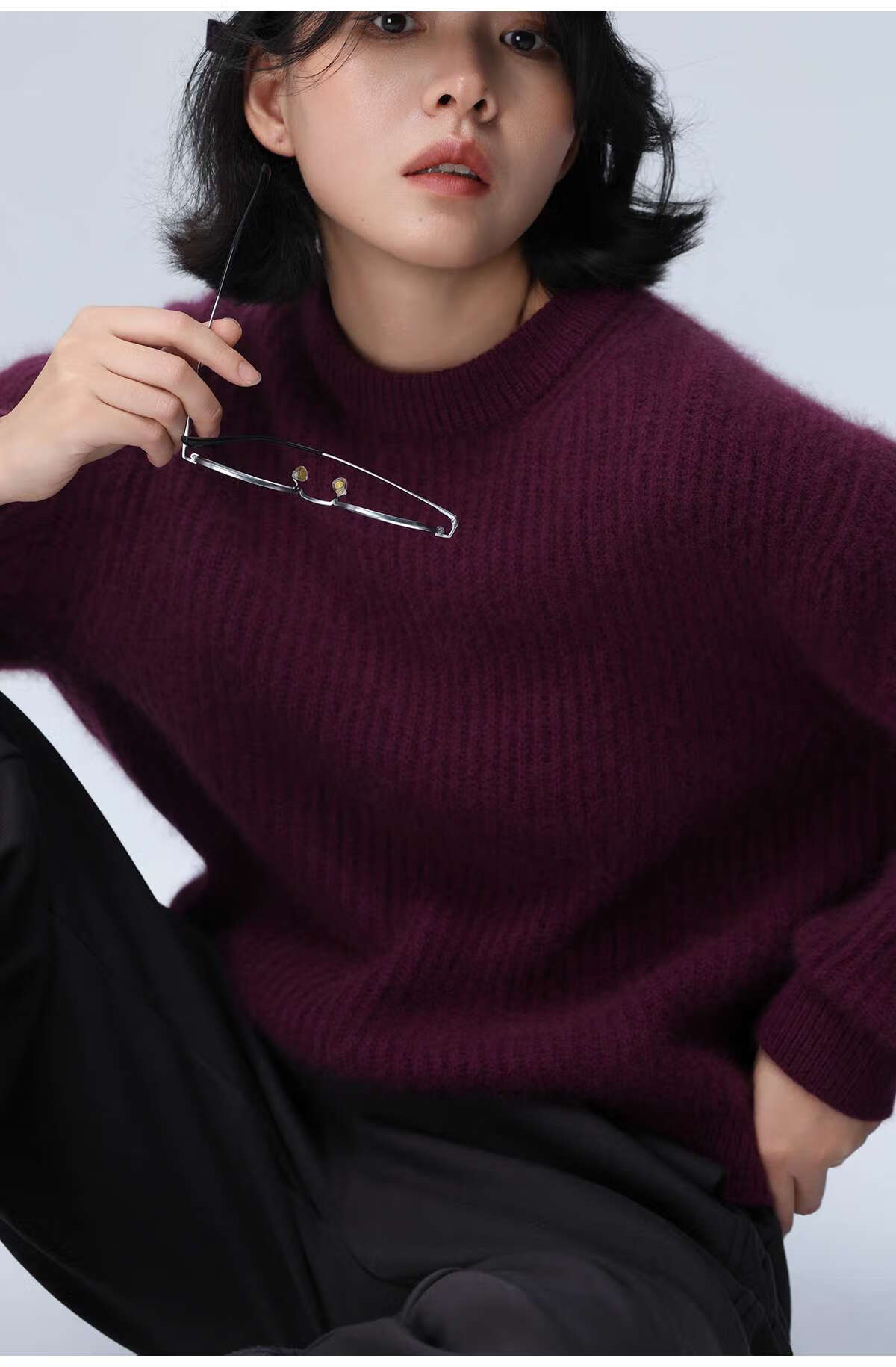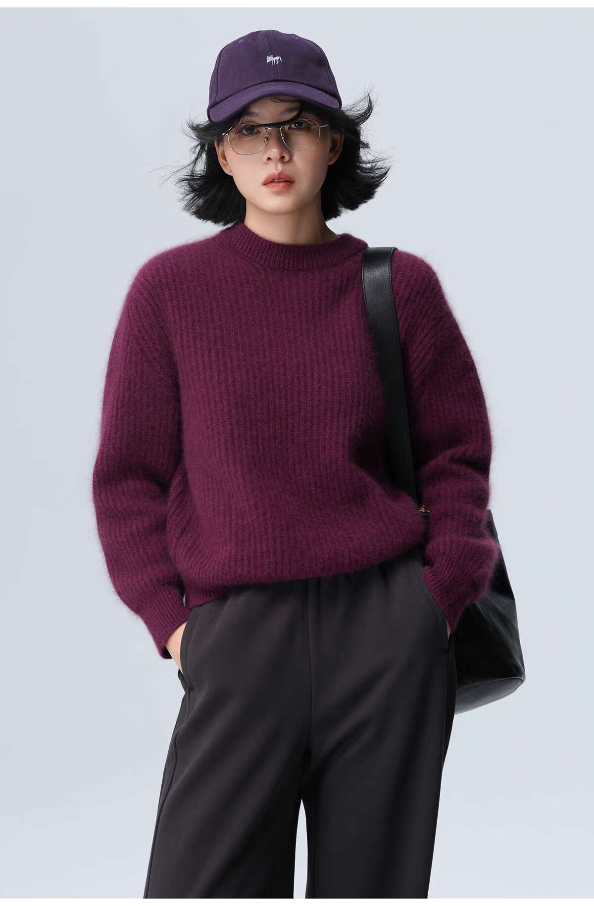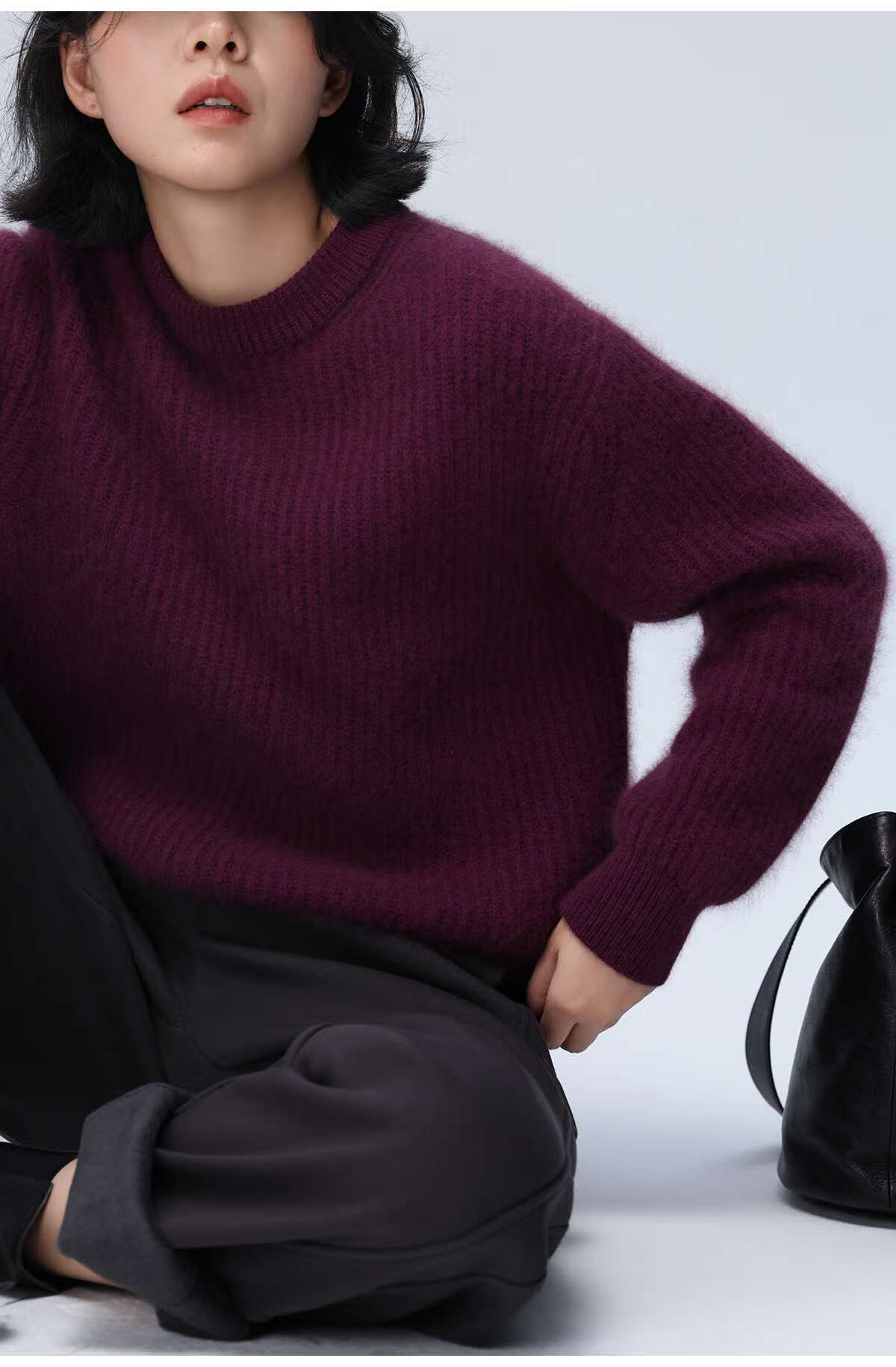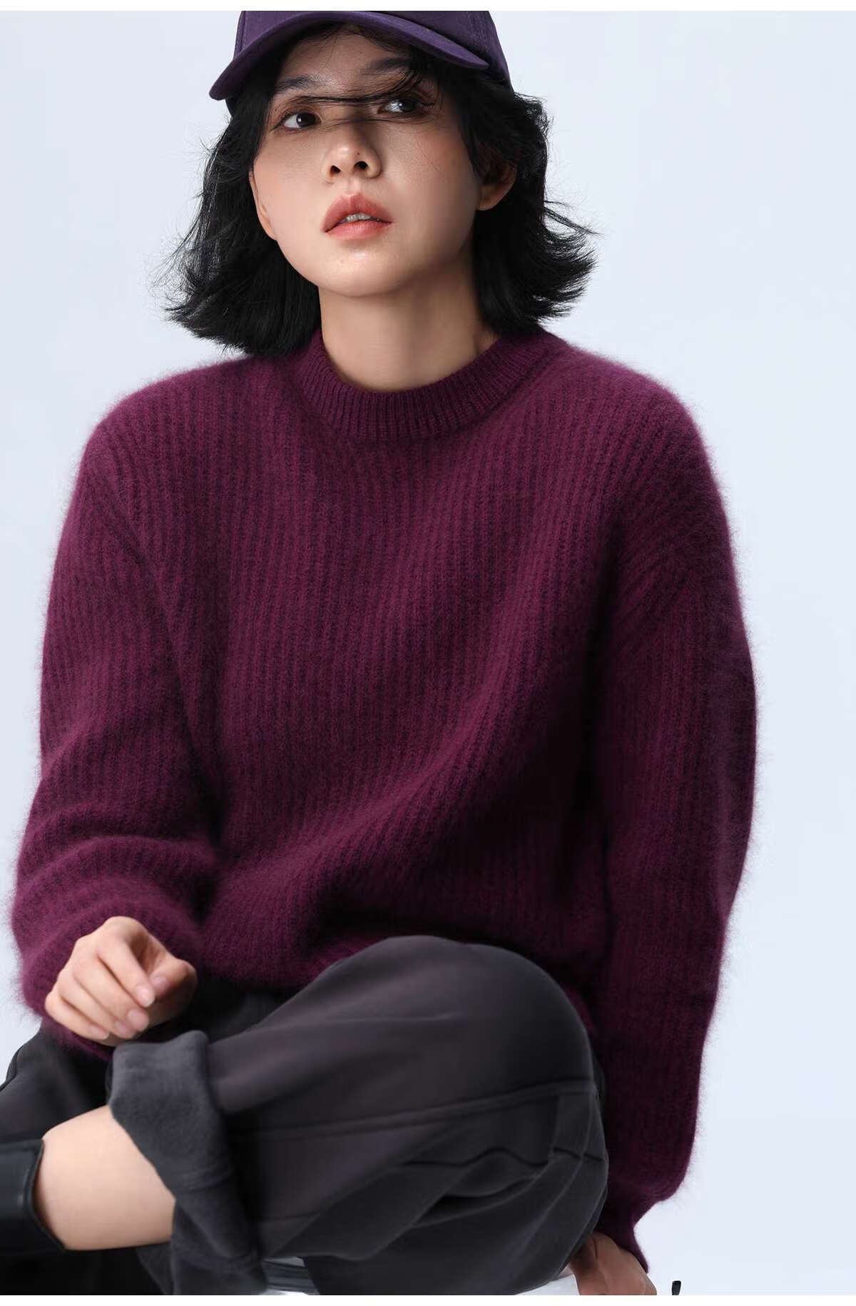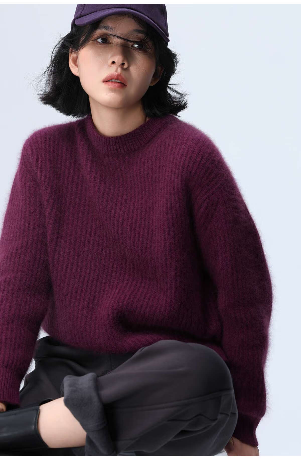 Xingshi WeTHEE high-end thickened raccoon velvet small round neck vertical stripe slightly loose pullover sweater for women, prune purple, one size