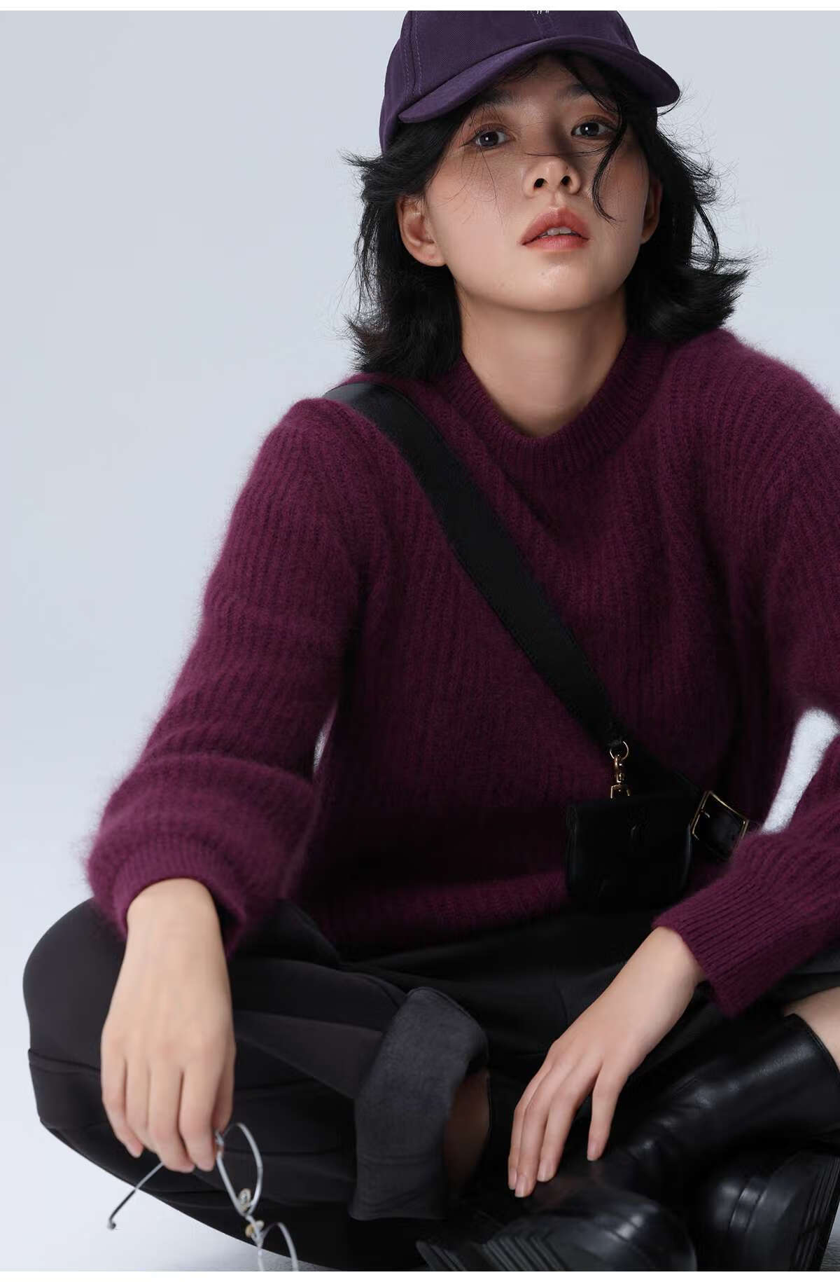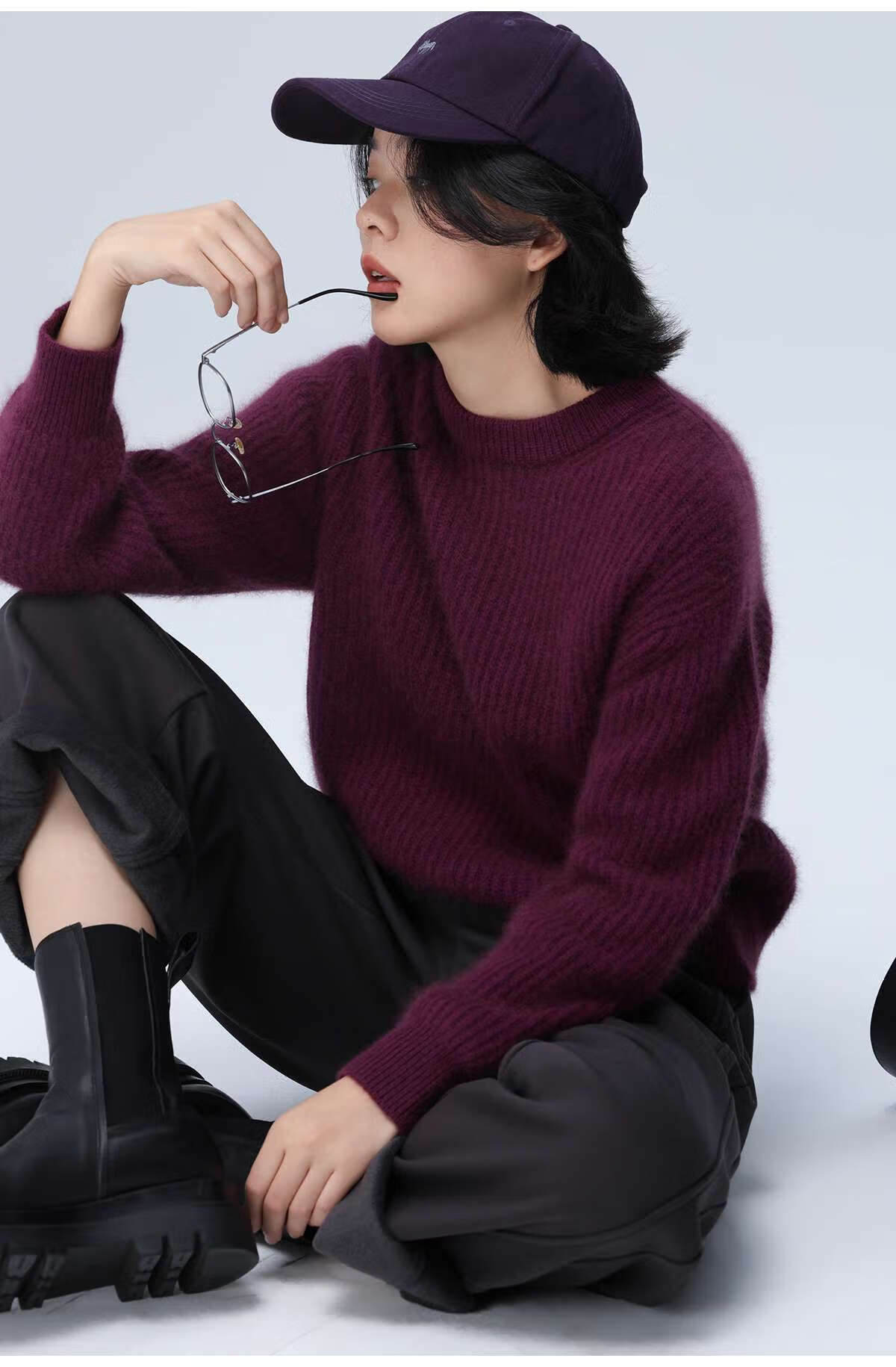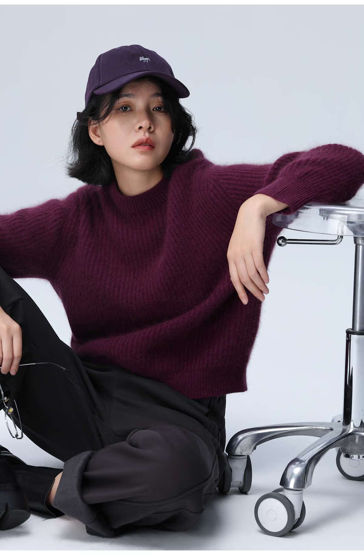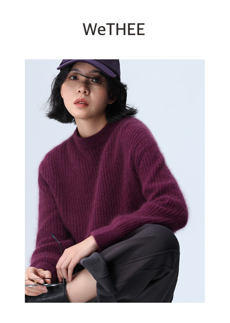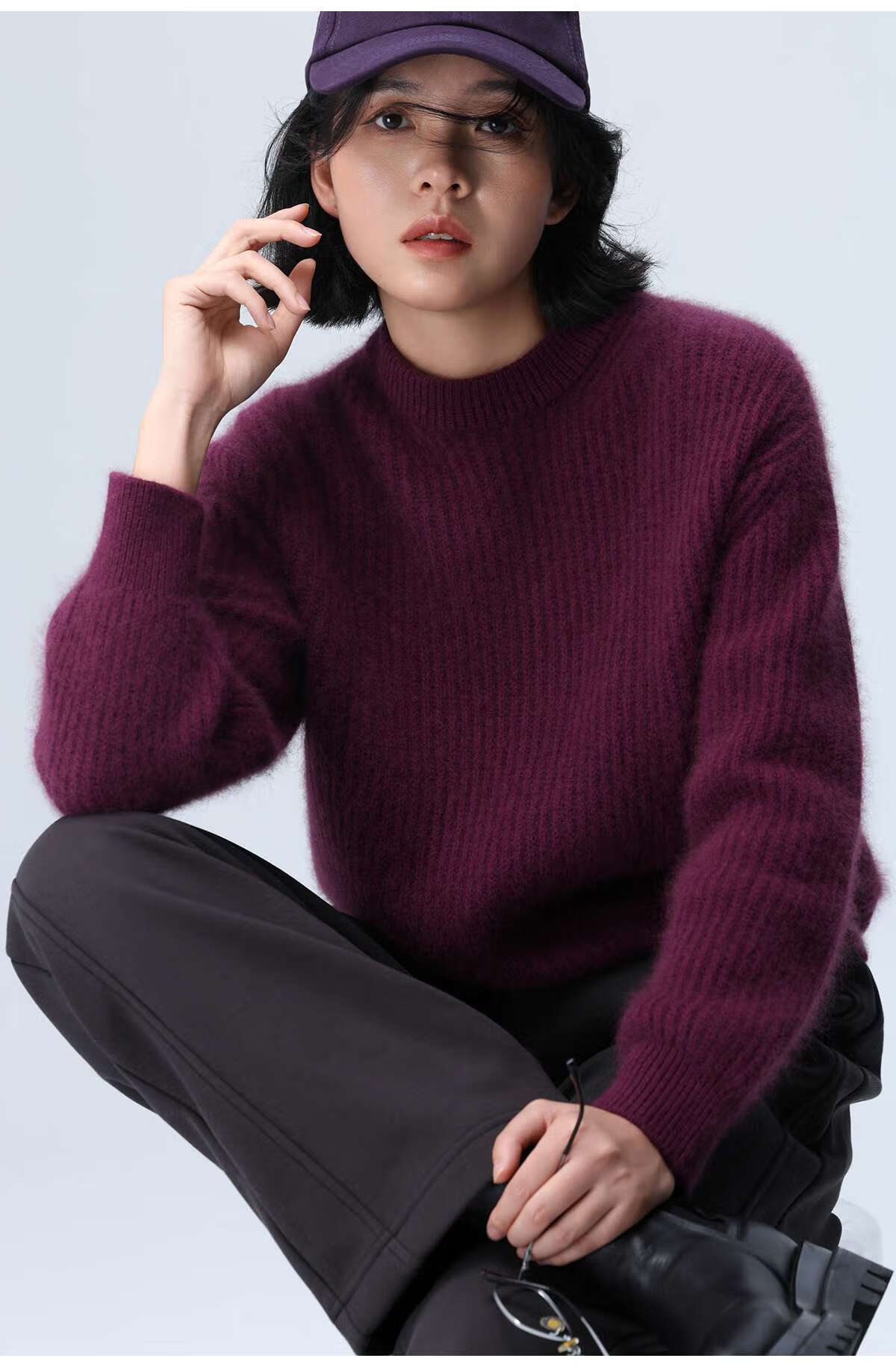 Xingshi WeTHEE high-end thickened raccoon velvet small round neck vertical stripe slightly loose pullover sweater for women, prune purple, one size