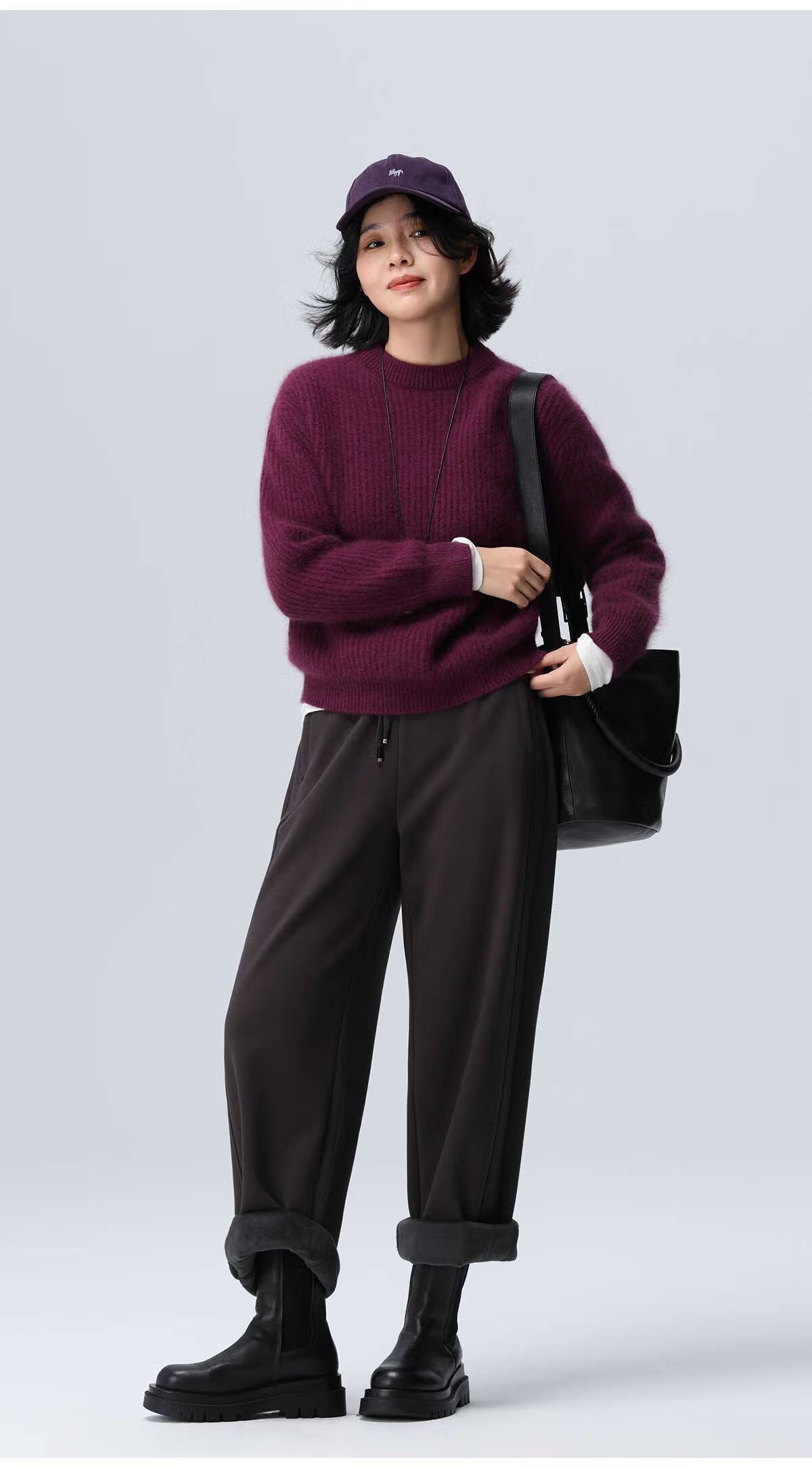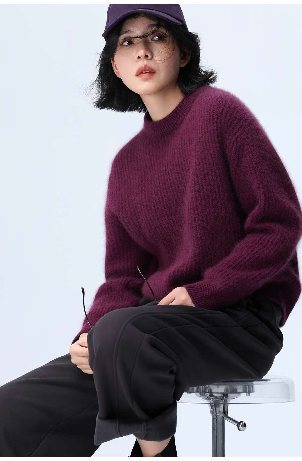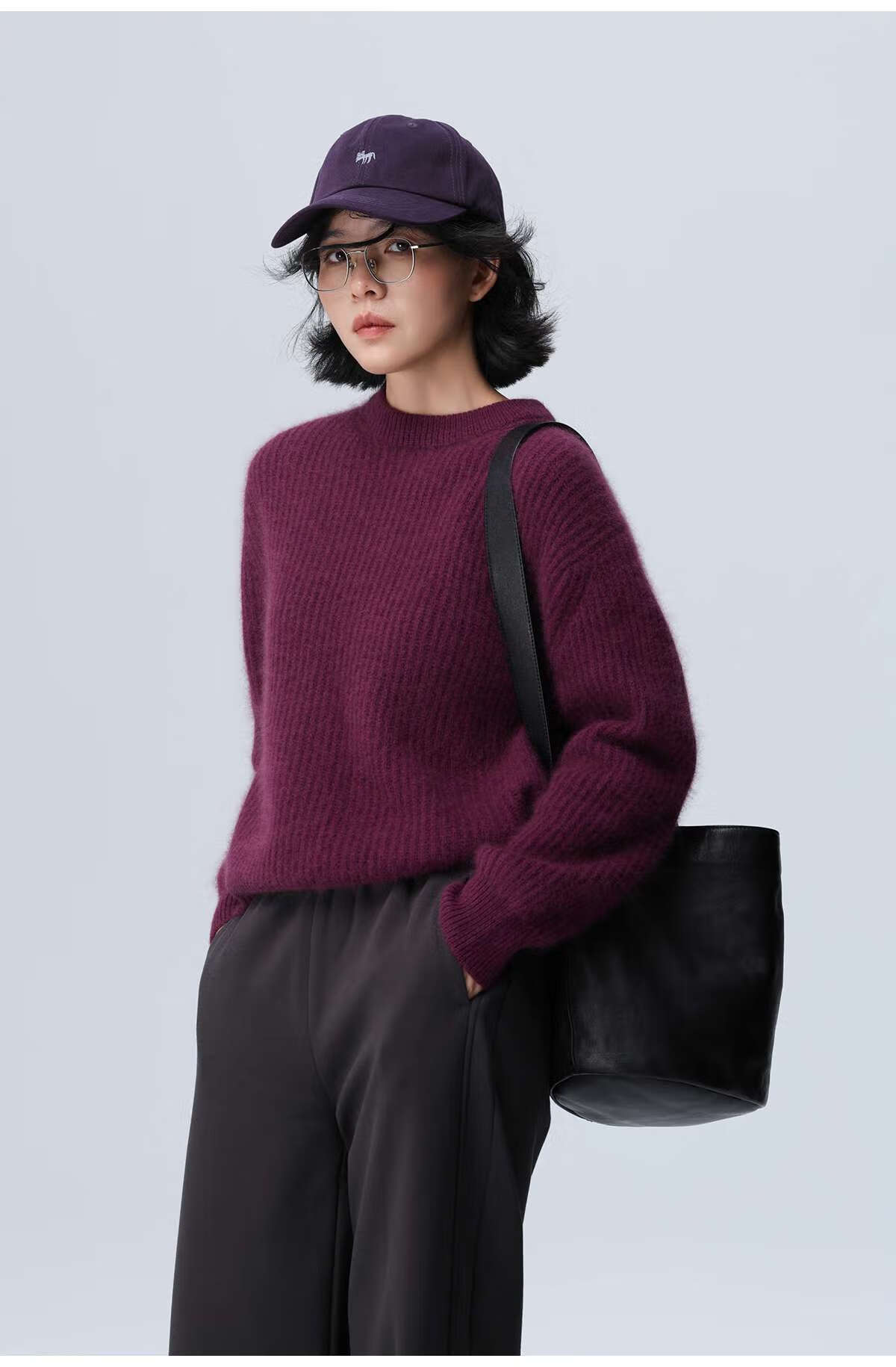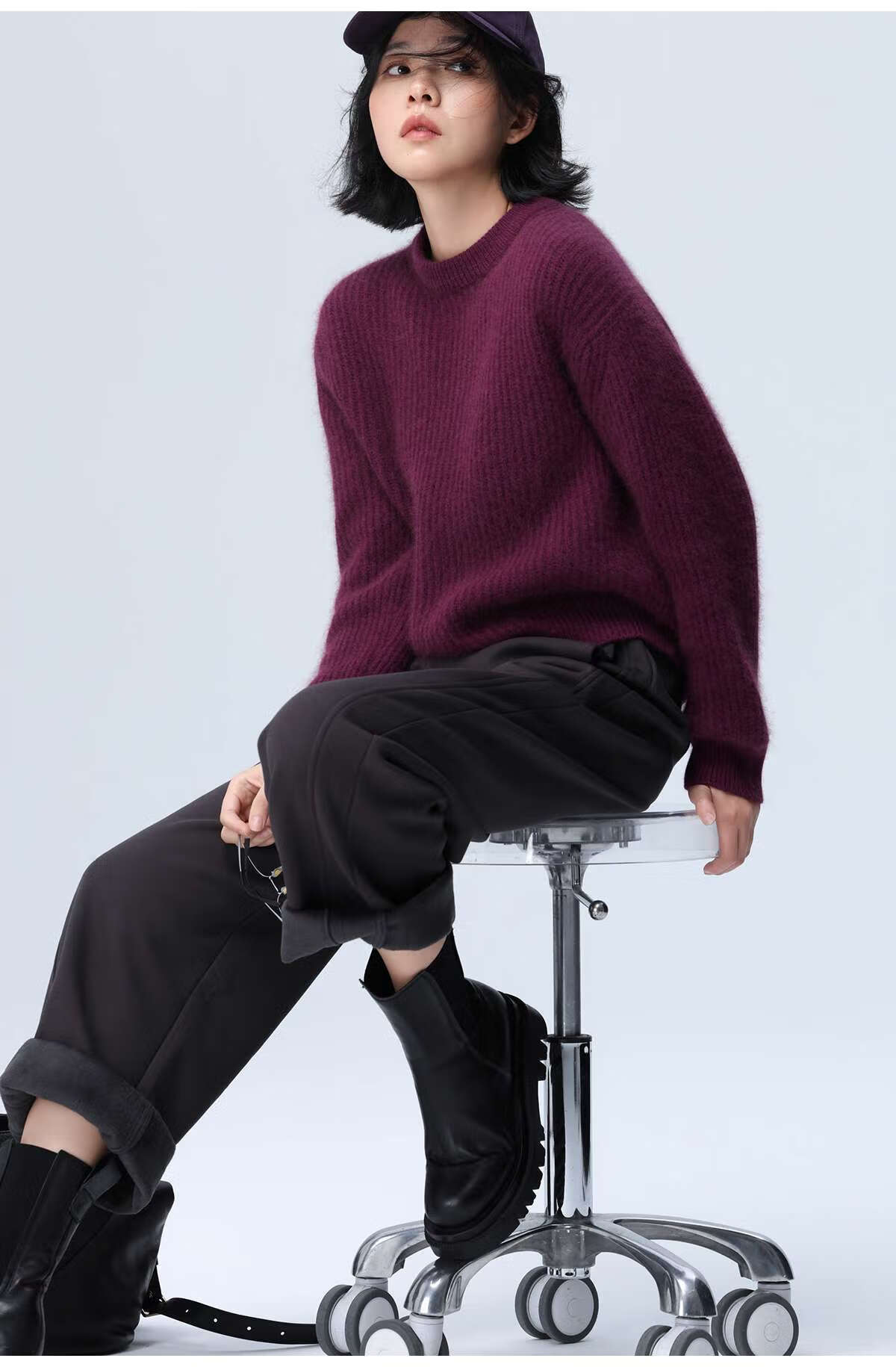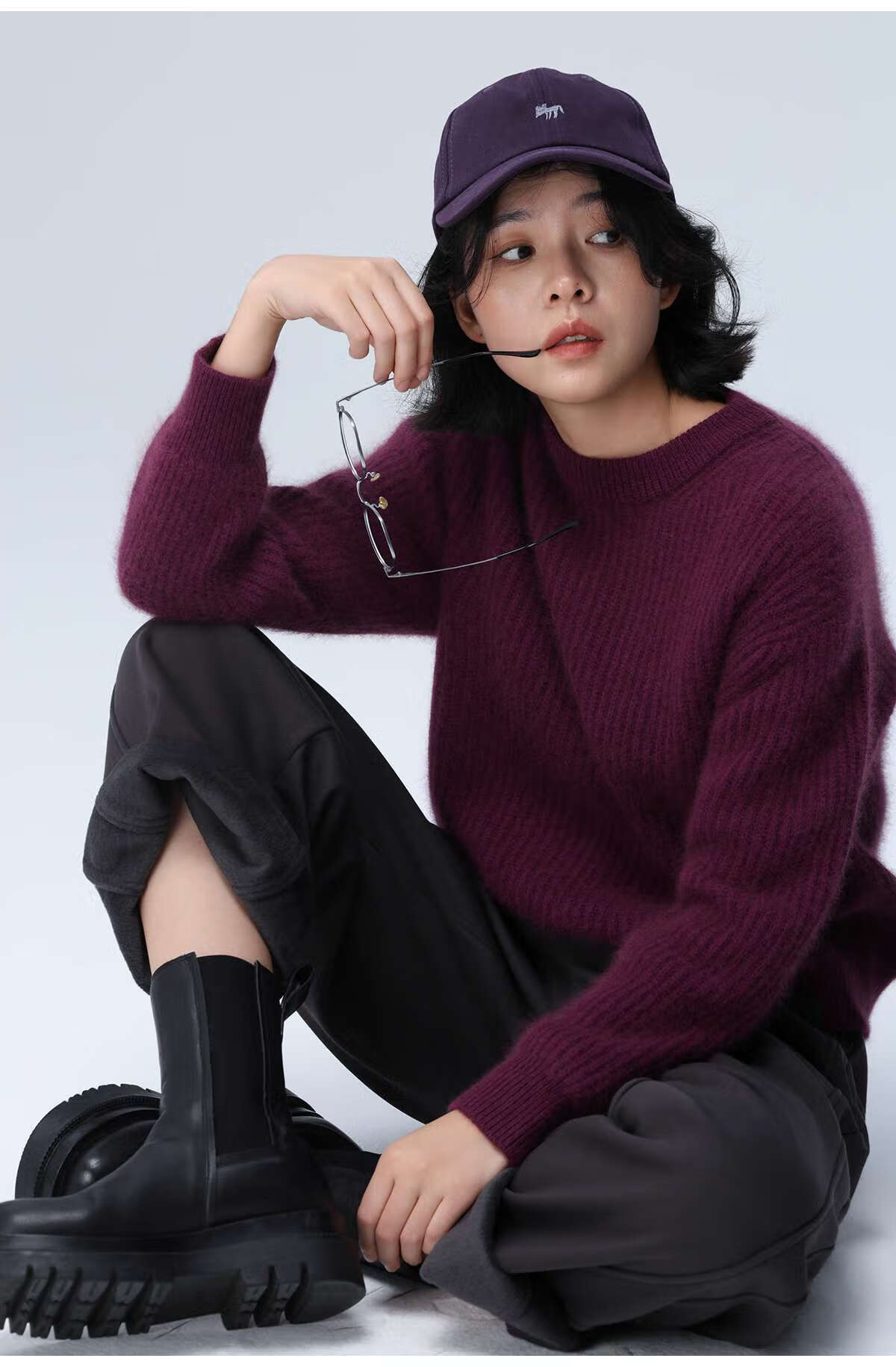 Xingshi WeTHEE high-end thickened raccoon velvet small round neck vertical stripe slightly loose pullover sweater for women, prune purple, one size
