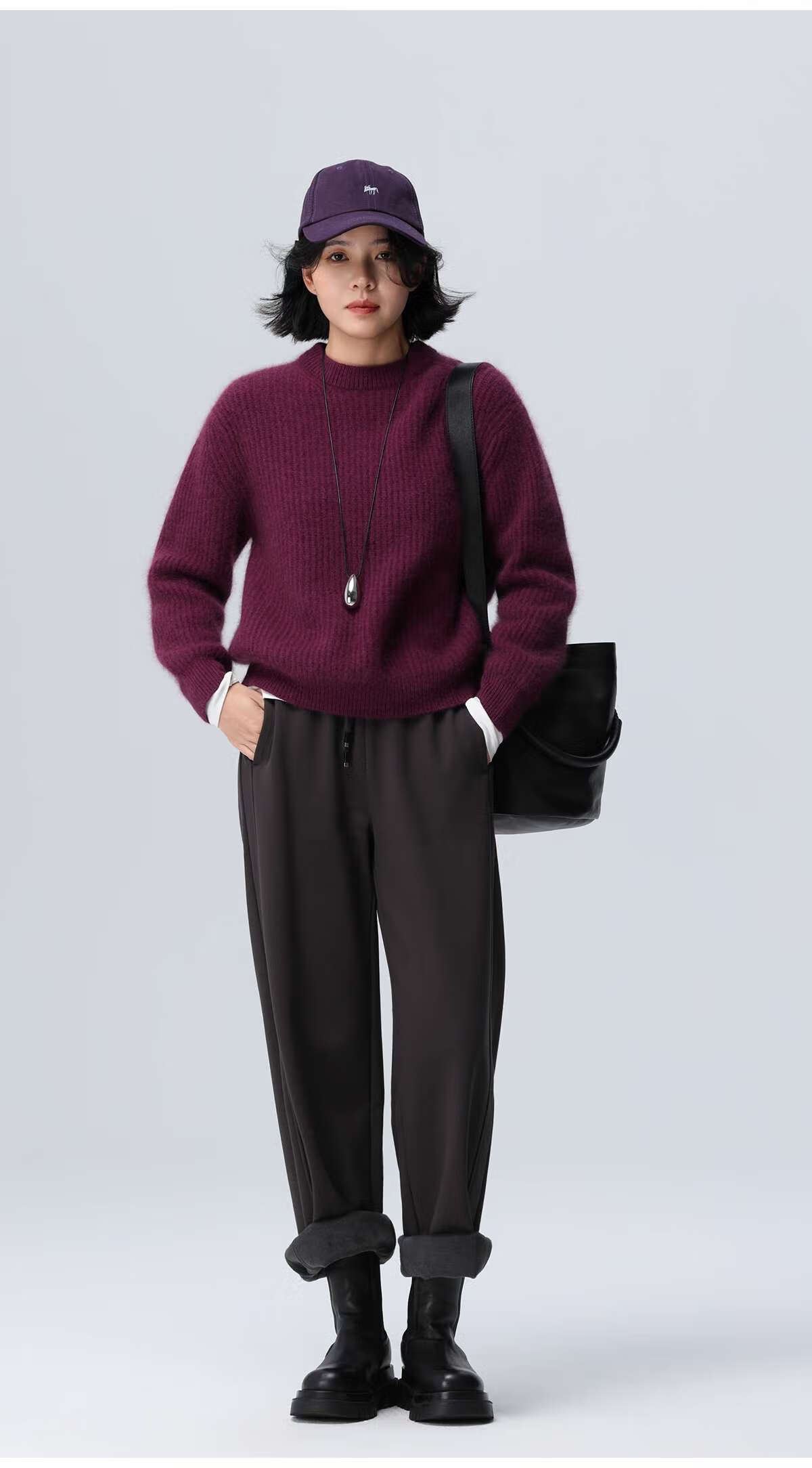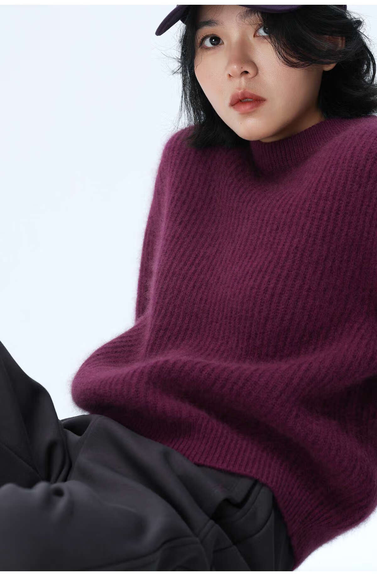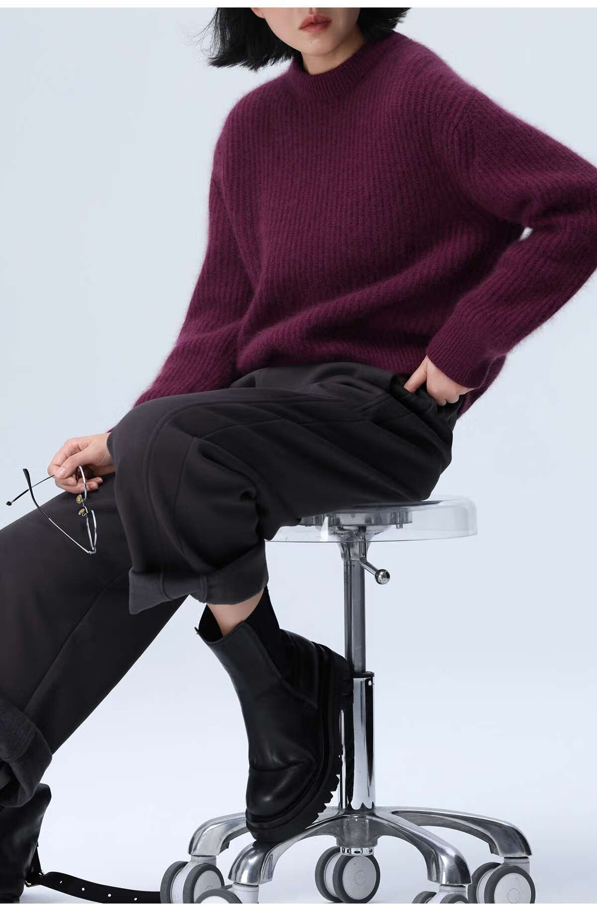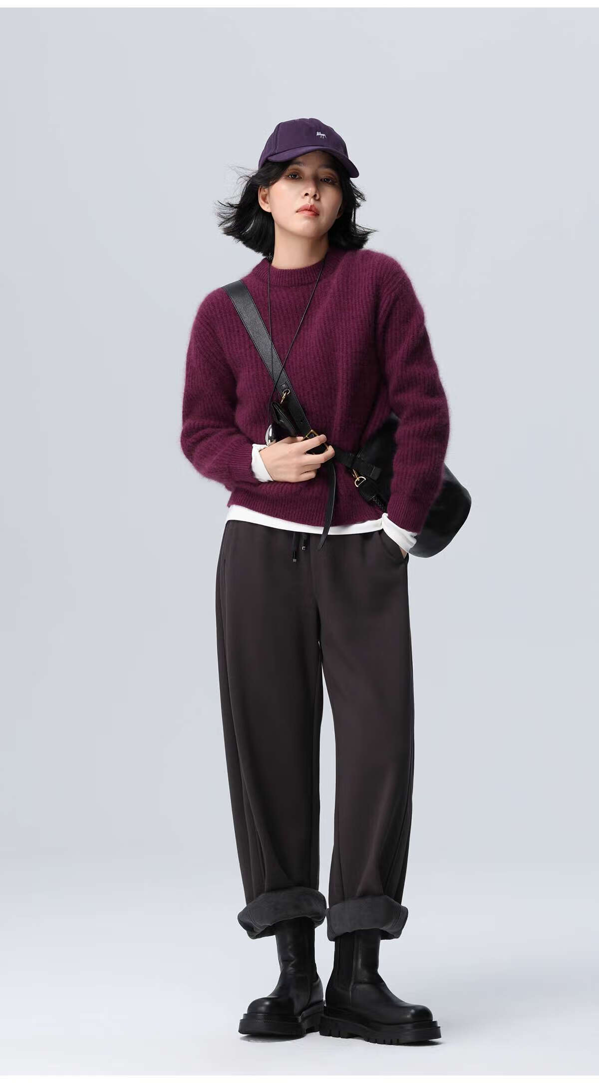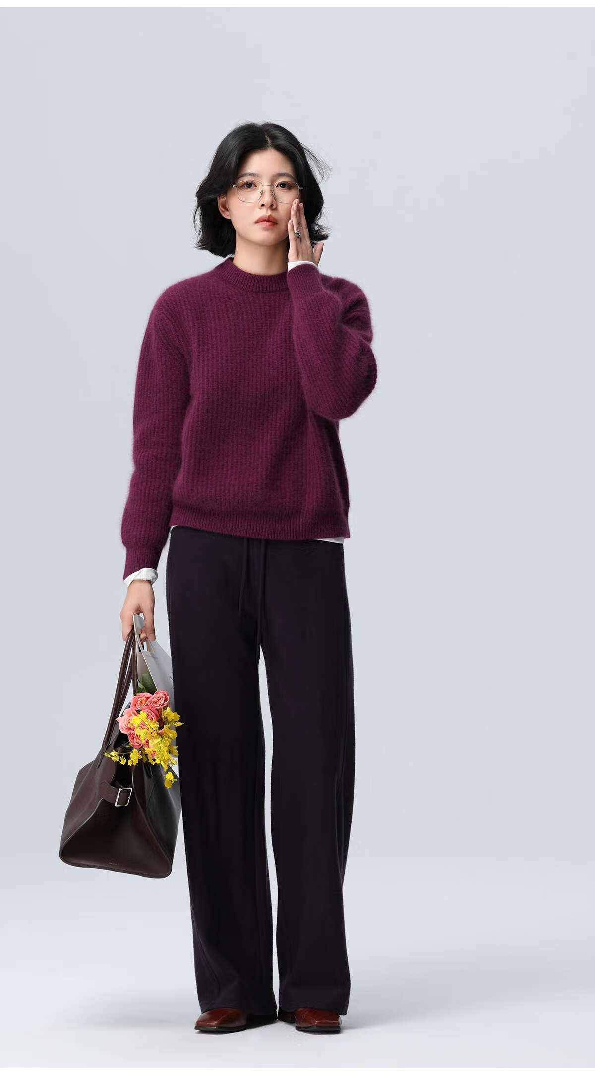 Xingshi WeTHEE high-end thickened raccoon velvet small round neck vertical stripe slightly loose pullover sweater for women, prune purple, one size