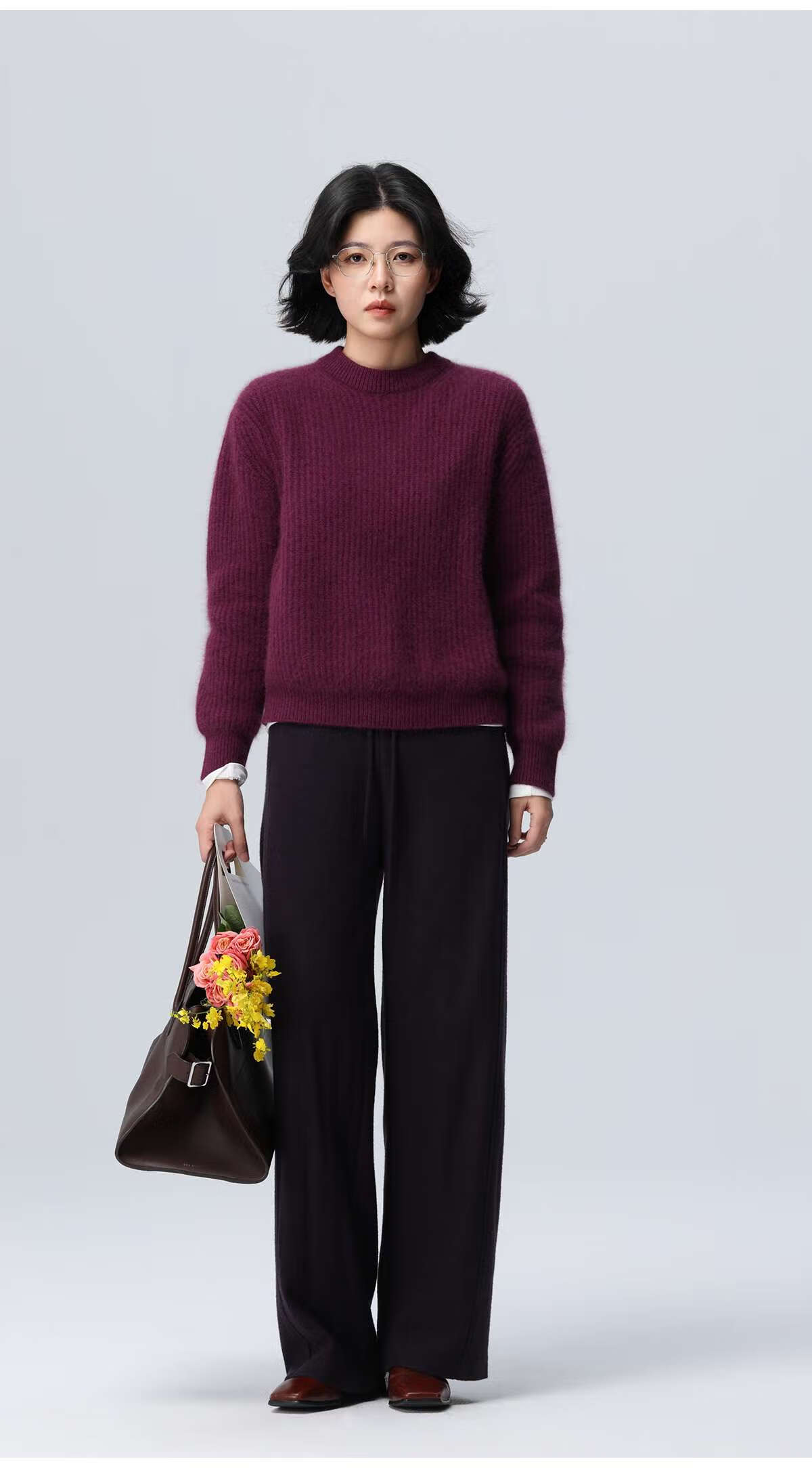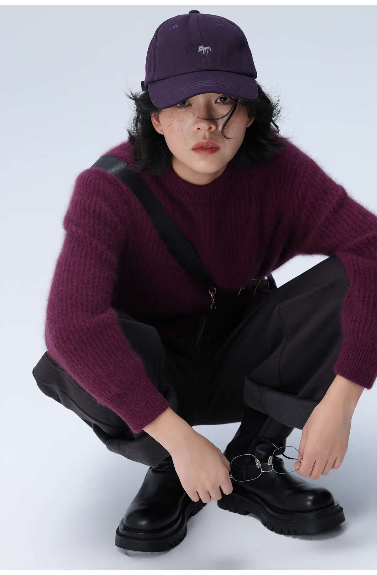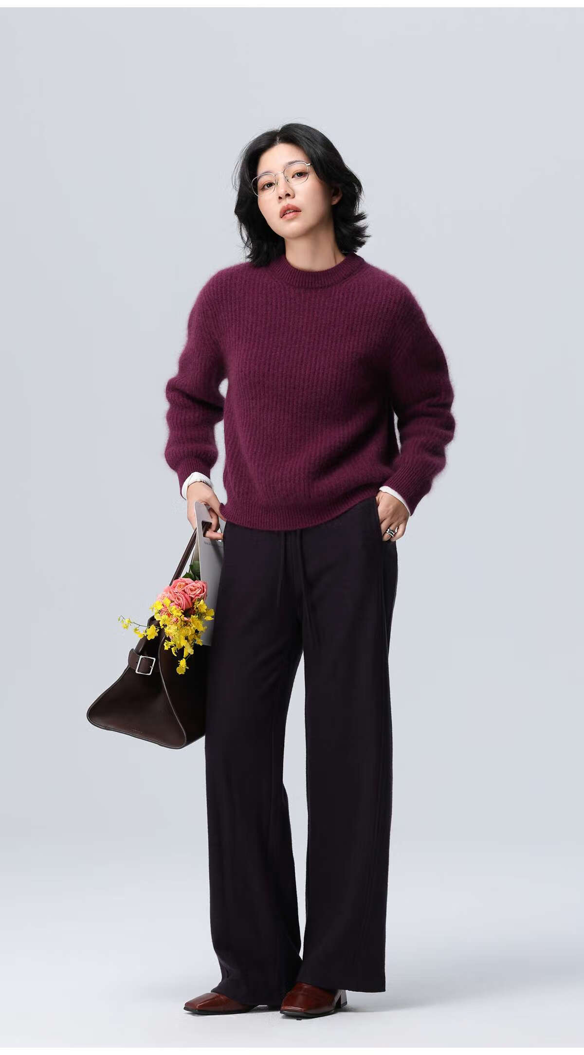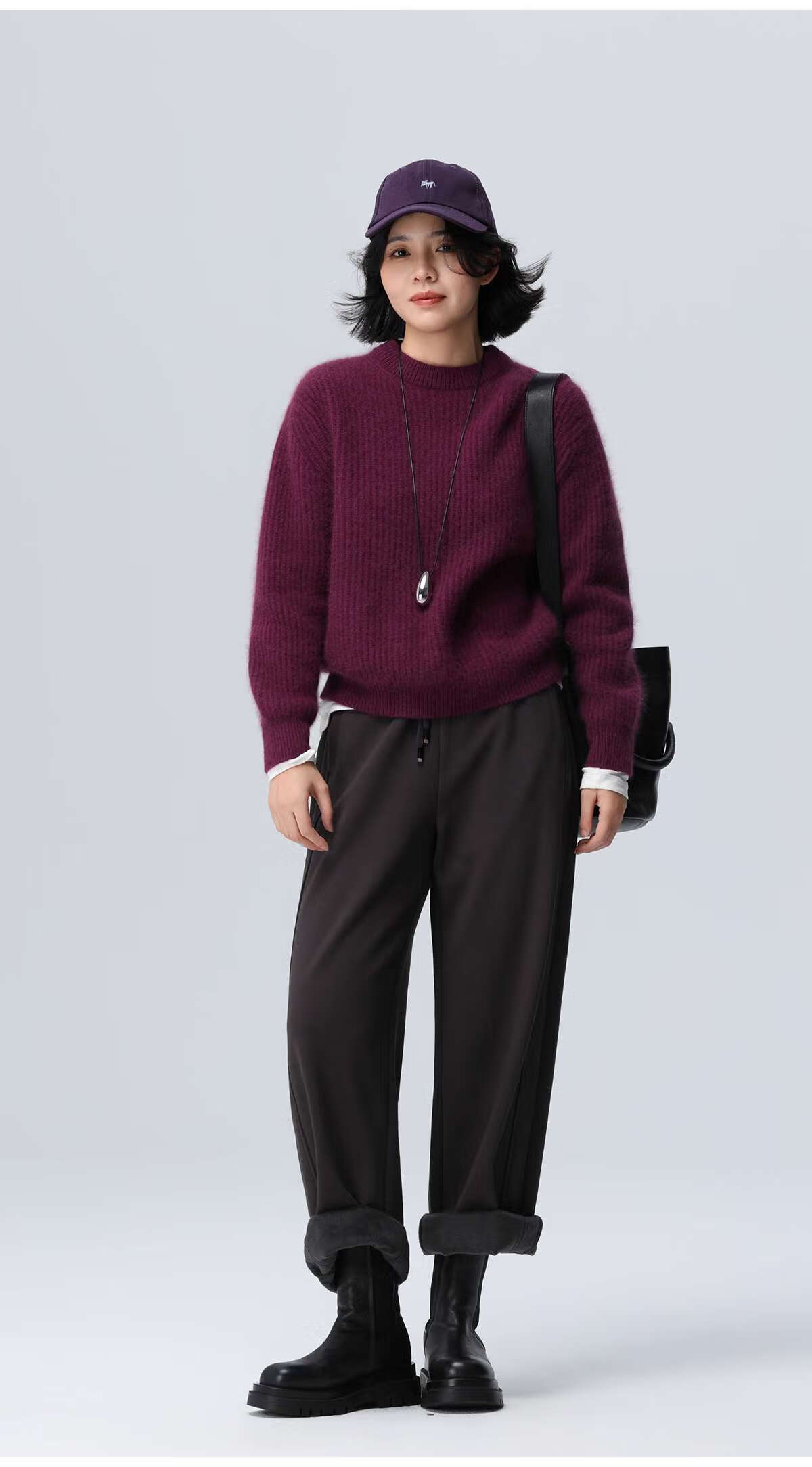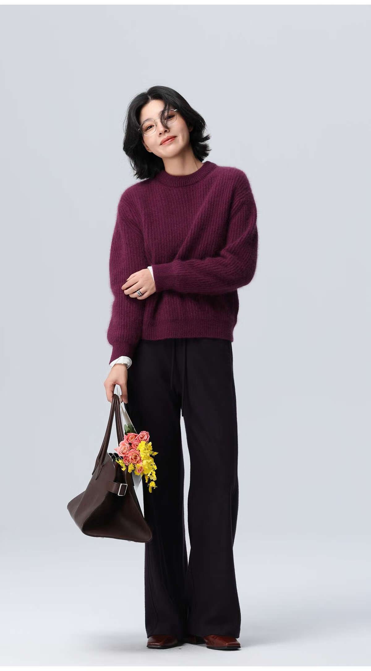 Xingshi WeTHEE high-end thickened raccoon velvet small round neck vertical stripe slightly loose pullover sweater for women, prune purple, one size