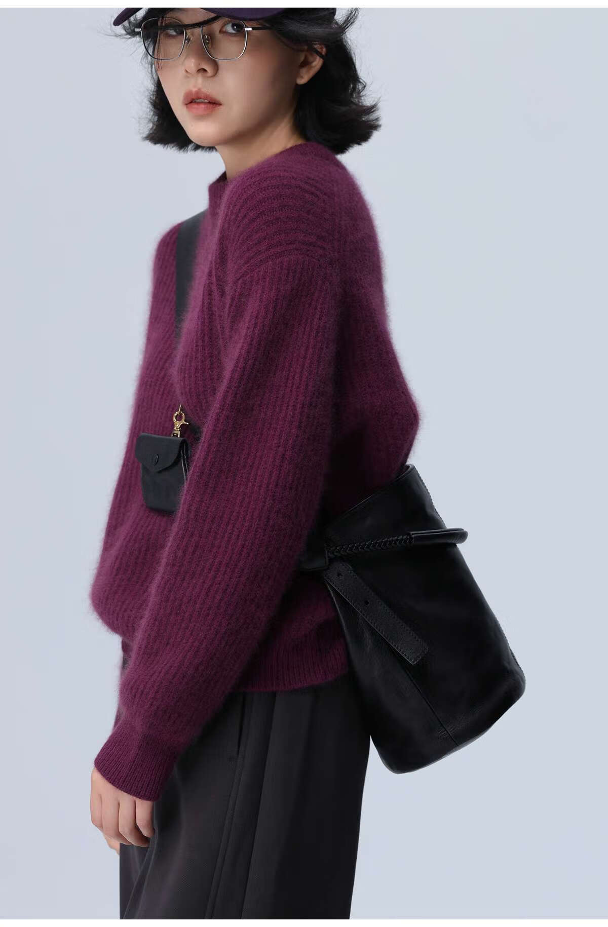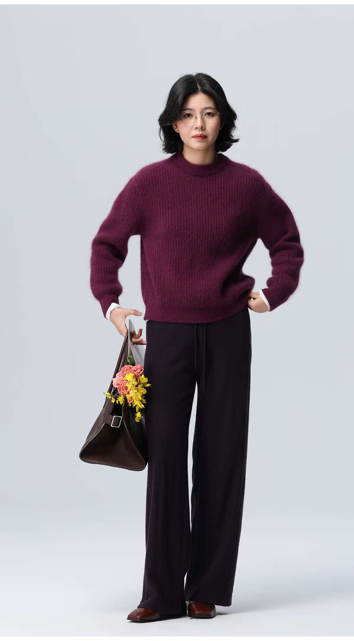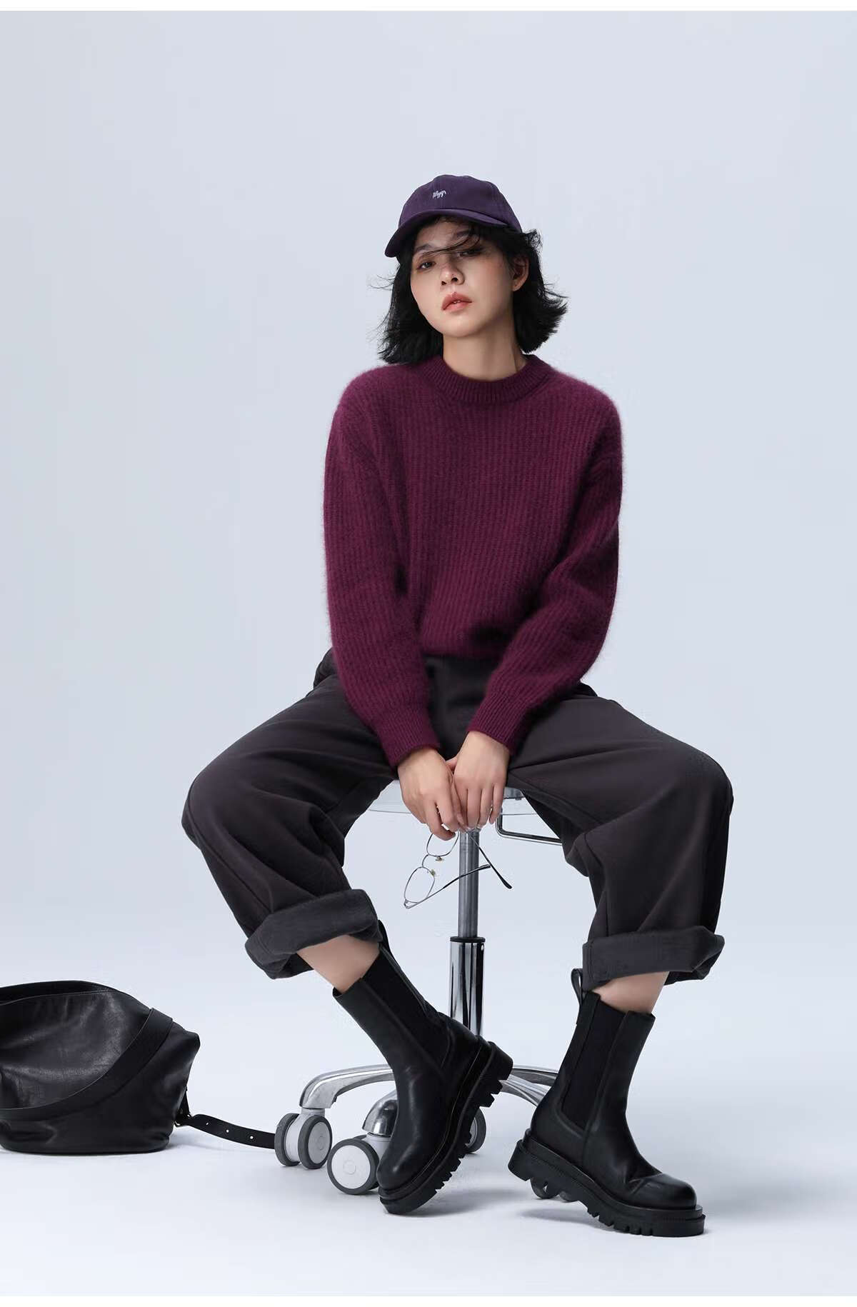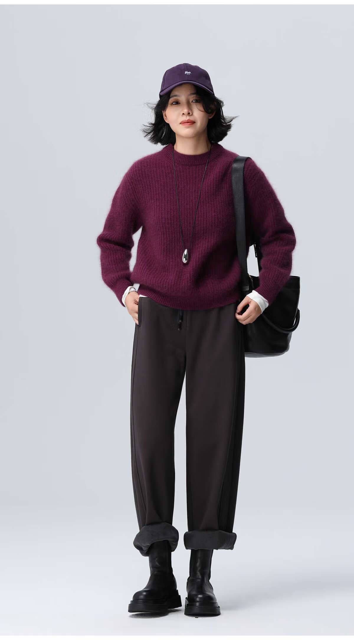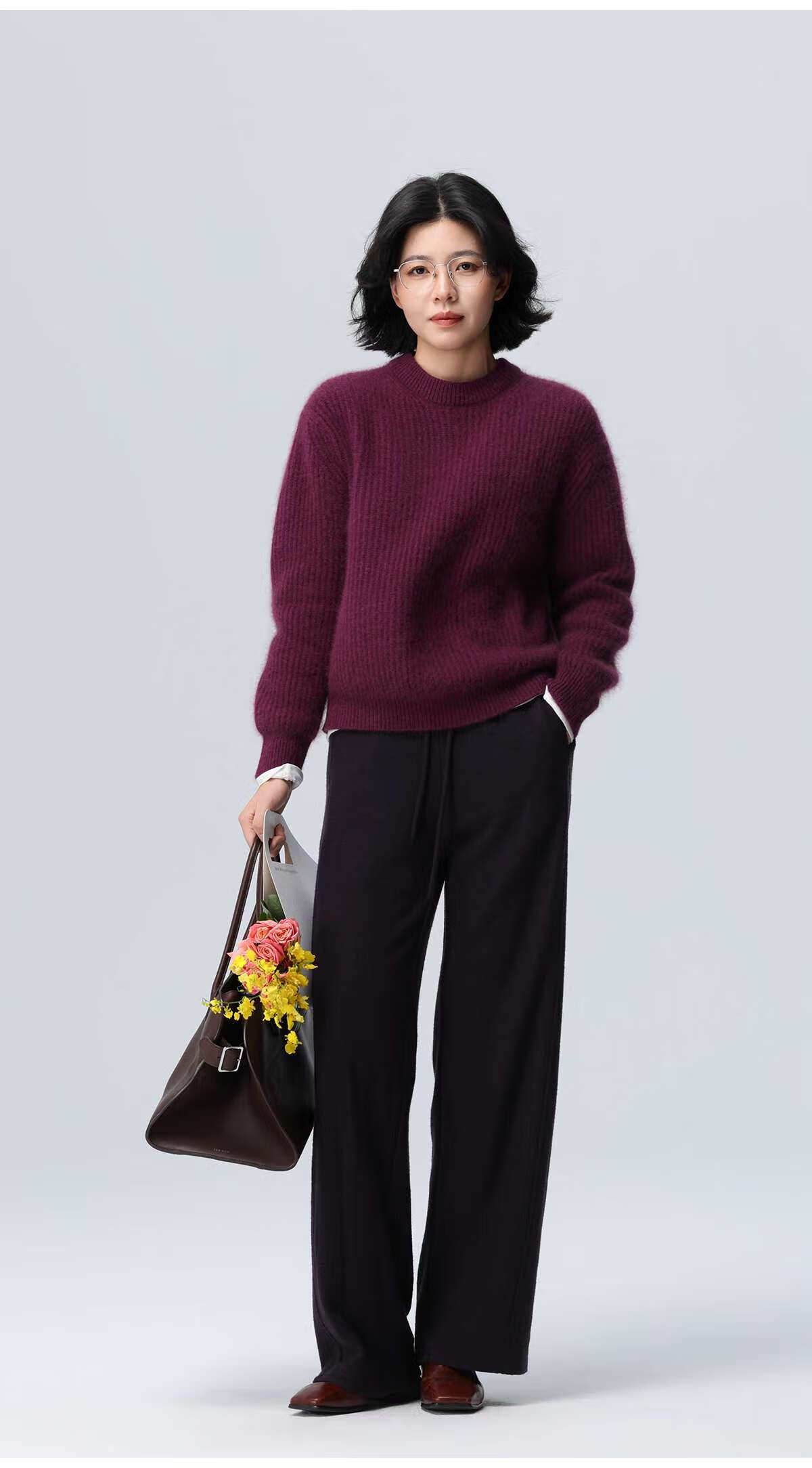 Xingshi WeTHEE high-end thickened raccoon velvet small round neck vertical stripe slightly loose pullover sweater for women, prune purple, one size