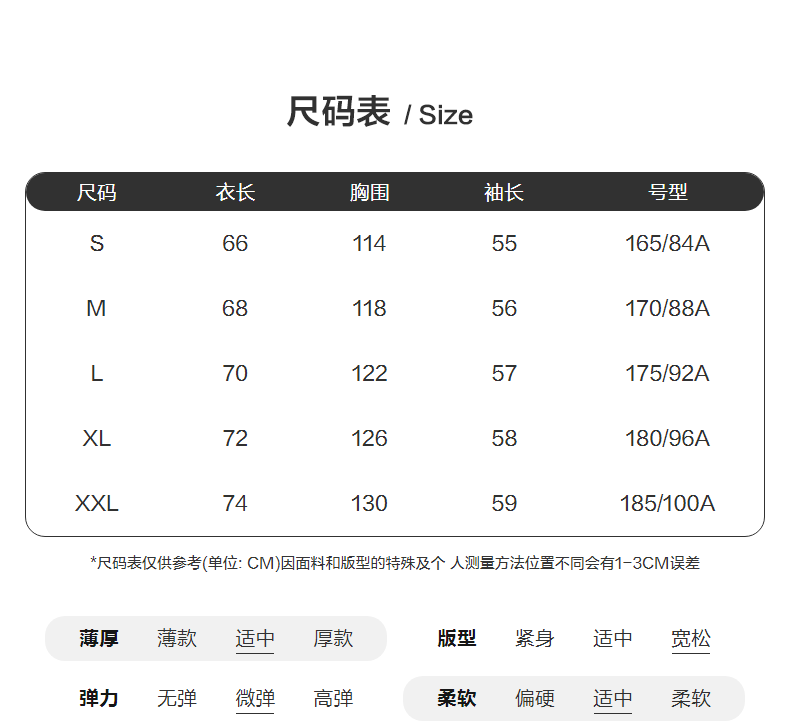 China (cm) 160-165/84-86 165-170 / 88-90 167-172 / 92-96 168-173 / 98-102 170-176 / 106-110