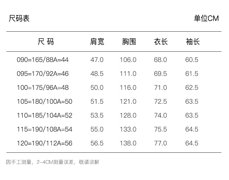 China (cm) 160-165/84-86 165-170 / 88-90 167-172 / 92-96 168-173 / 98-102 170-176 / 106-110
