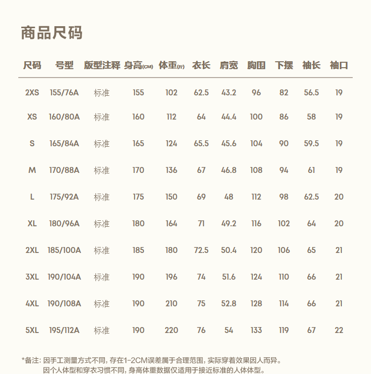 China (cm) 165 / 88-90 170 / 96-98 175 / 108-110 180 / 118-122 185 / 126-130