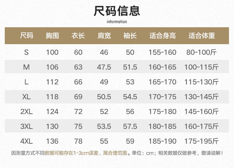 China (cm) 165 / 88-90 170 / 96-98 175 / 108-110 180 / 118-122 185 / 126-130