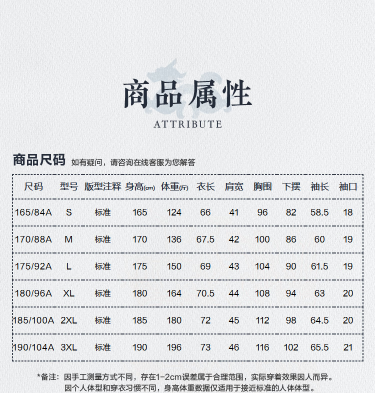 China (cm) 165 / 88-90 170 / 96-98 175 / 108-110 180 / 118-122 185 / 126-130