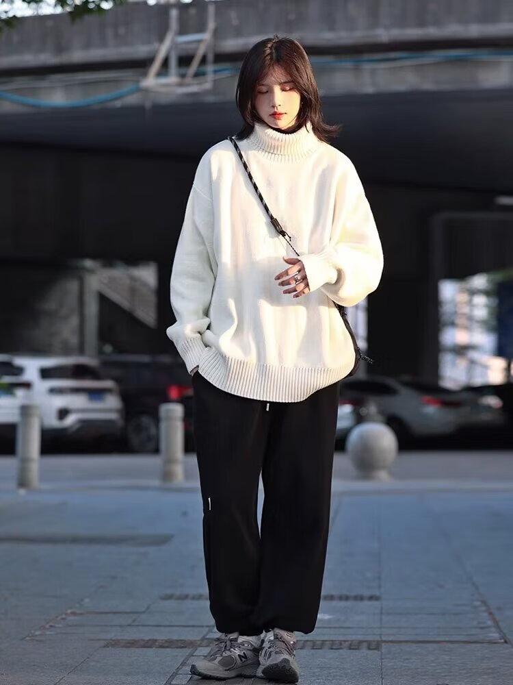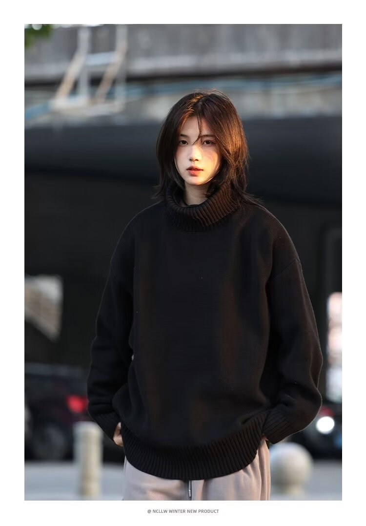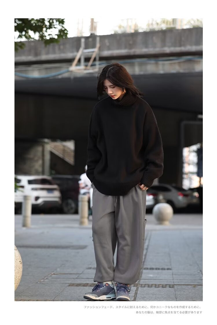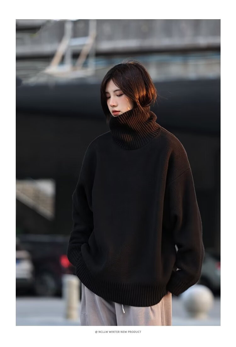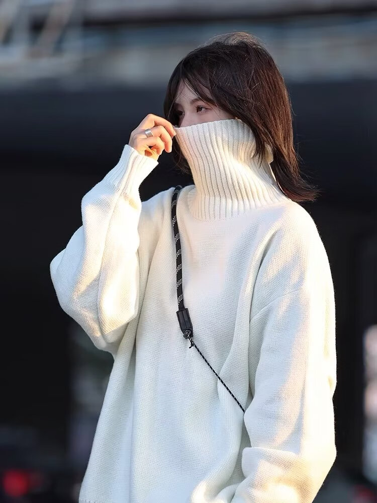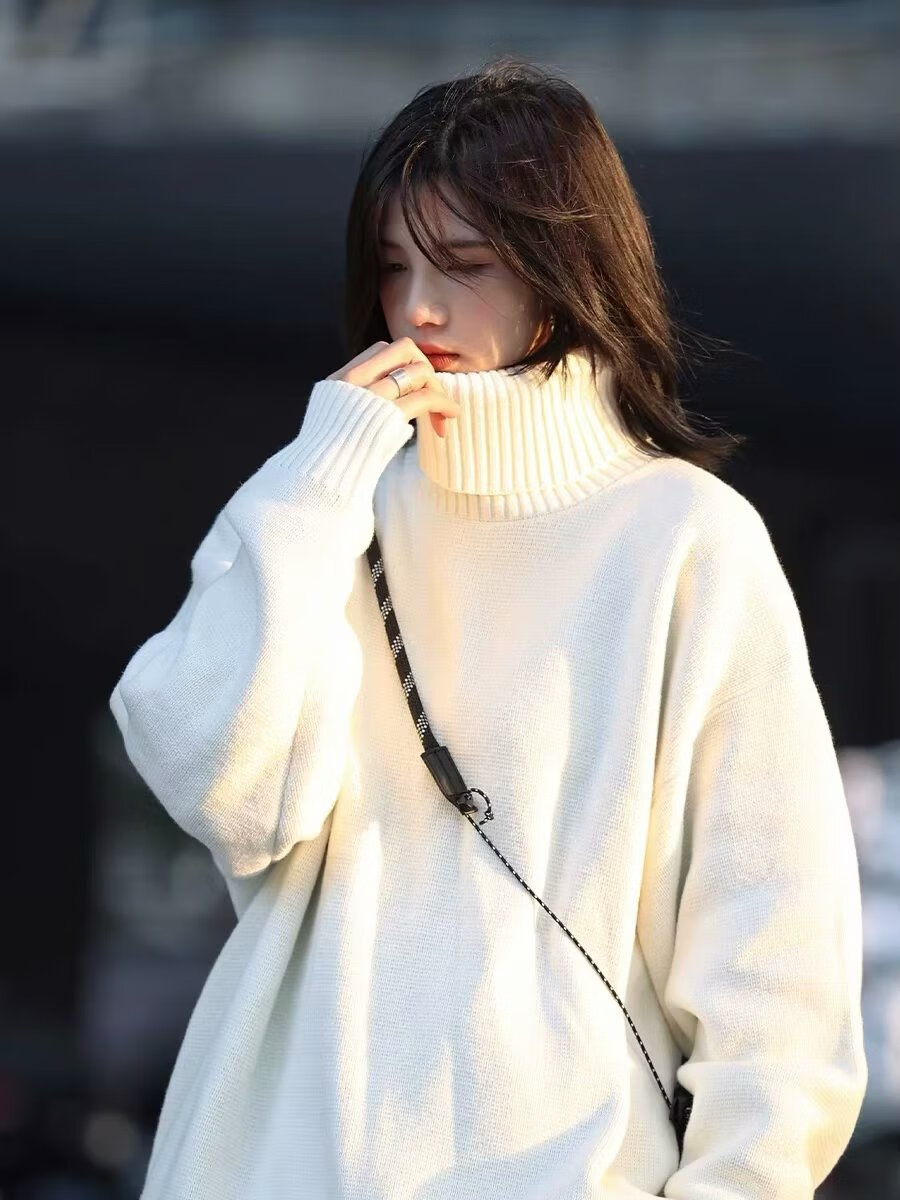 POUM turtleneck sweater for men and women, spring and autumn loose knitted sweater for men, retro lazy solid color bottoming shirt SM-003 white XL recommended 110-140Jin Jin equals 0.5 kg