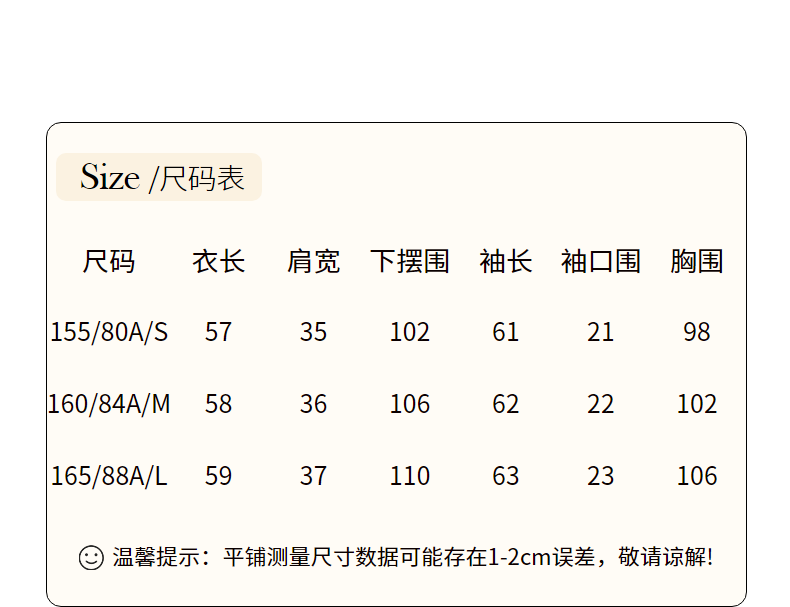 China (cm) 160-165/84-86 165-170 / 88-90 167-172 / 92-96 168-173 / 98-102 170-176 / 106-110