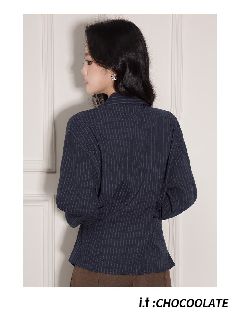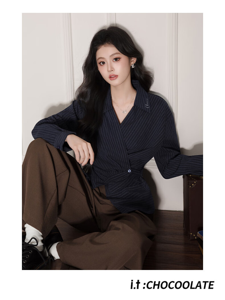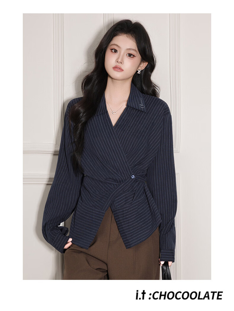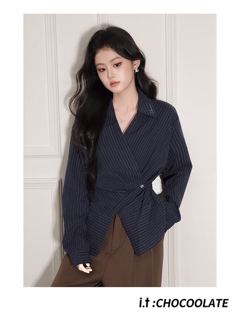 CHOCOOLATE it women's fashionable V-neck striped long-sleeved shirt women's autumn and winter new waist slimming design top navy blue S