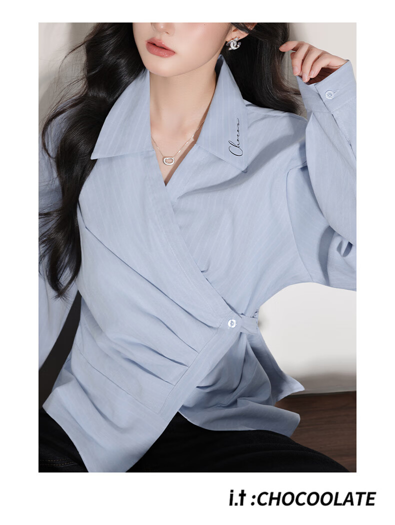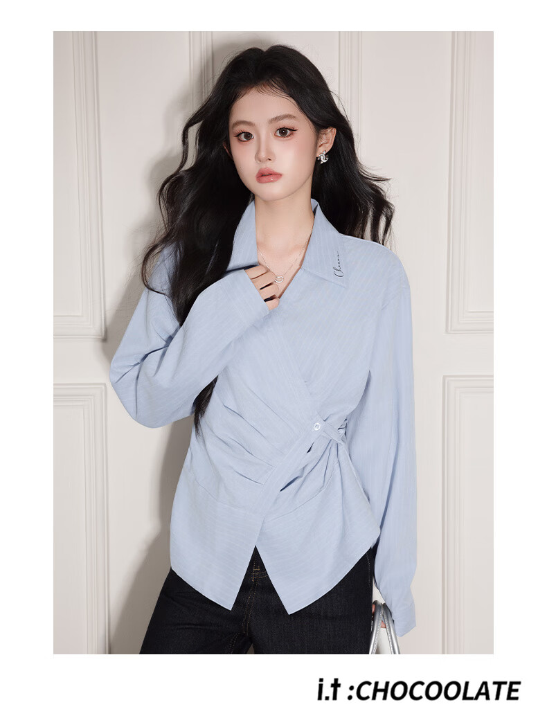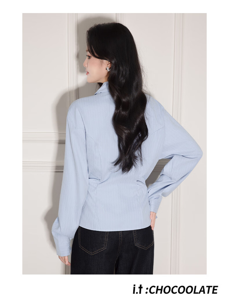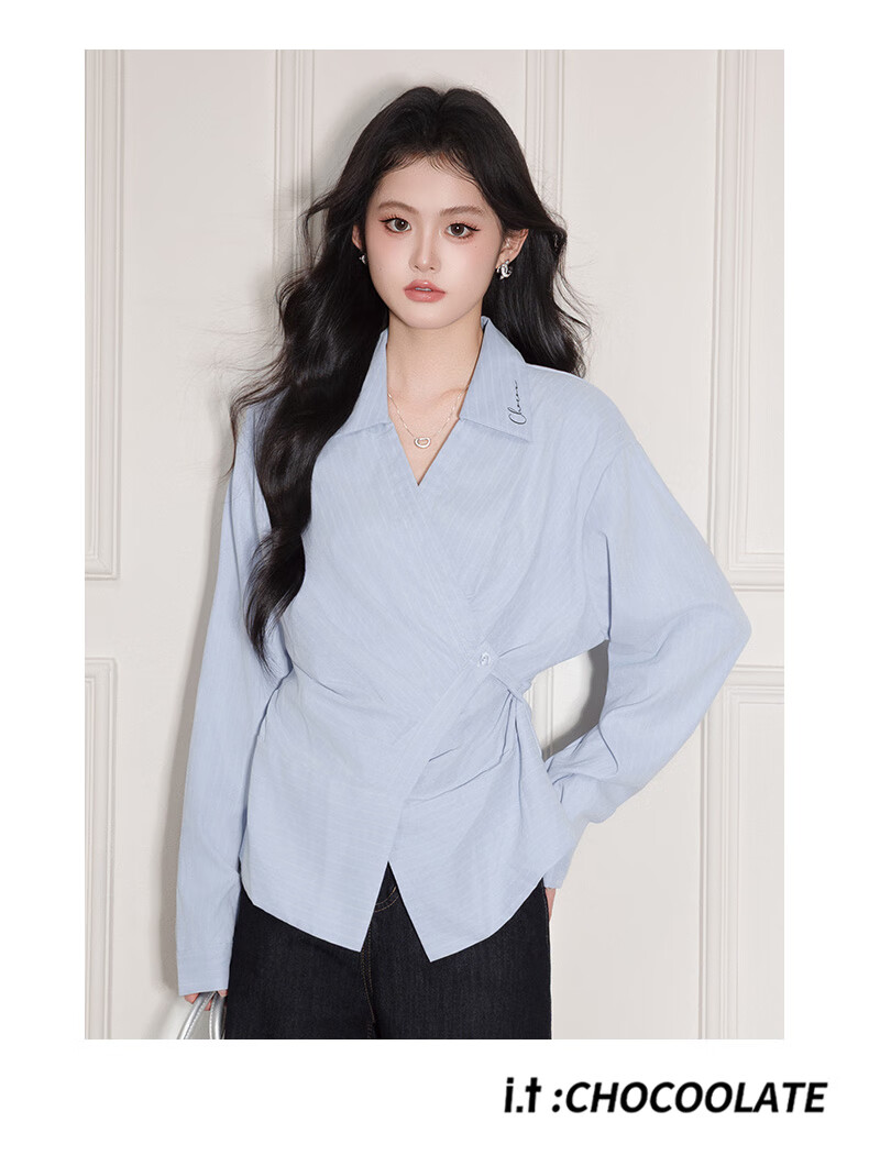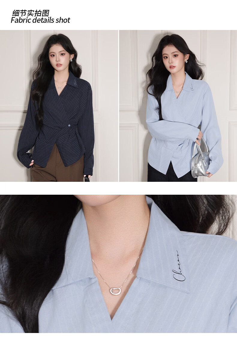 CHOCOOLATE it women's fashionable V-neck striped long-sleeved shirt women's autumn and winter new waist slimming design top navy blue S