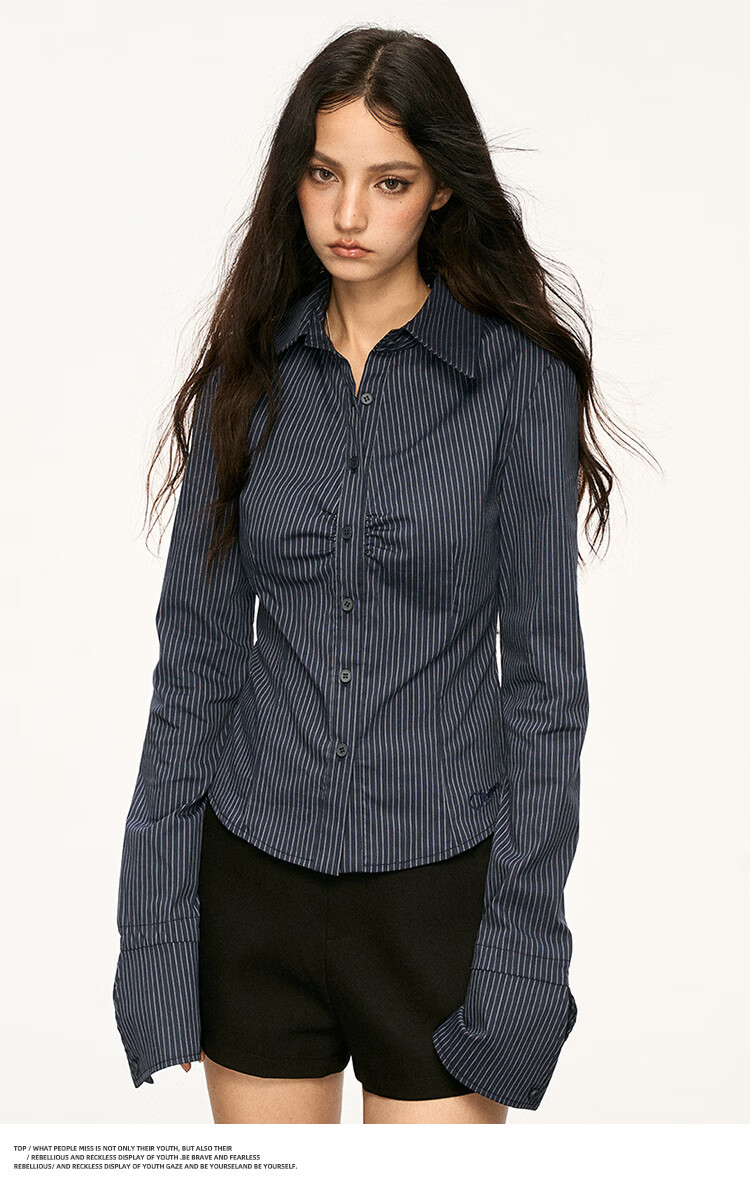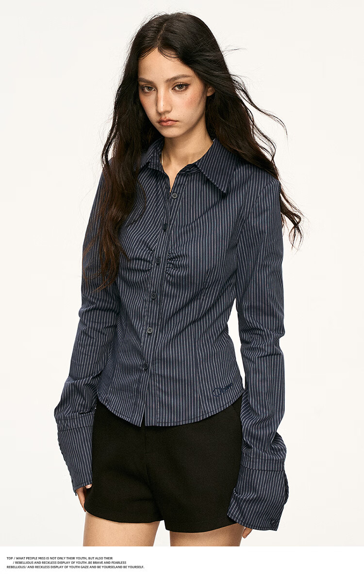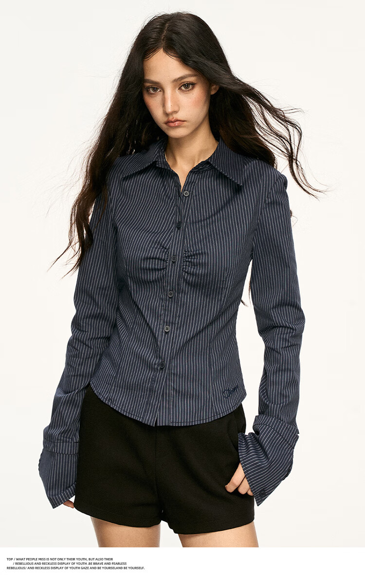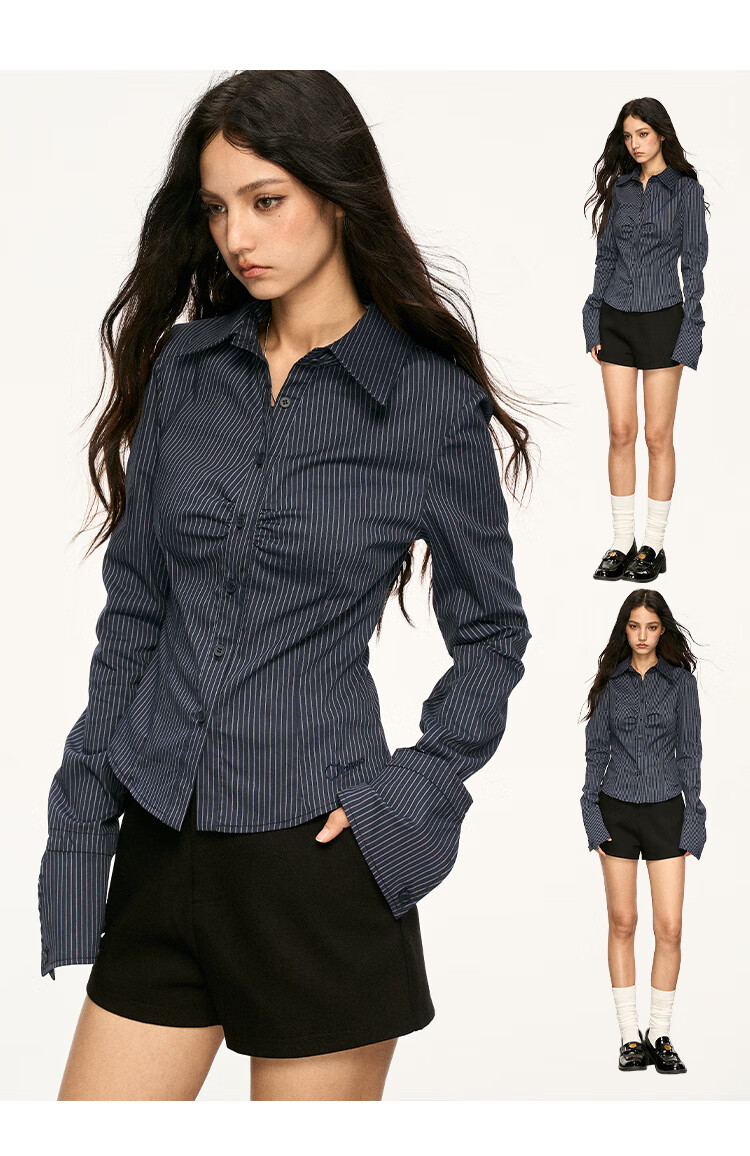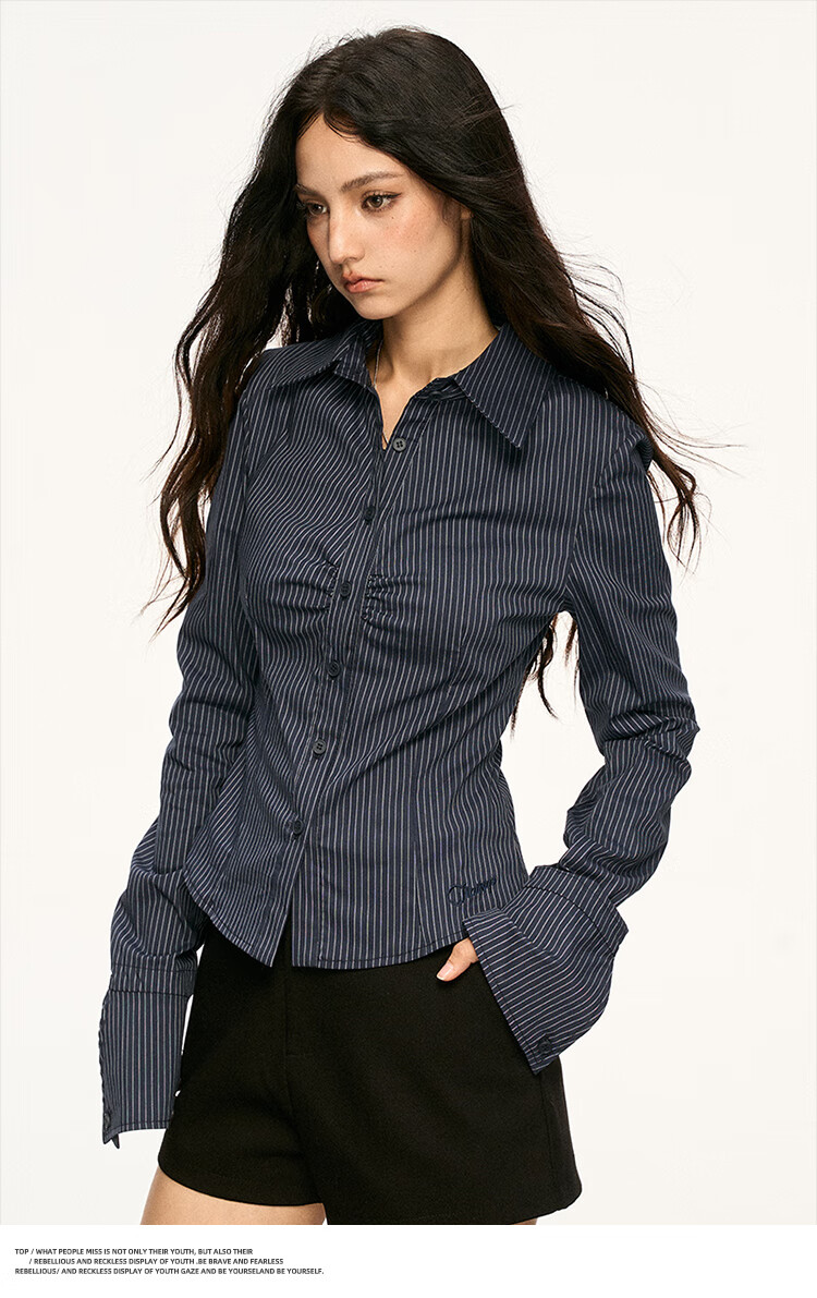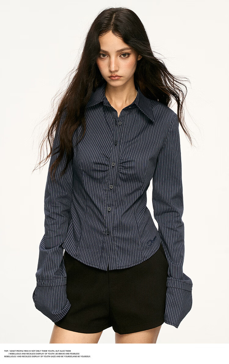 AAISUP American Striped Waist Long Sleeve Shirt Women's 2025 Spring and Autumn Design Hot Girl Slim Fit Bottoming Top Trendy Navy L