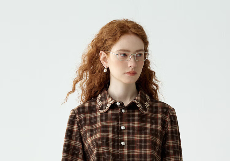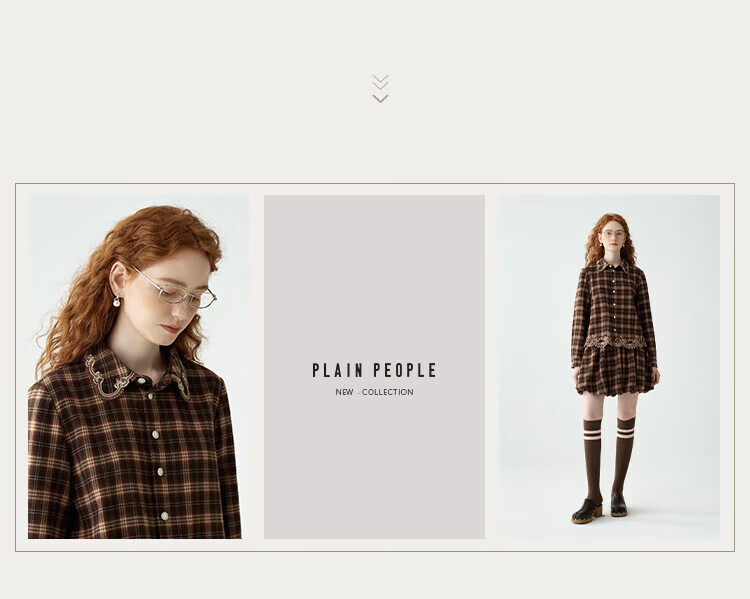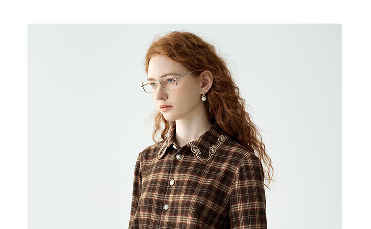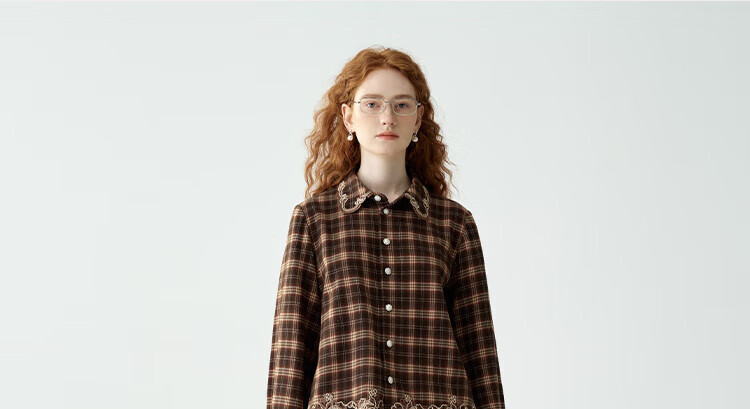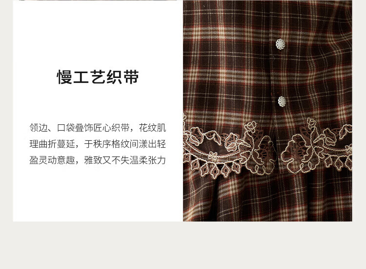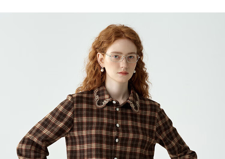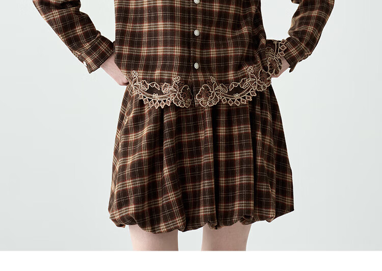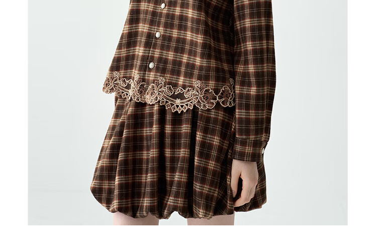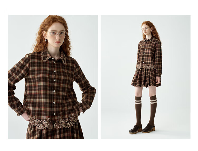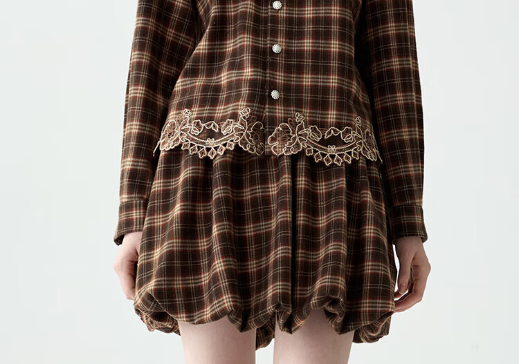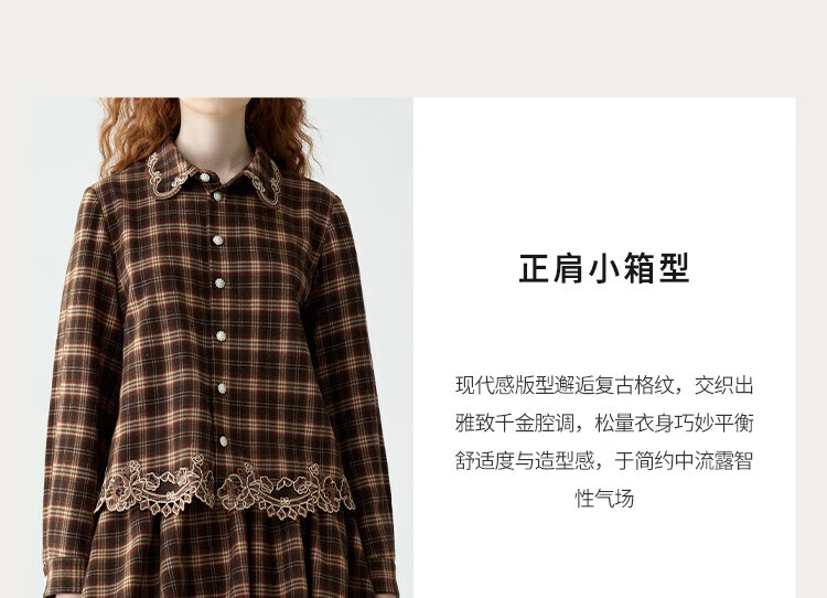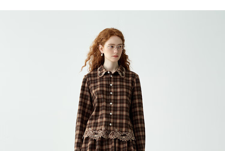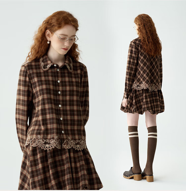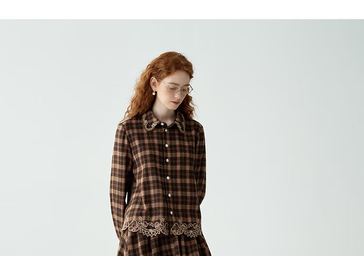 PLAIN PEOPLE Bath style retro college plaid lace webbing shirt top women 2025 winter new style coffee color S