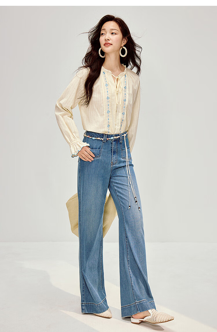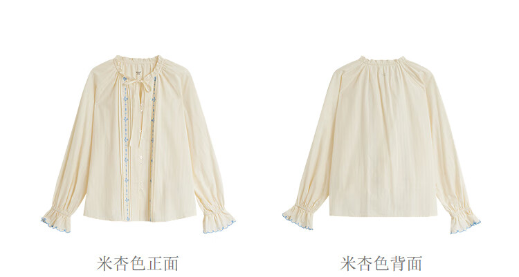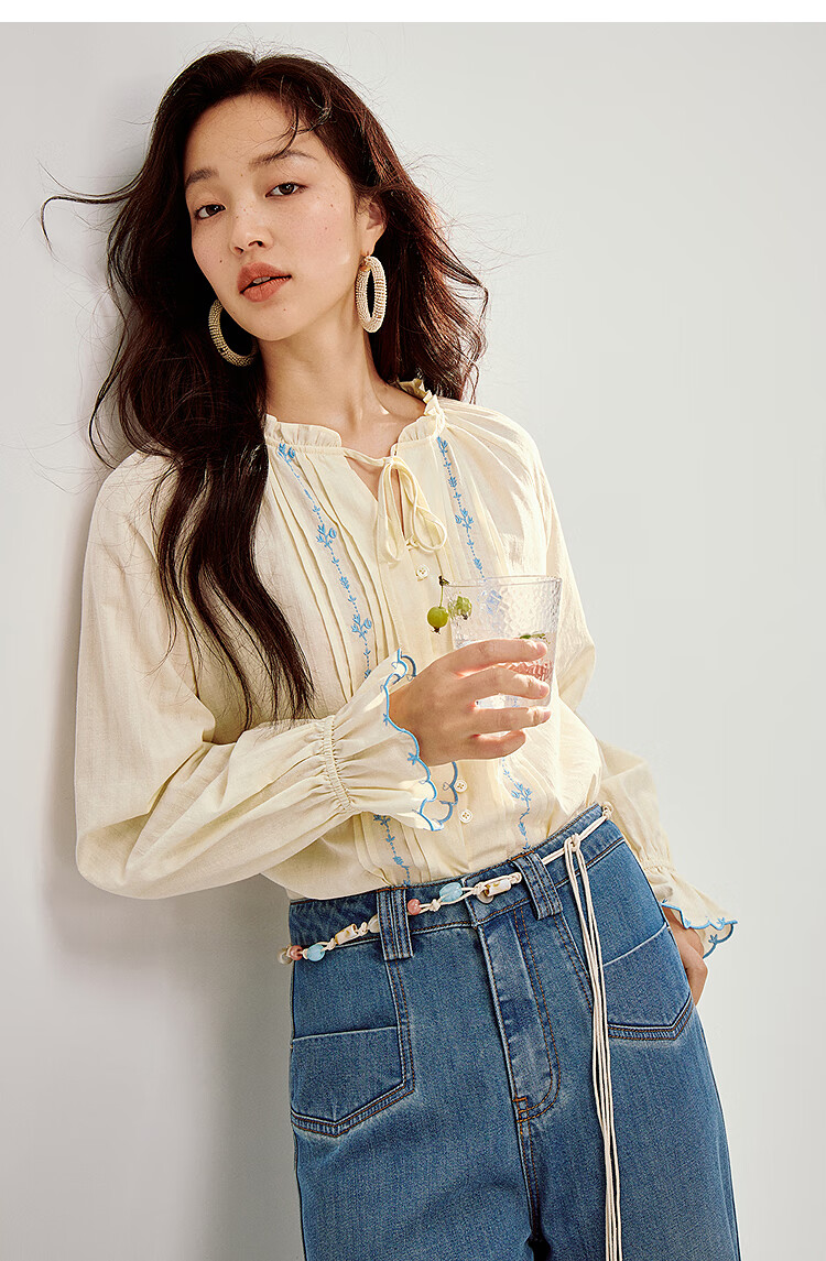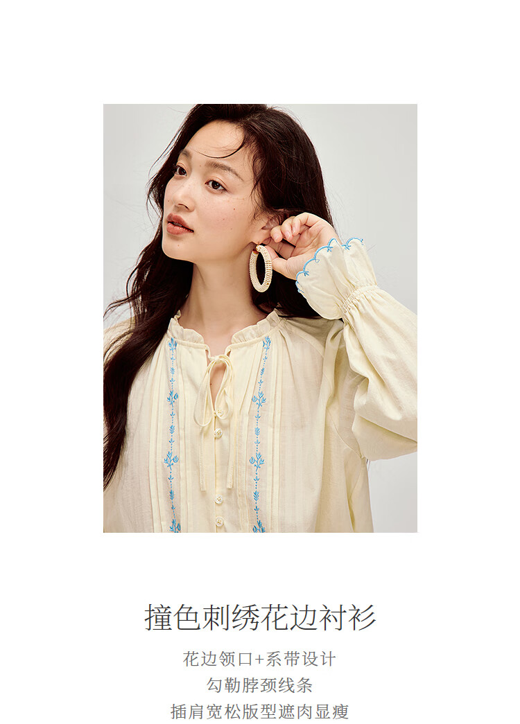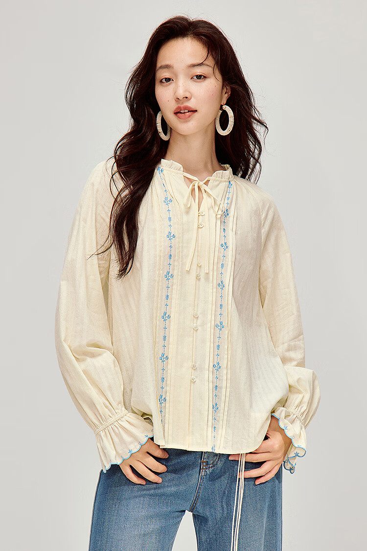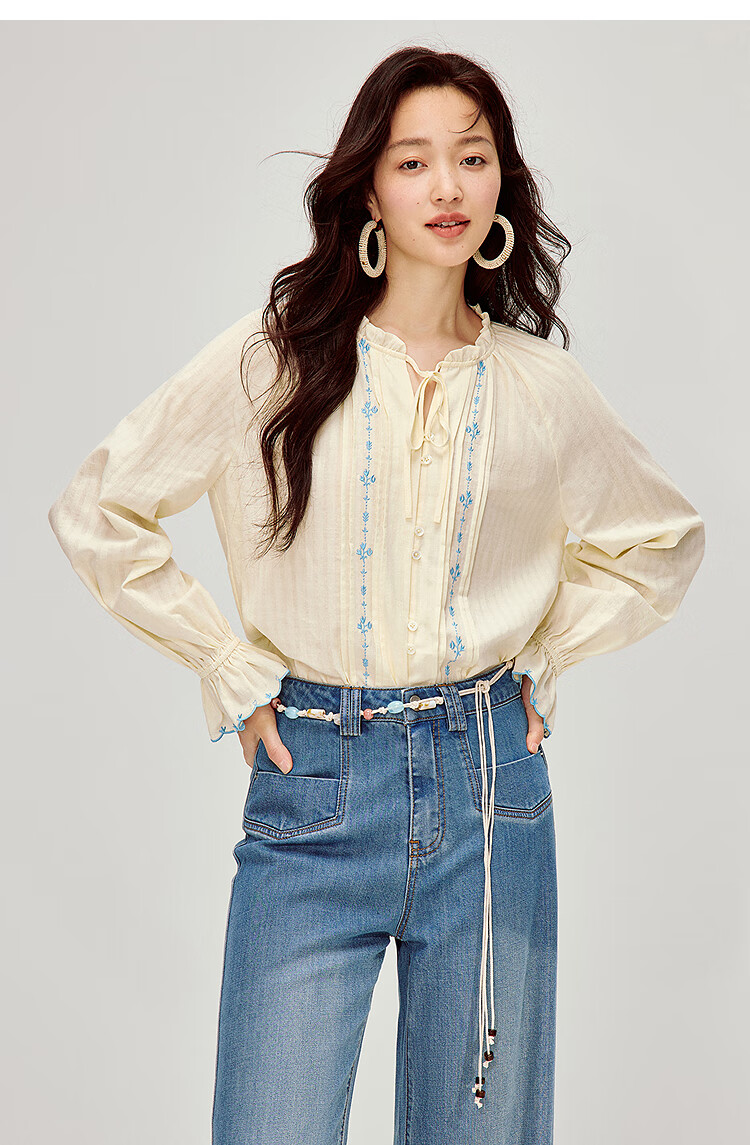INMAN contrast embroidered lace temperament shirt 2026 spring women's new style simple commuting loose long-sleeved shirt beige M