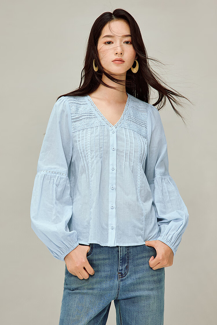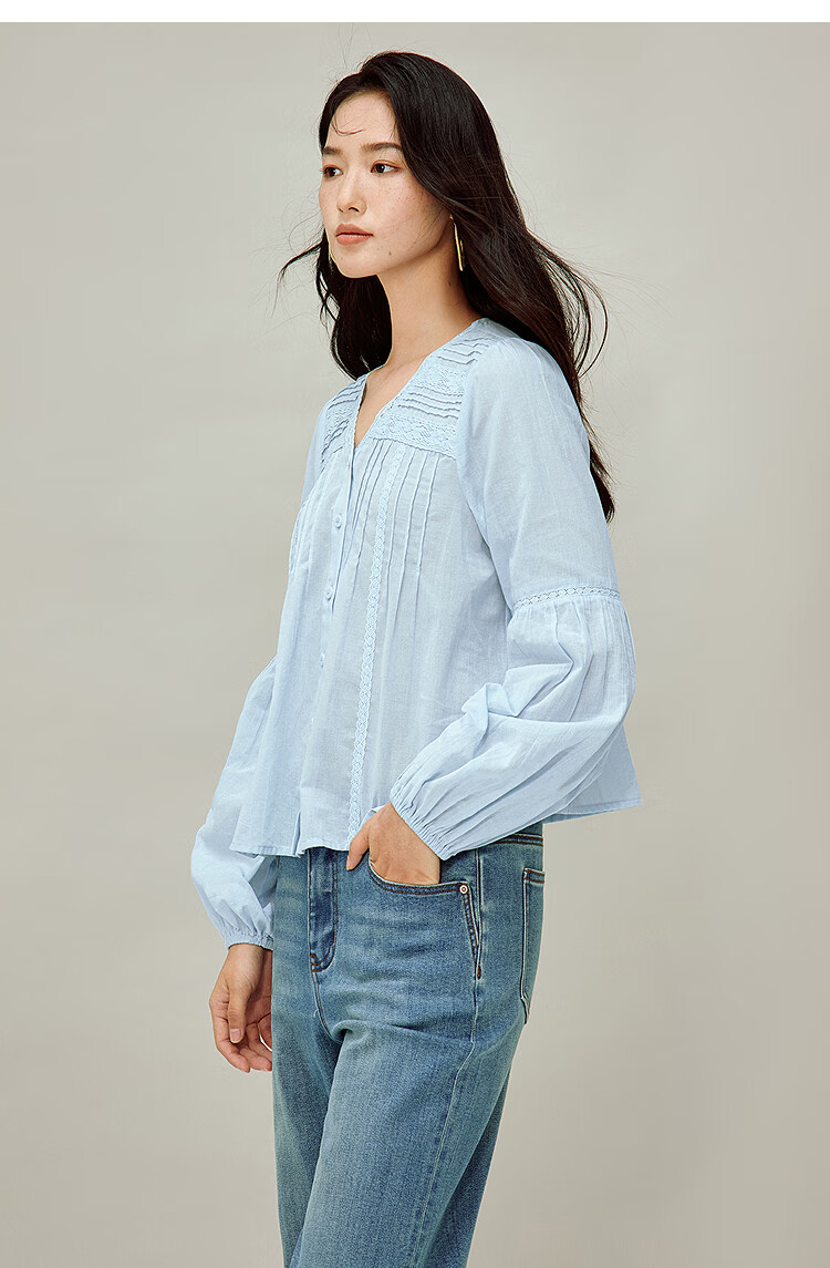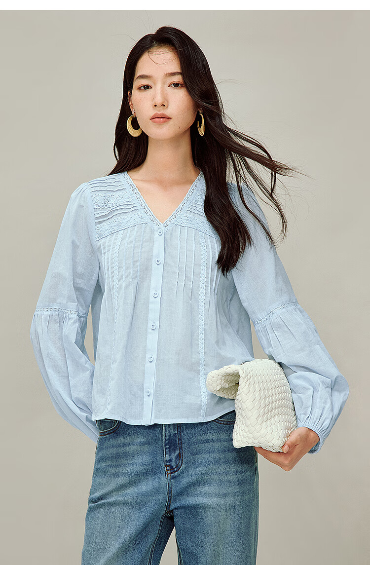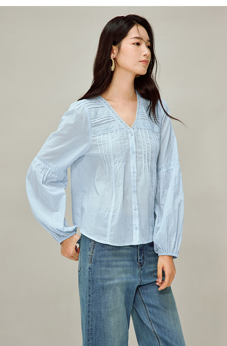 INMAN Lace V-neck Shirt 2026 Spring Women's New Lantern Sleeve Loose Shirt Top Light Blue XL