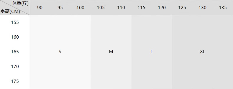 China (cm) 160-165/84-86 165-170 / 88-90 167-172 / 92-96 168-173 / 98-102 170-176 / 106-110