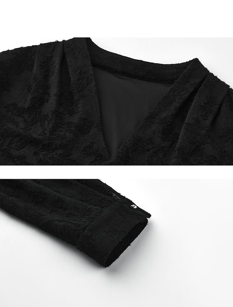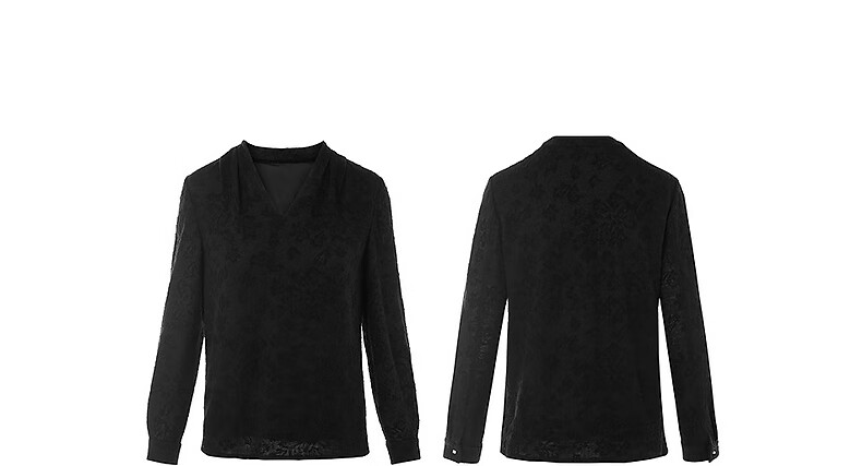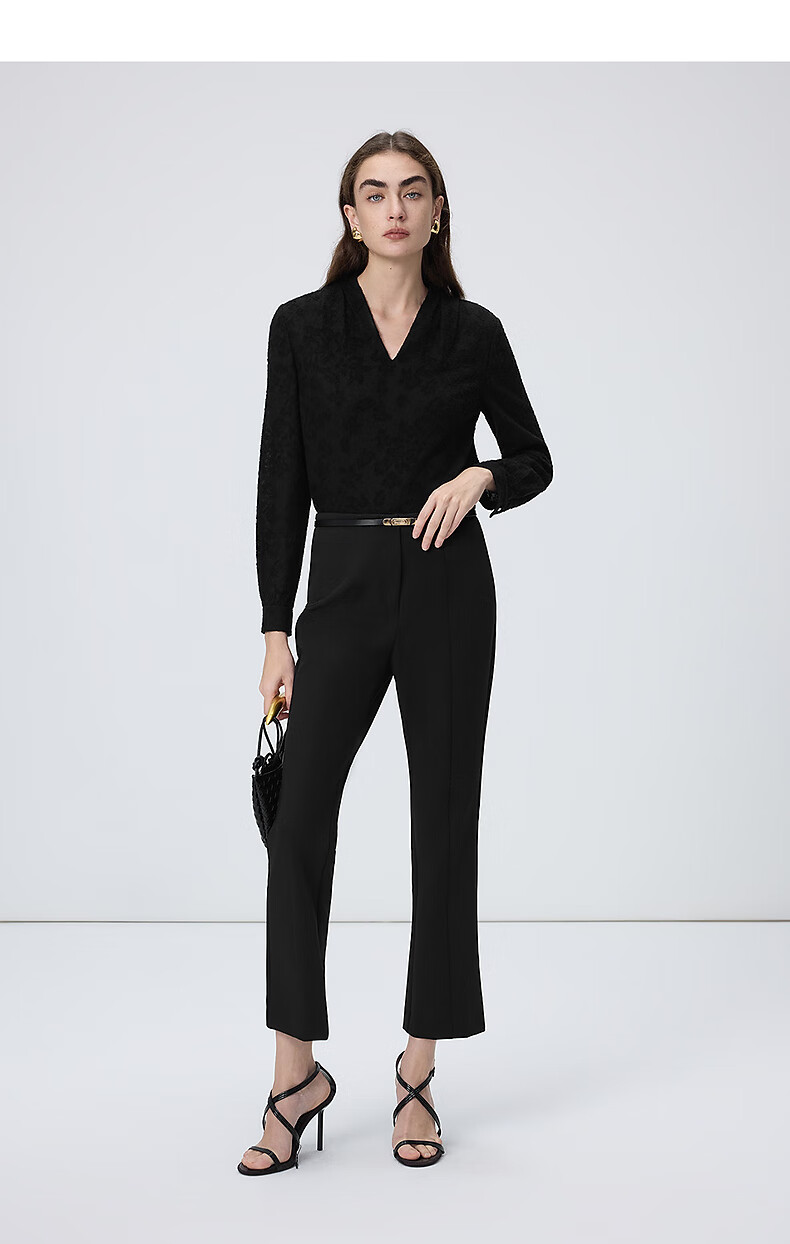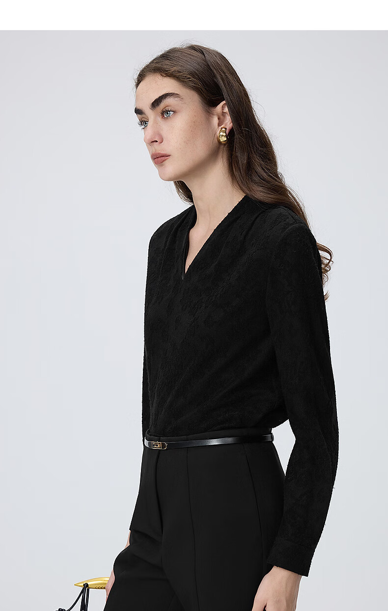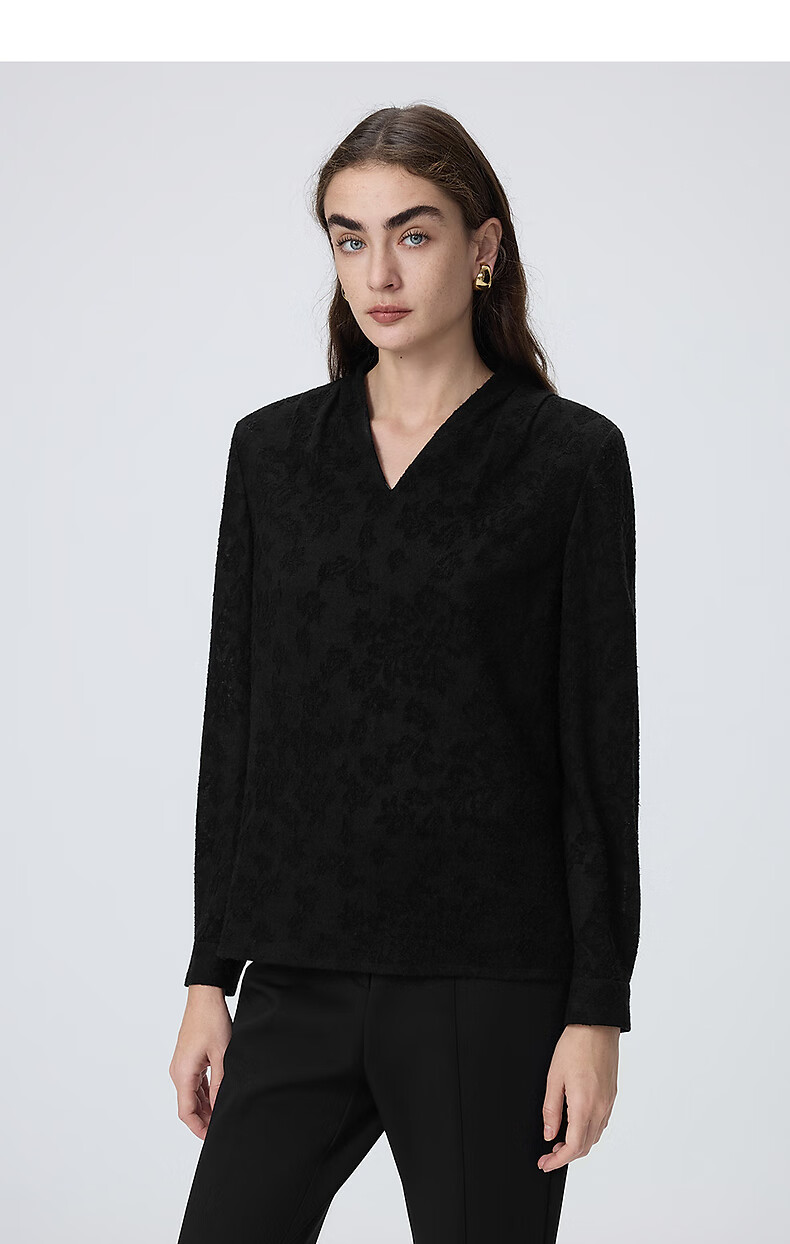 Langzi Wool V-neck Jacquard Elegant Temperament Shirt Simple and Comfortable Commuting Shirt Women 2026 Spring New Black XL