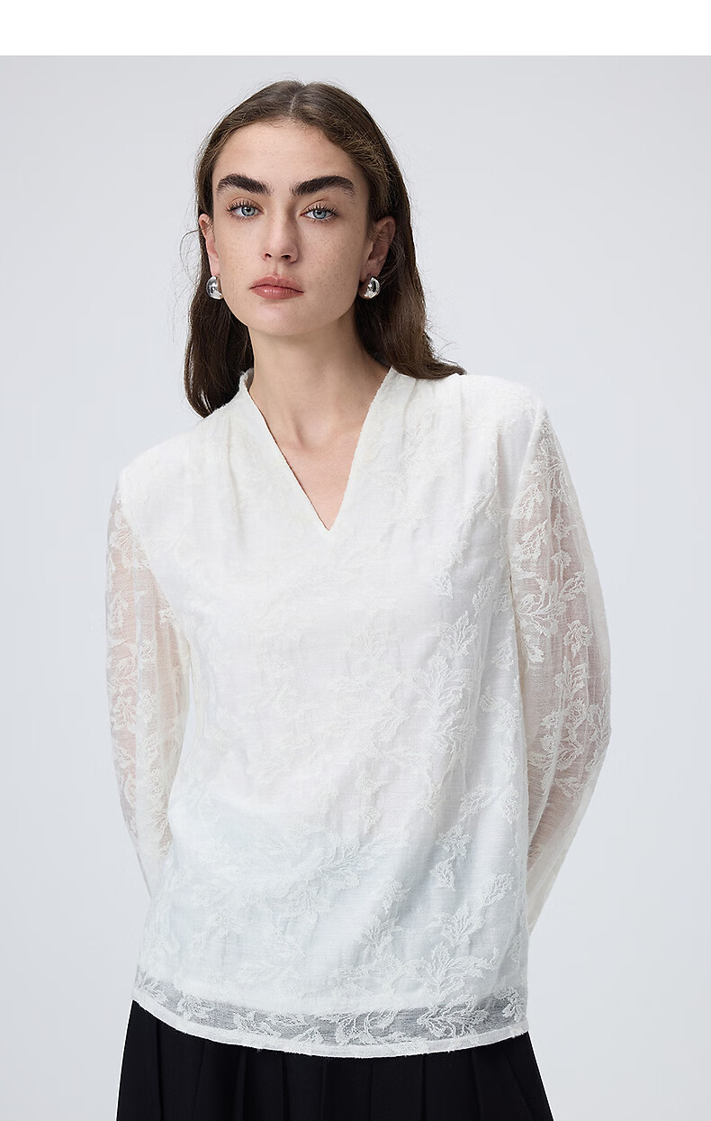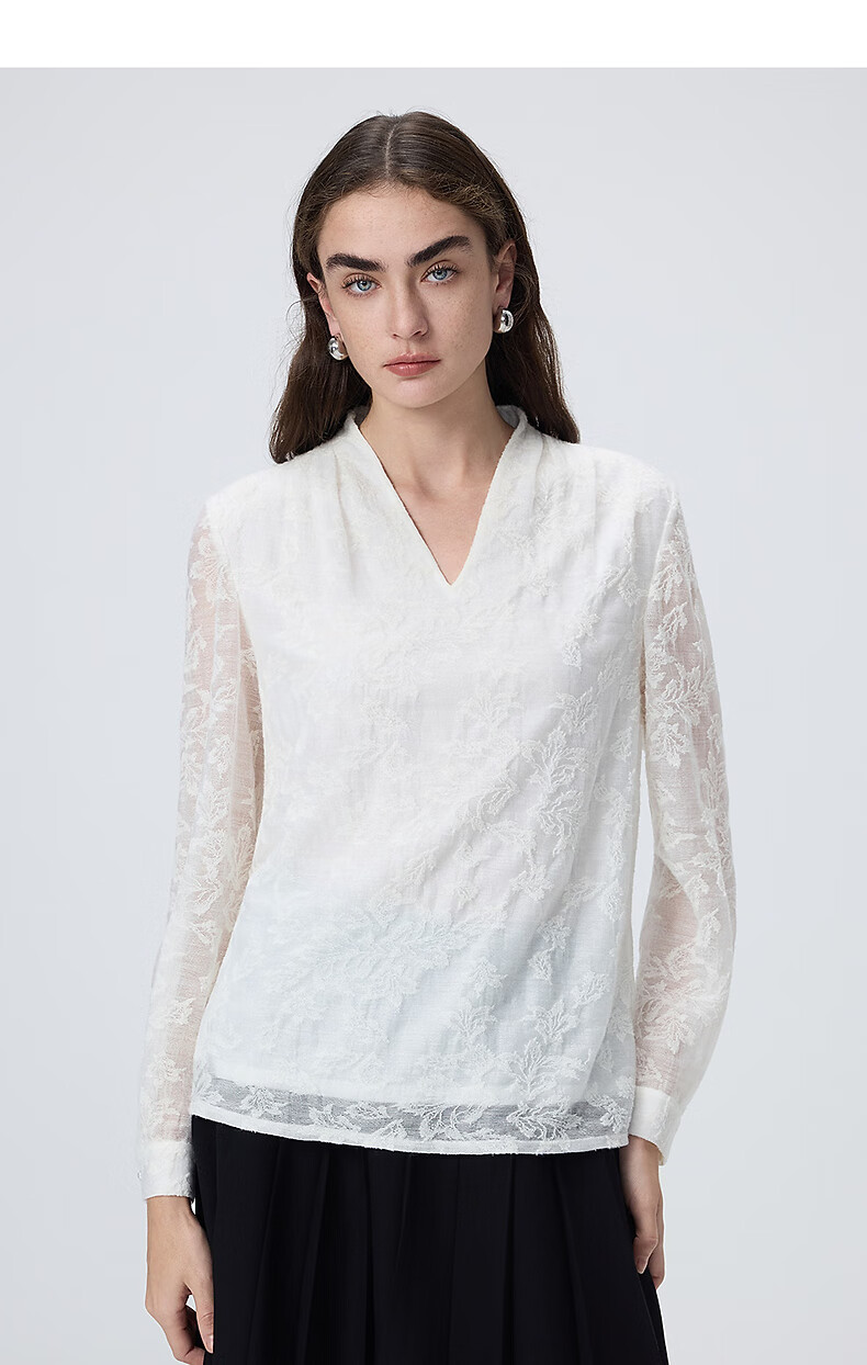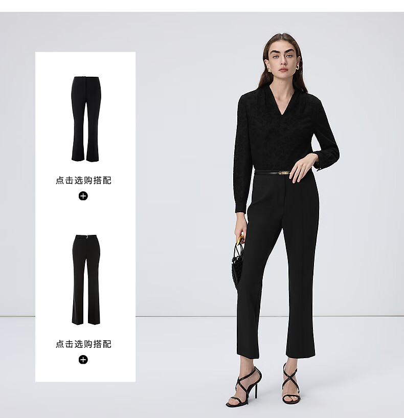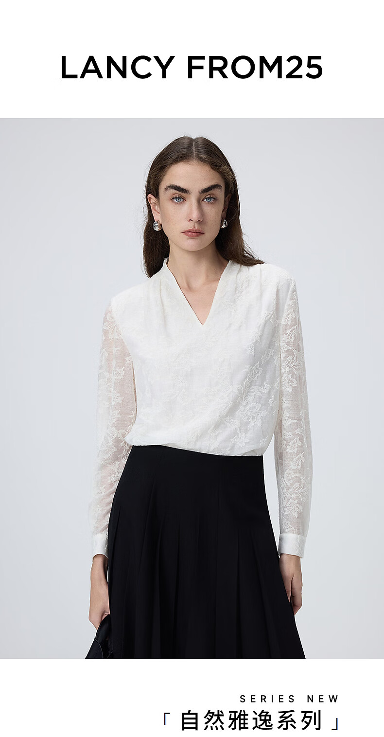 Langzi Wool V-neck Jacquard Elegant Temperament Shirt Simple and Comfortable Commuting Shirt Women 2026 Spring New Black XL