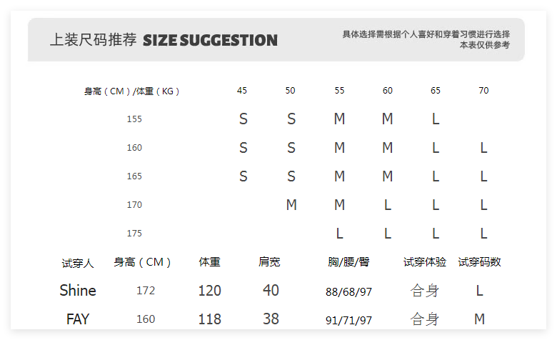 China (cm) 160-165/84-86 165-170 / 88-90 167-172 / 92-96 168-173 / 98-102 170-176 / 106-110