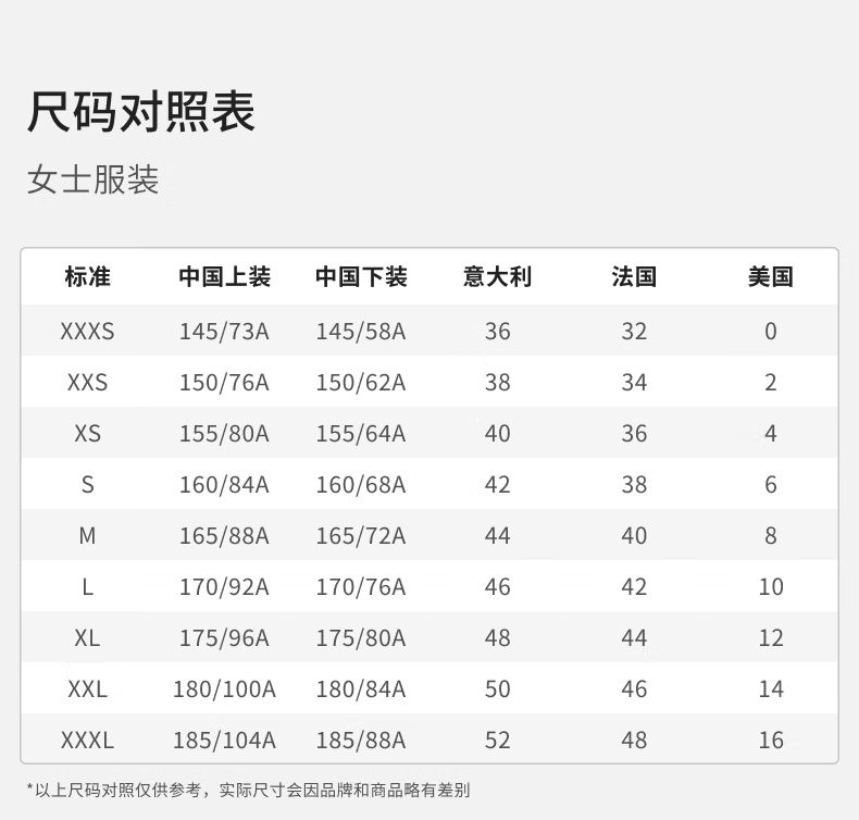 China (cm) 160-165/84-86 165-170 / 88-90 167-172 / 92-96 168-173 / 98-102 170-176 / 106-110