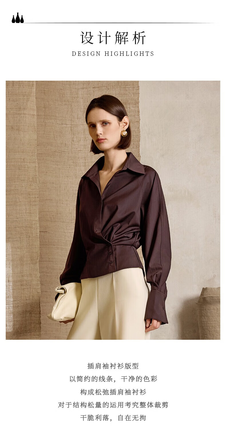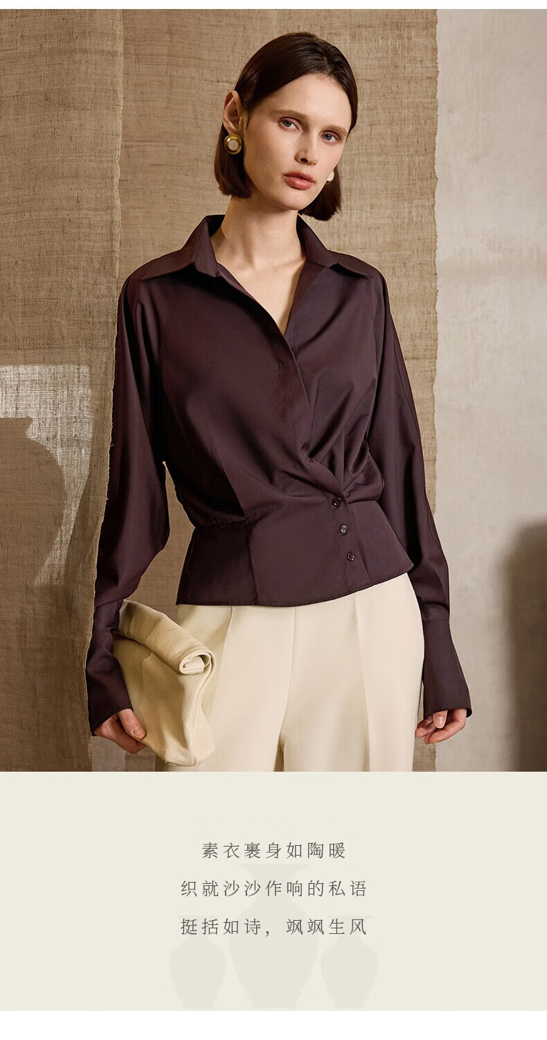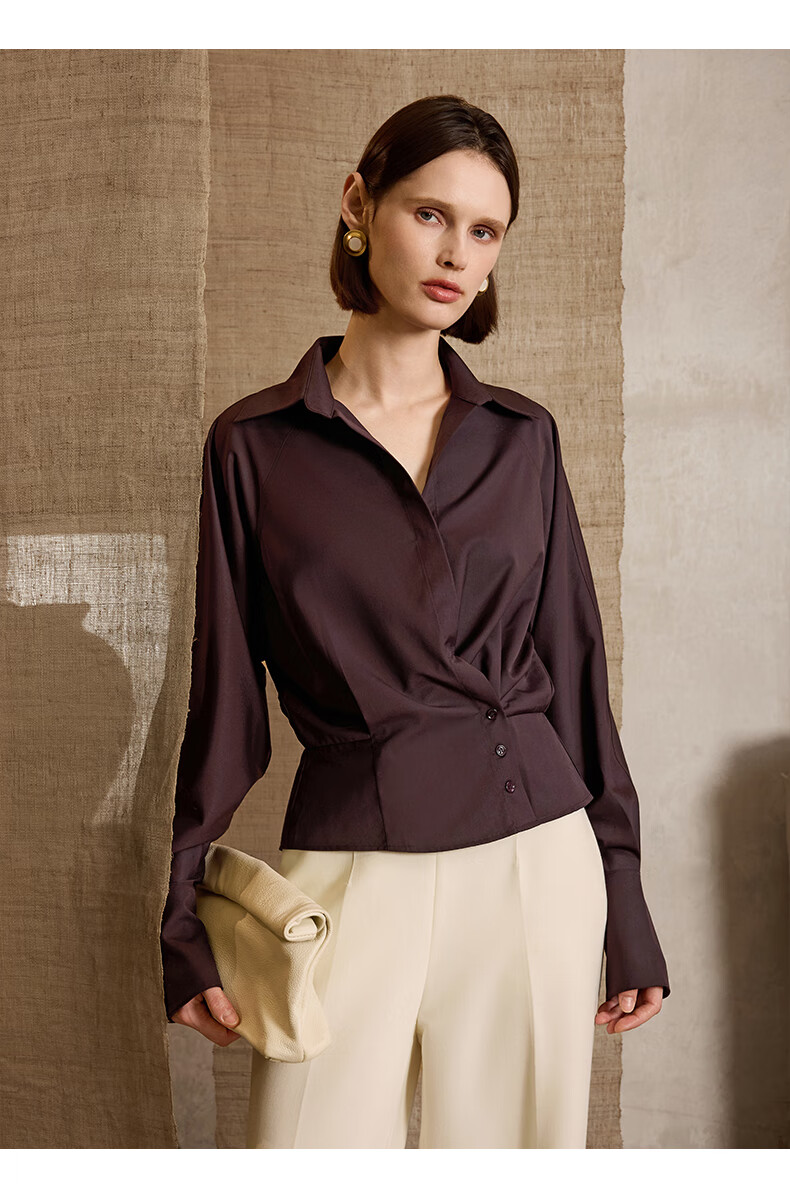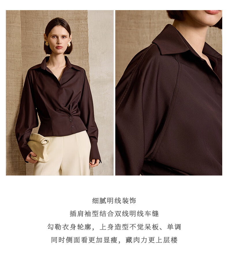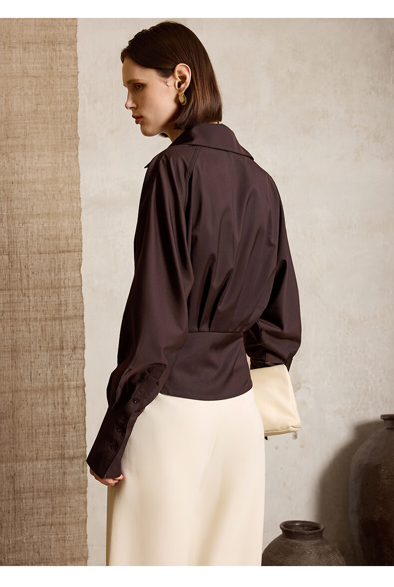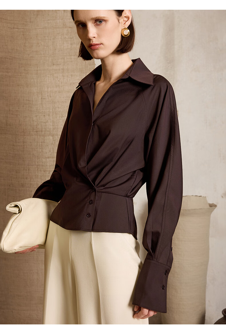 OMNIALUO shirt women's 2025 new design niche light luxury pleated slim shirt top C05 coffee color S