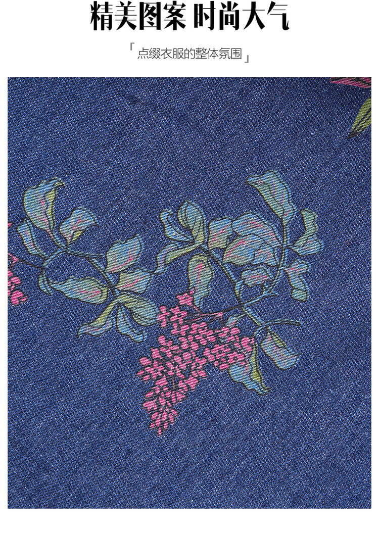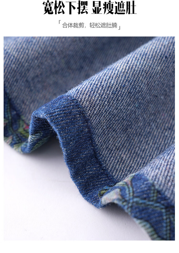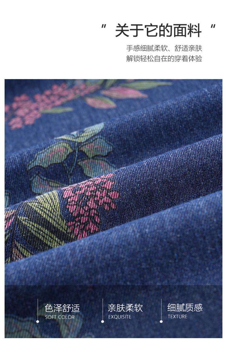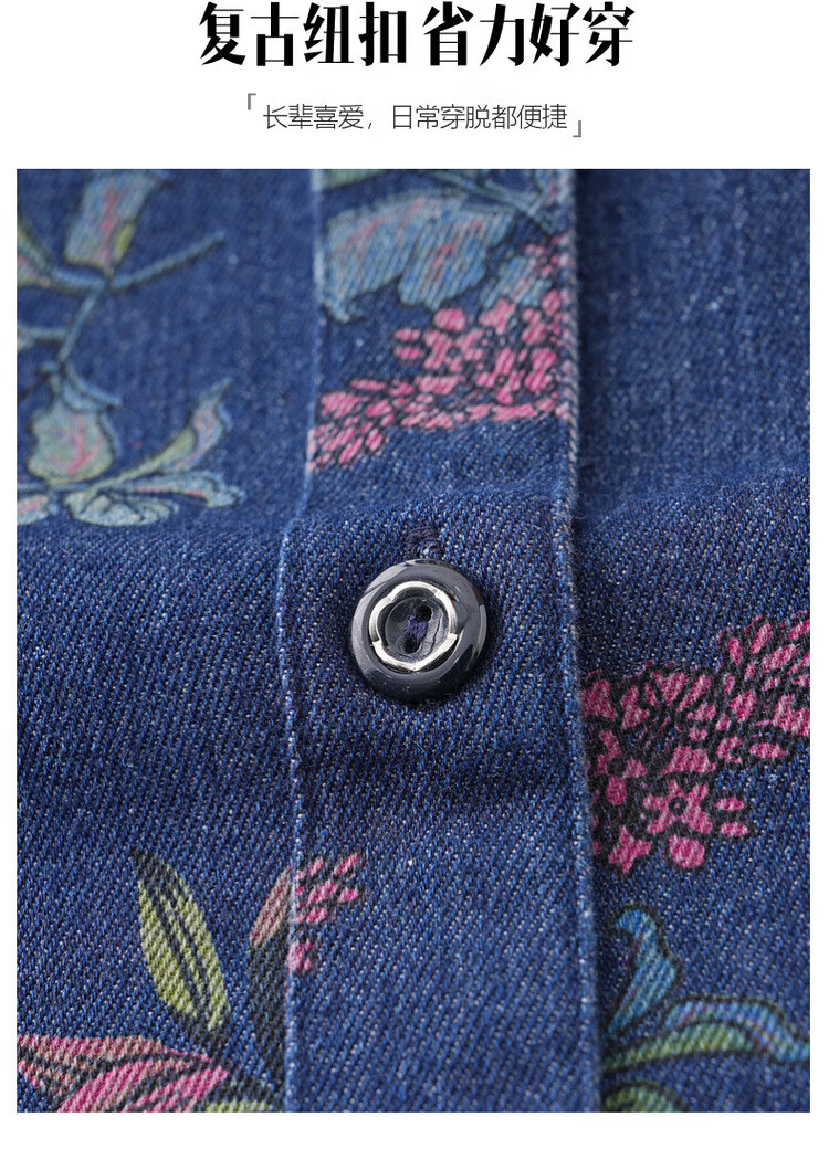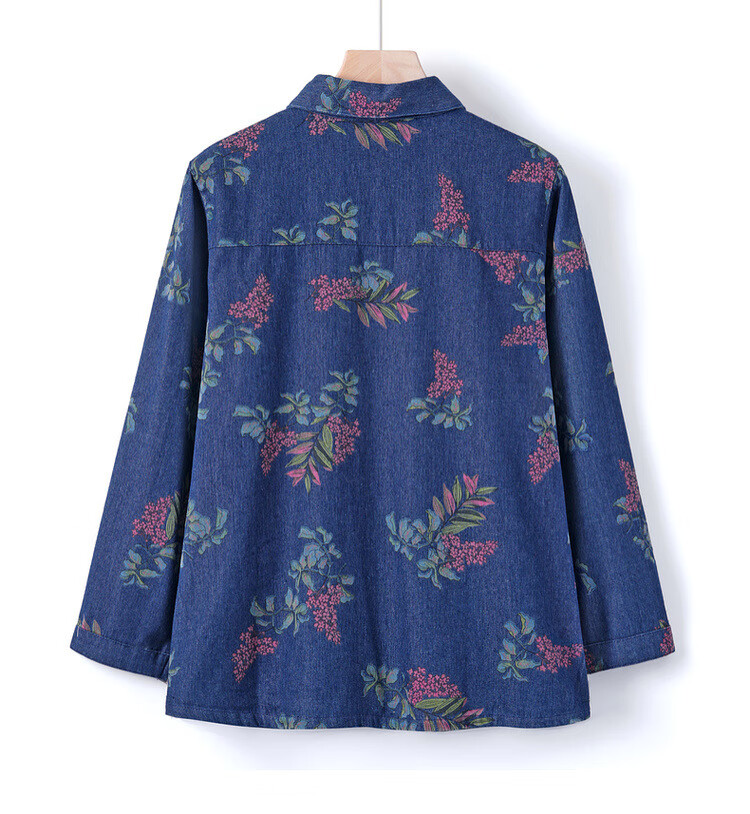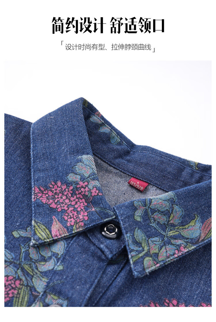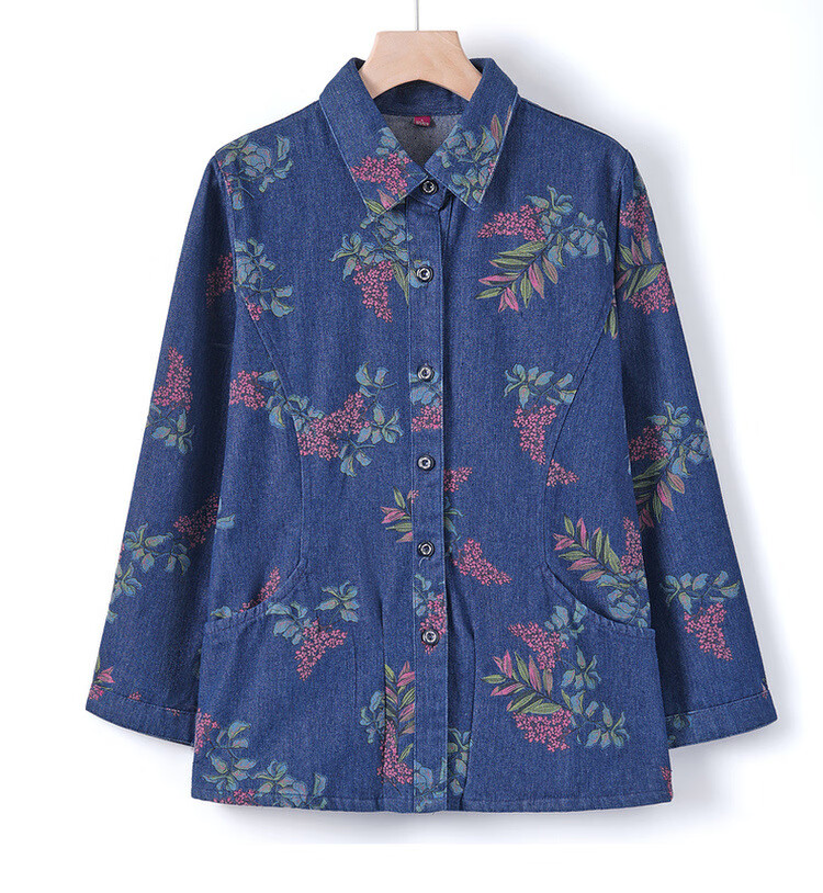 Middle-aged mother's spring and autumn clothing shirt jacket middle-aged and elderly women's printed denim top grandma's summer large size denim blue L (recommended 100Jin Jin equals within 0.5 kg)