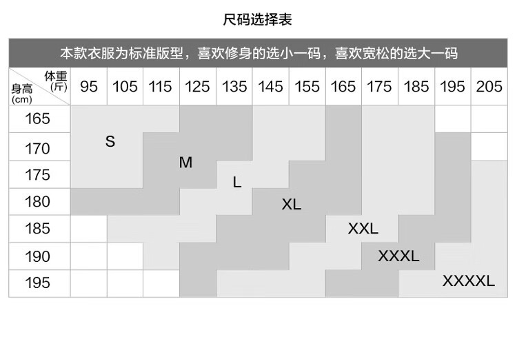 China (cm) 160-165/84-86 165-170 / 88-90 167-172 / 92-96 168-173 / 98-102 170-176 / 106-110