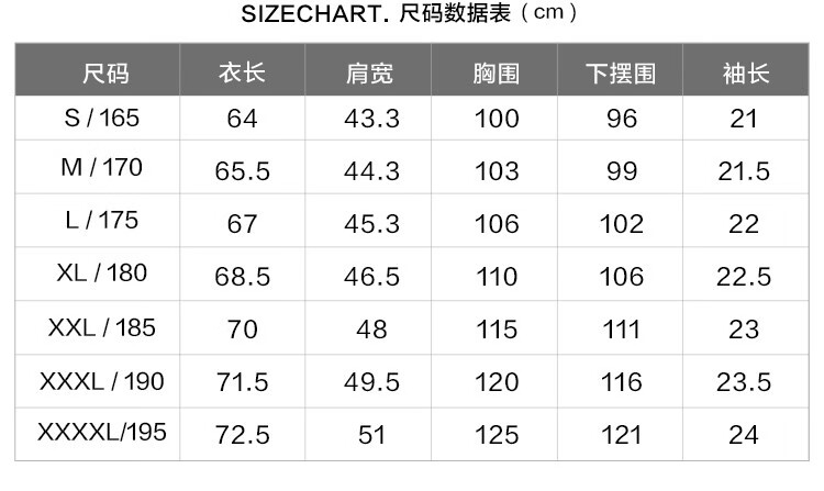 China (cm) 165 / 88-90 170 / 96-98 175 / 108-110 180 / 118-122 185 / 126-130