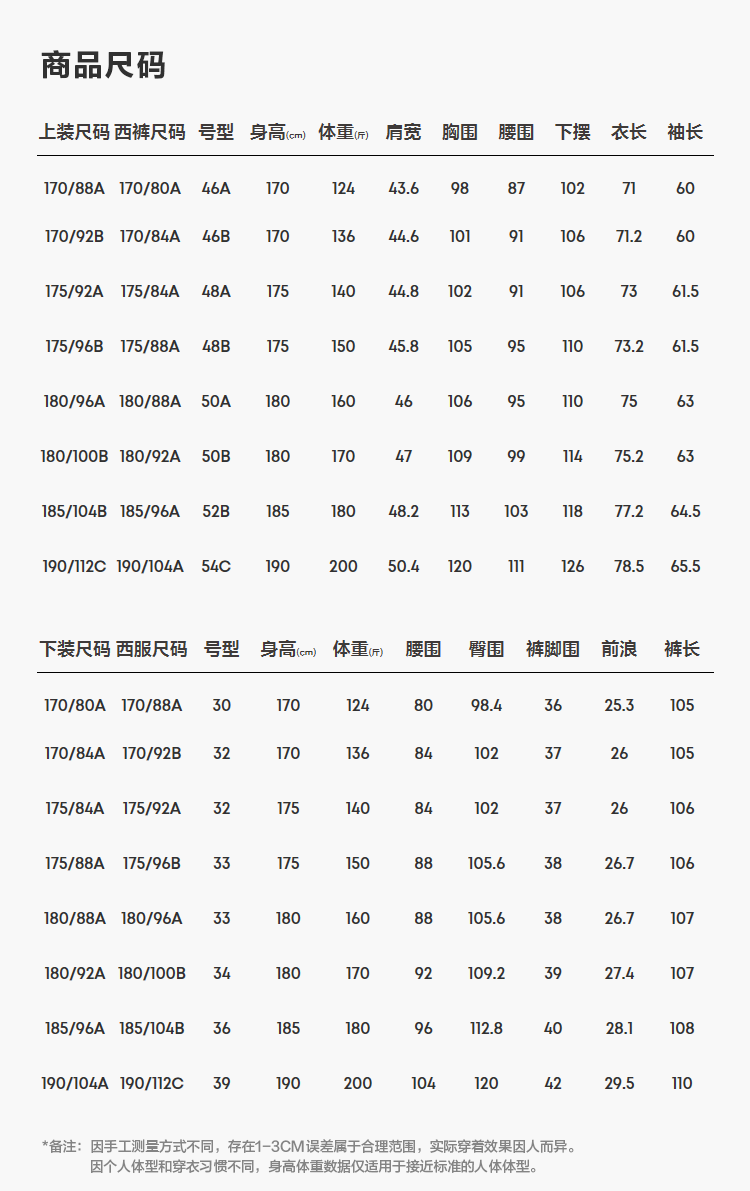 China (cm) 160-165/84-86 165-170 / 88-90 167-172 / 92-96 168-173 / 98-102 170-176 / 106-110
