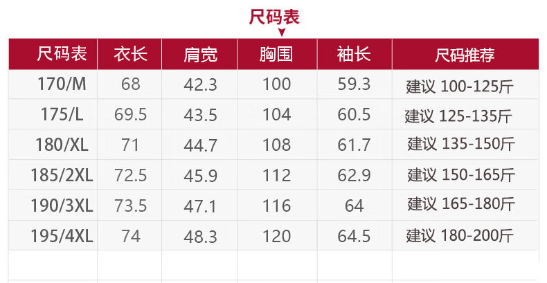 China (cm) 165 / 88-90 170 / 96-98 175 / 108-110 180 / 118-122 185 / 126-130