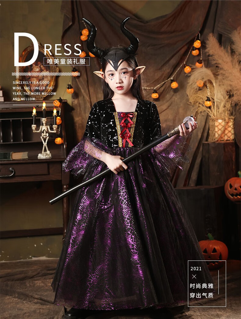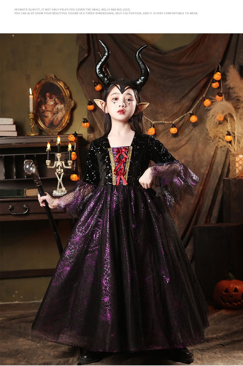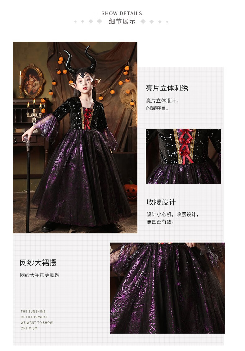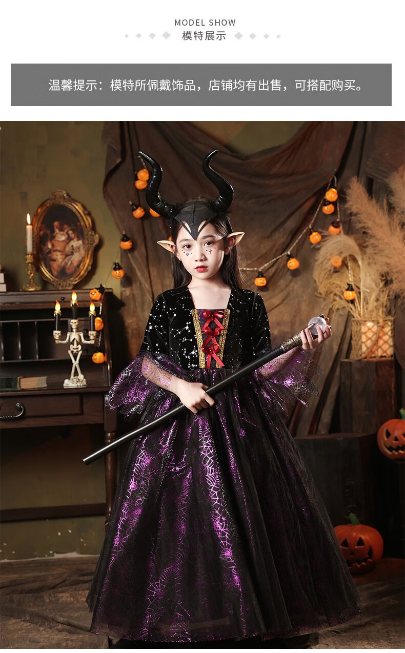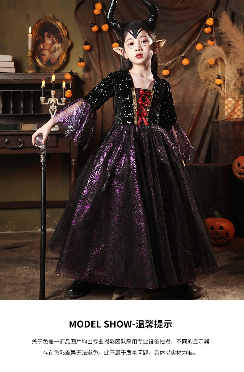 Xiaokayinon Halloween children's costume girl cosplay witch dress up girl little devil masquerade performance dress Halloween black and purple costume + hat + shawl 150