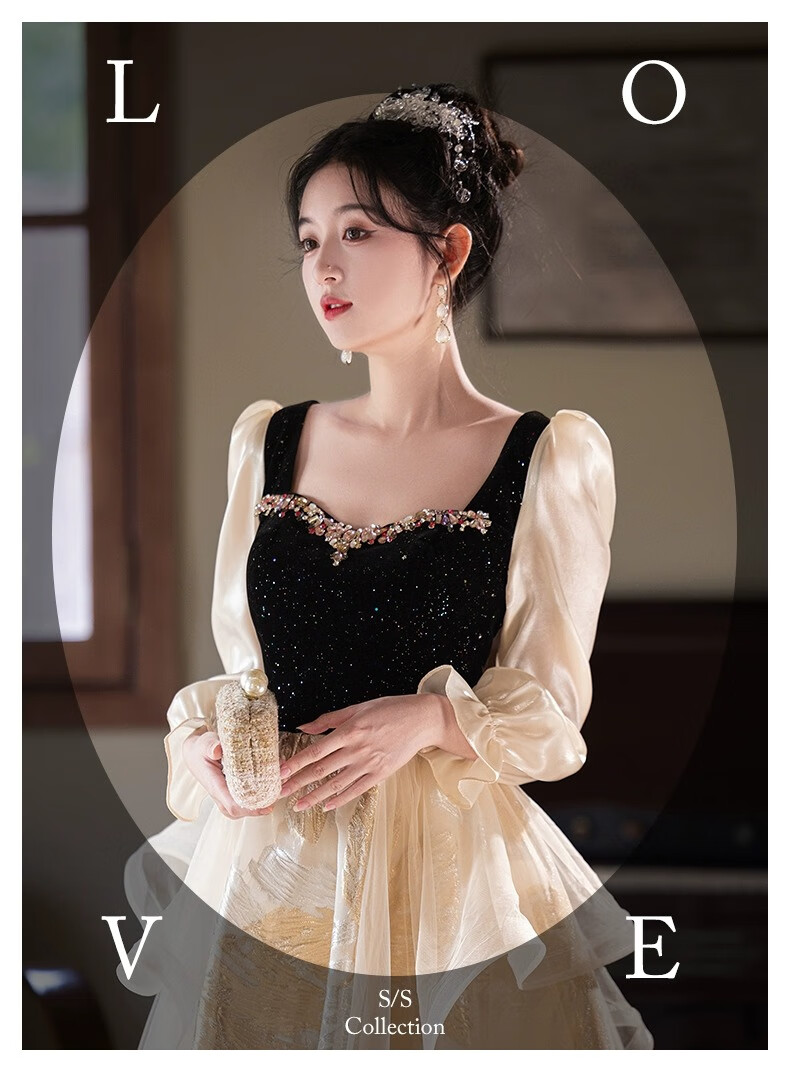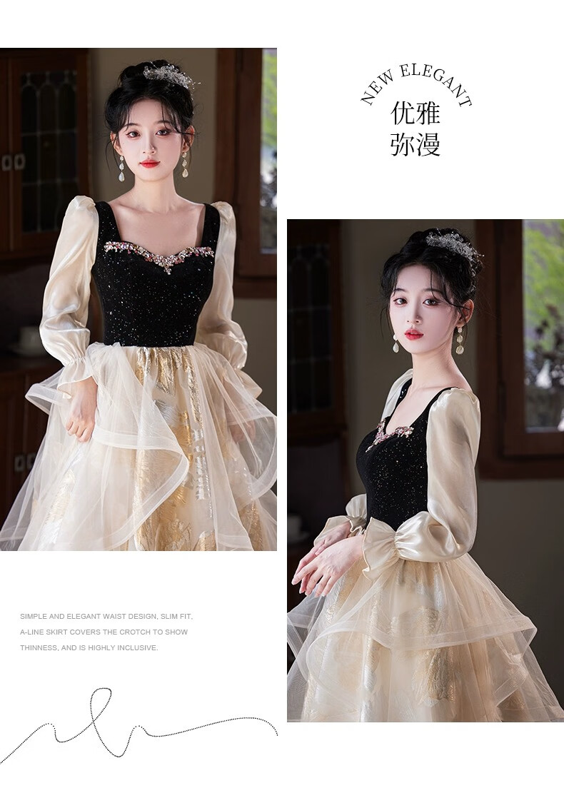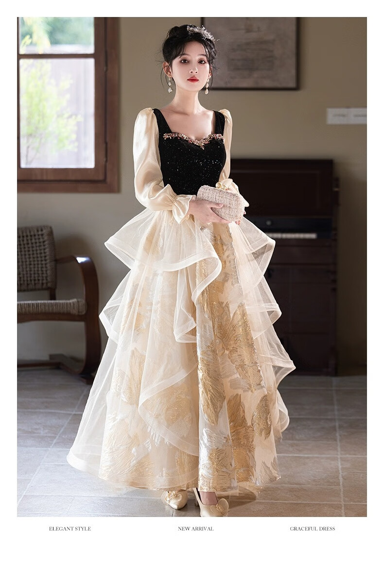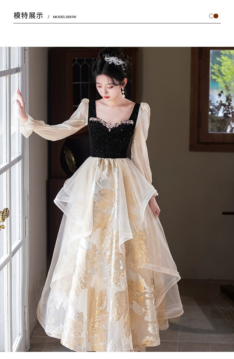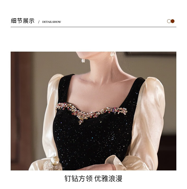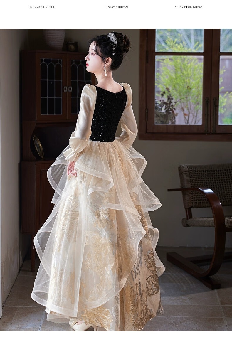 Li Baixin French Annual Party Evening Dress for Women 2025 New High-end Temperament Long-sleeved Princess Vocal Art Exam Dress Black 3XL Recommended 130-135 Jin Jin equals 0.5 kg