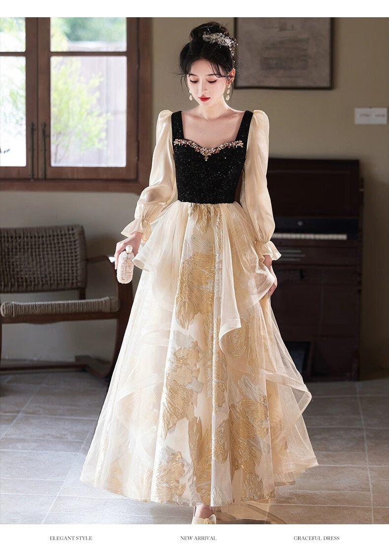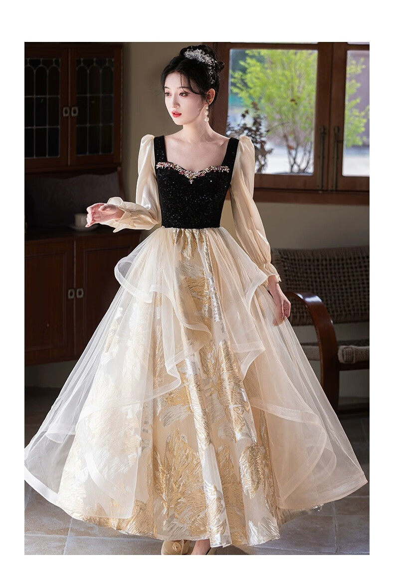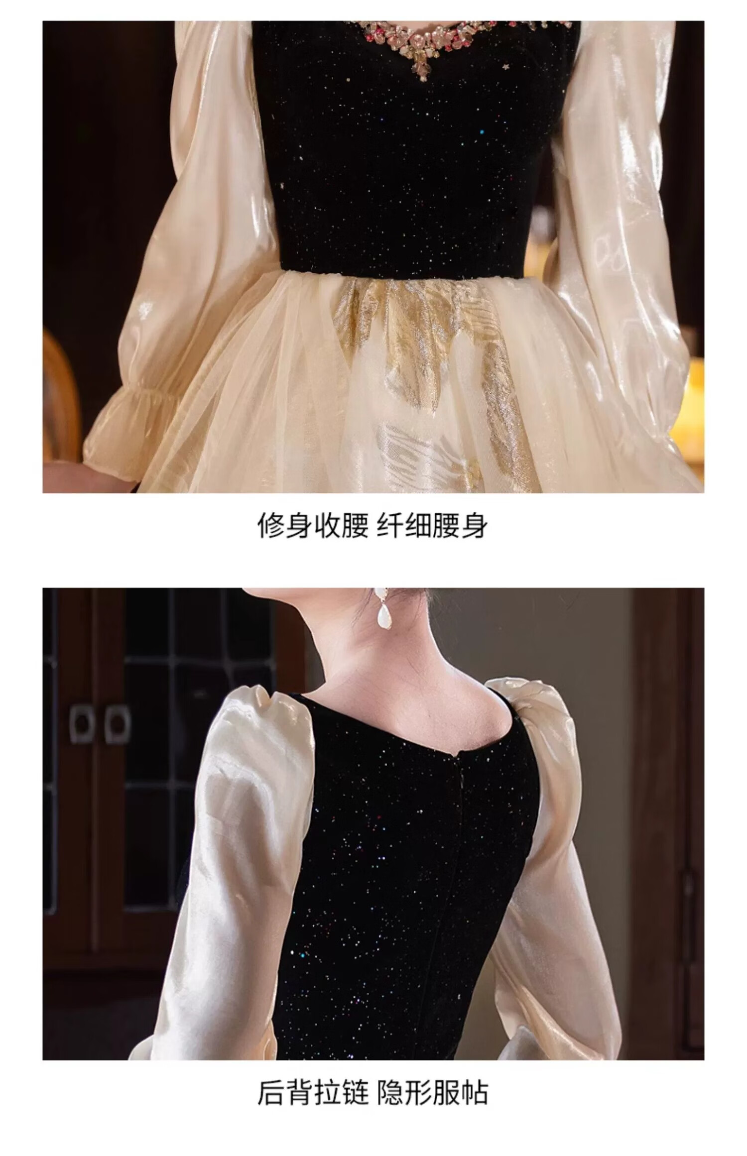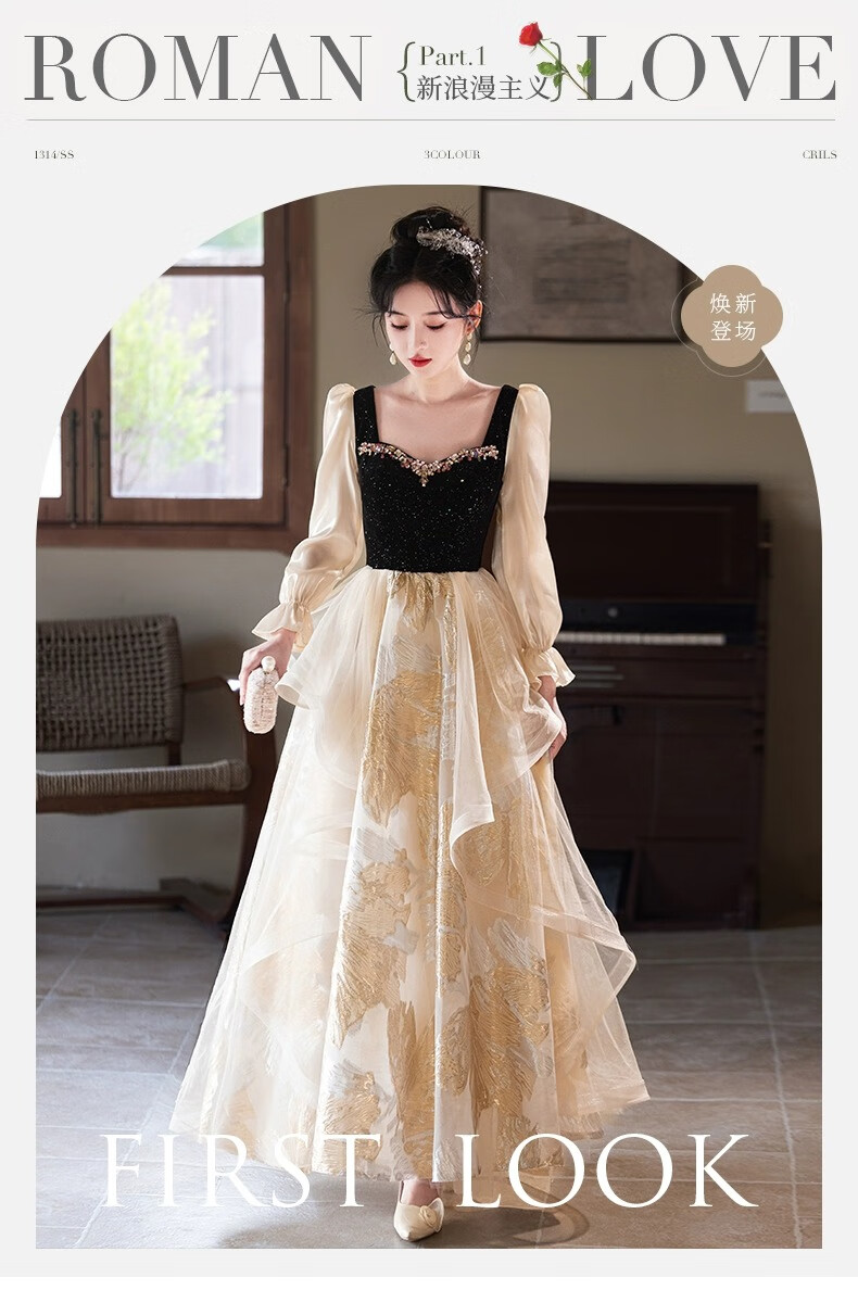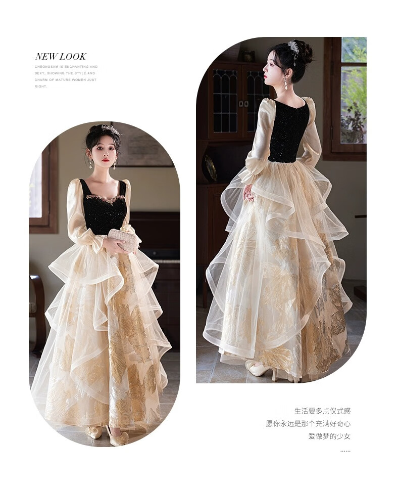Li Baixin French Annual Party Evening Dress for Women 2025 New High-end Temperament Long-sleeved Princess Vocal Art Exam Dress Black 3XL Recommended 130-135 Jin Jin equals 0.5 kg