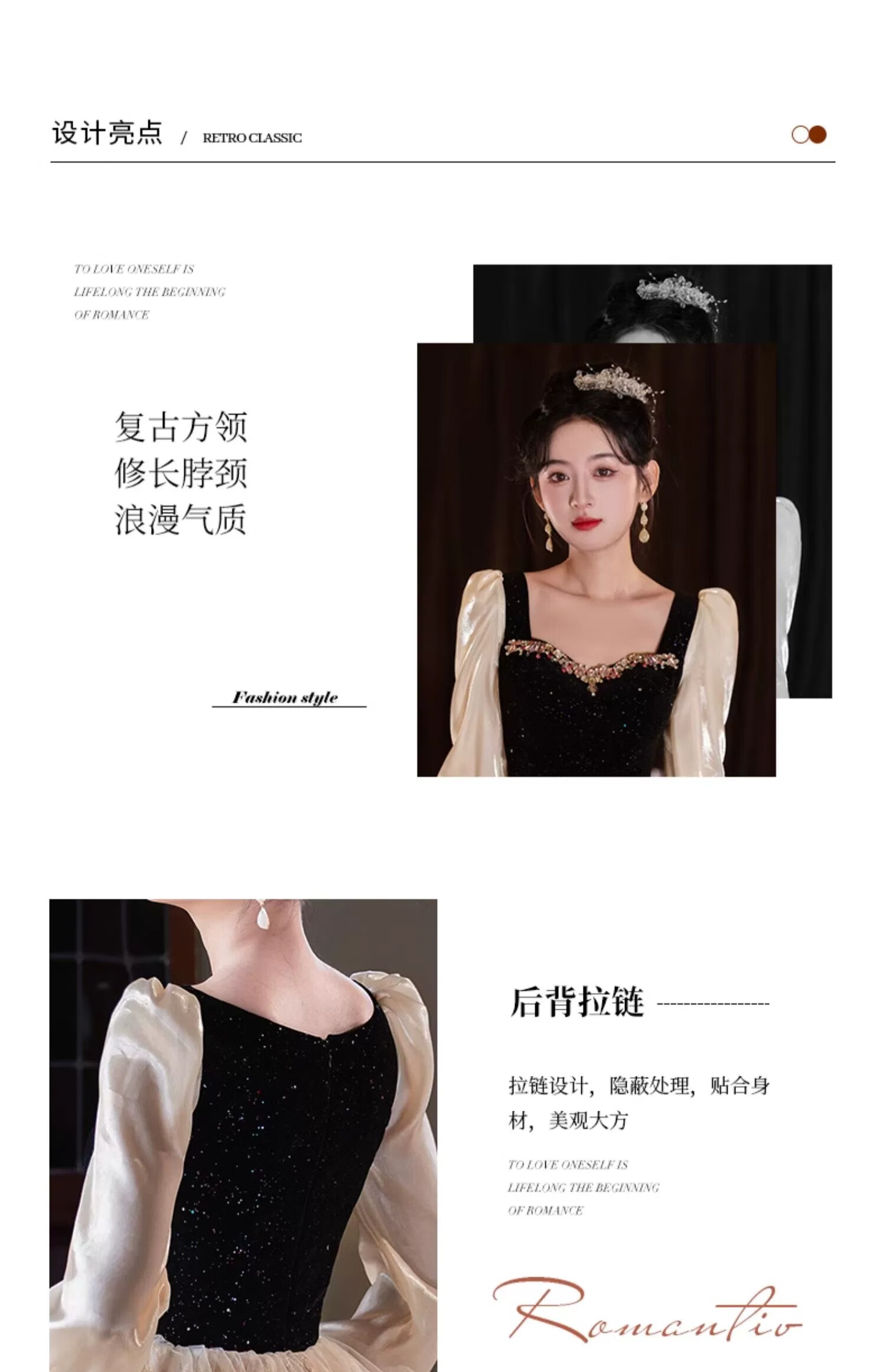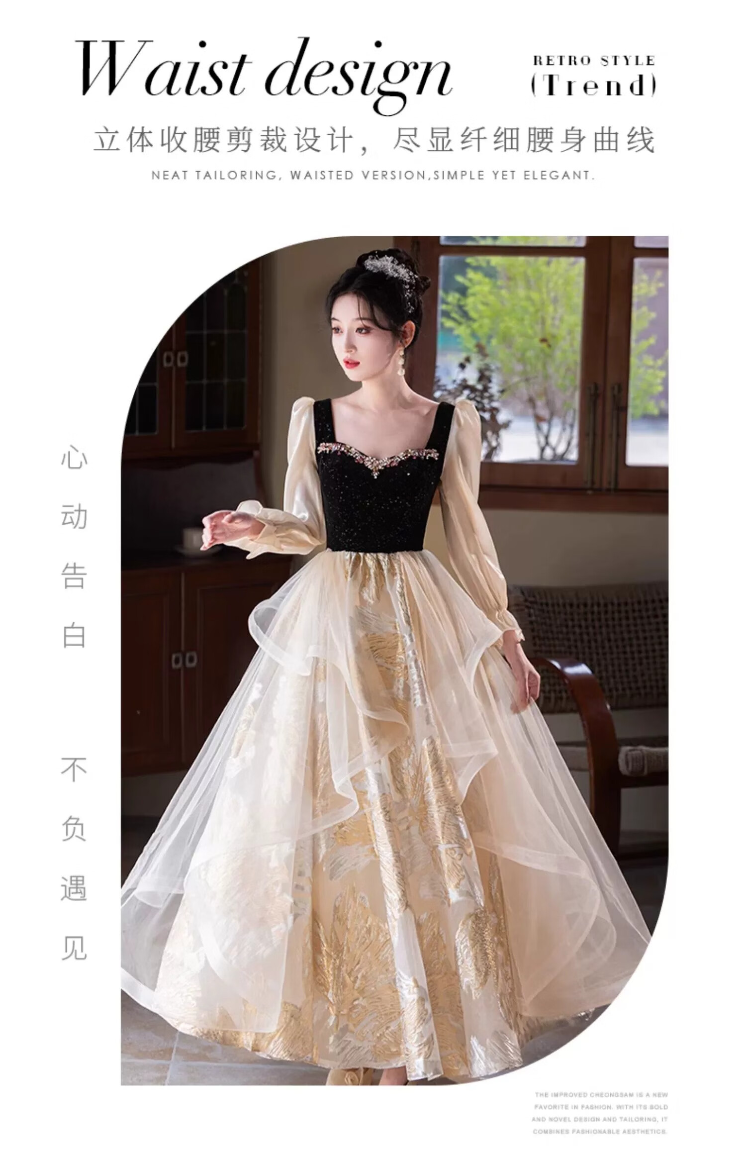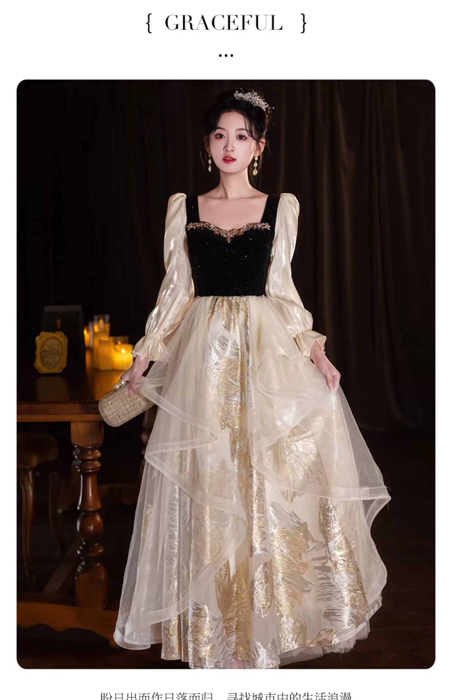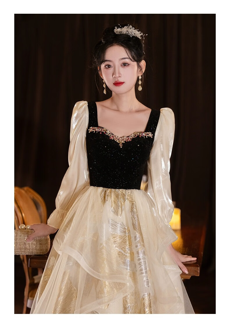 Li Baixin French Annual Party Evening Dress for Women 2025 New High-end Temperament Long-sleeved Princess Vocal Art Exam Dress Black 3XL Recommended 130-135 Jin Jin equals 0.5 kg