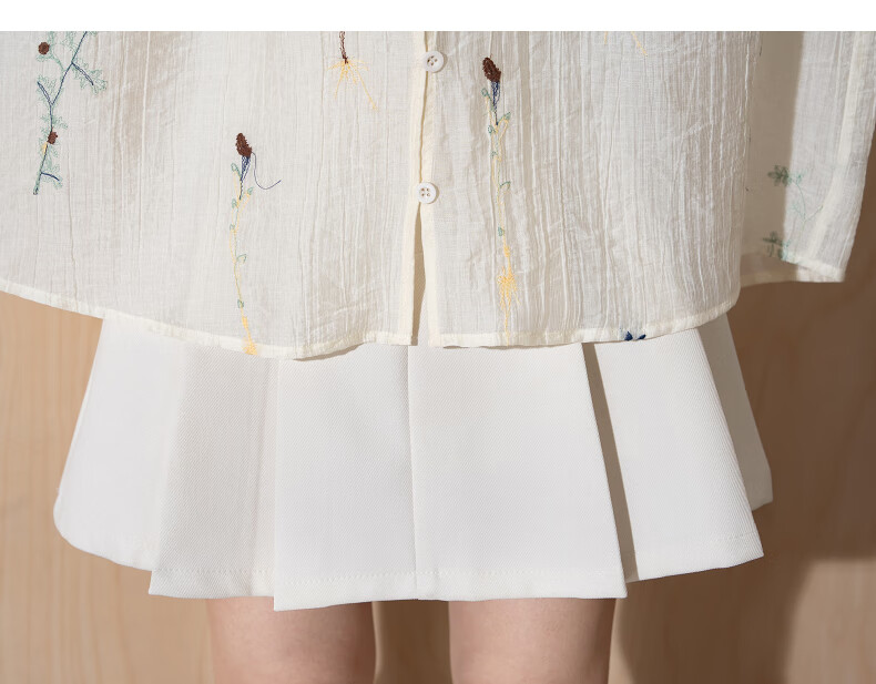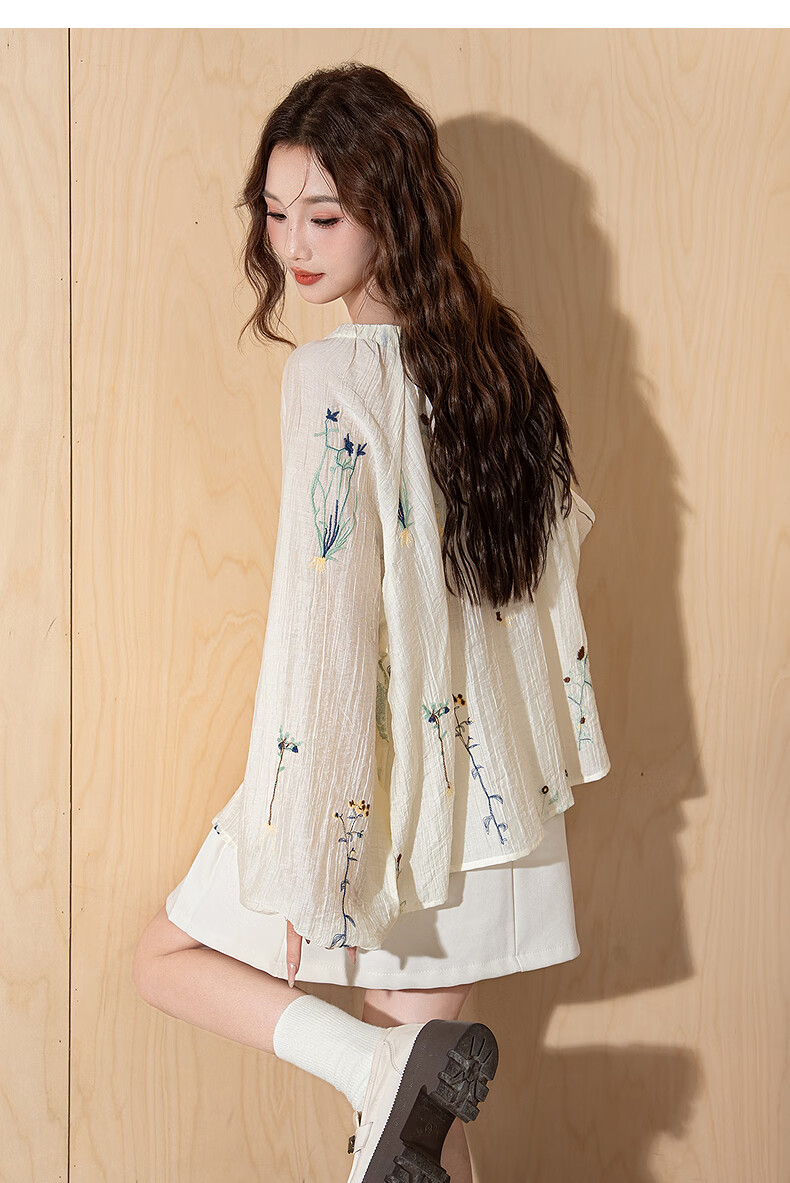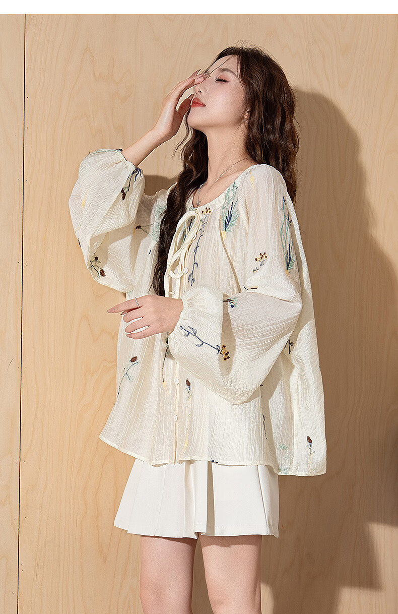 TonLion 2025 Autumn Women's Round Neck Embroidered Collar Drawstring Shirt, Apricot L