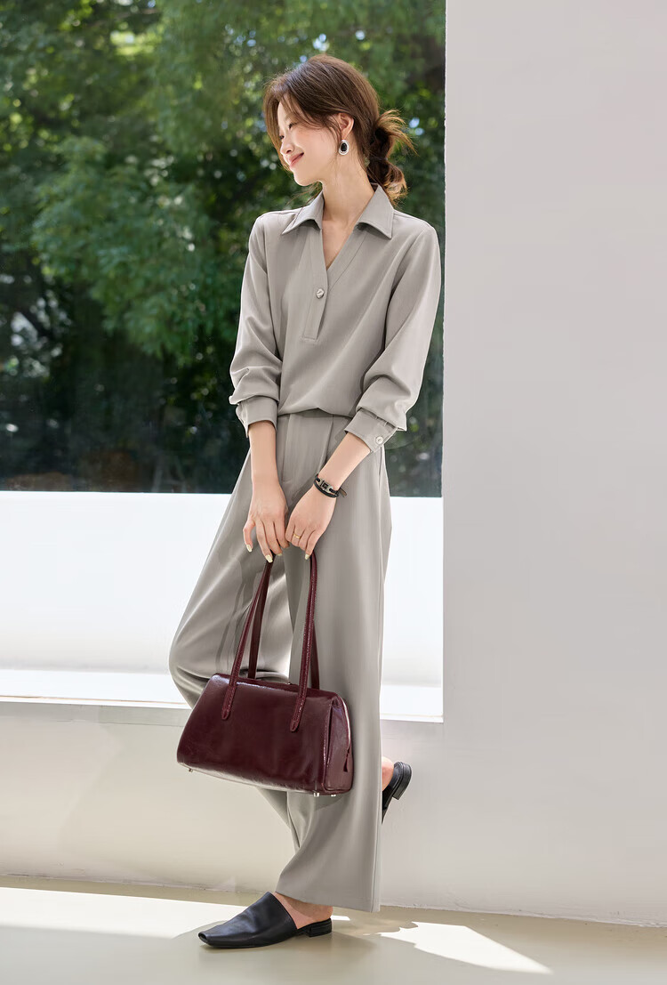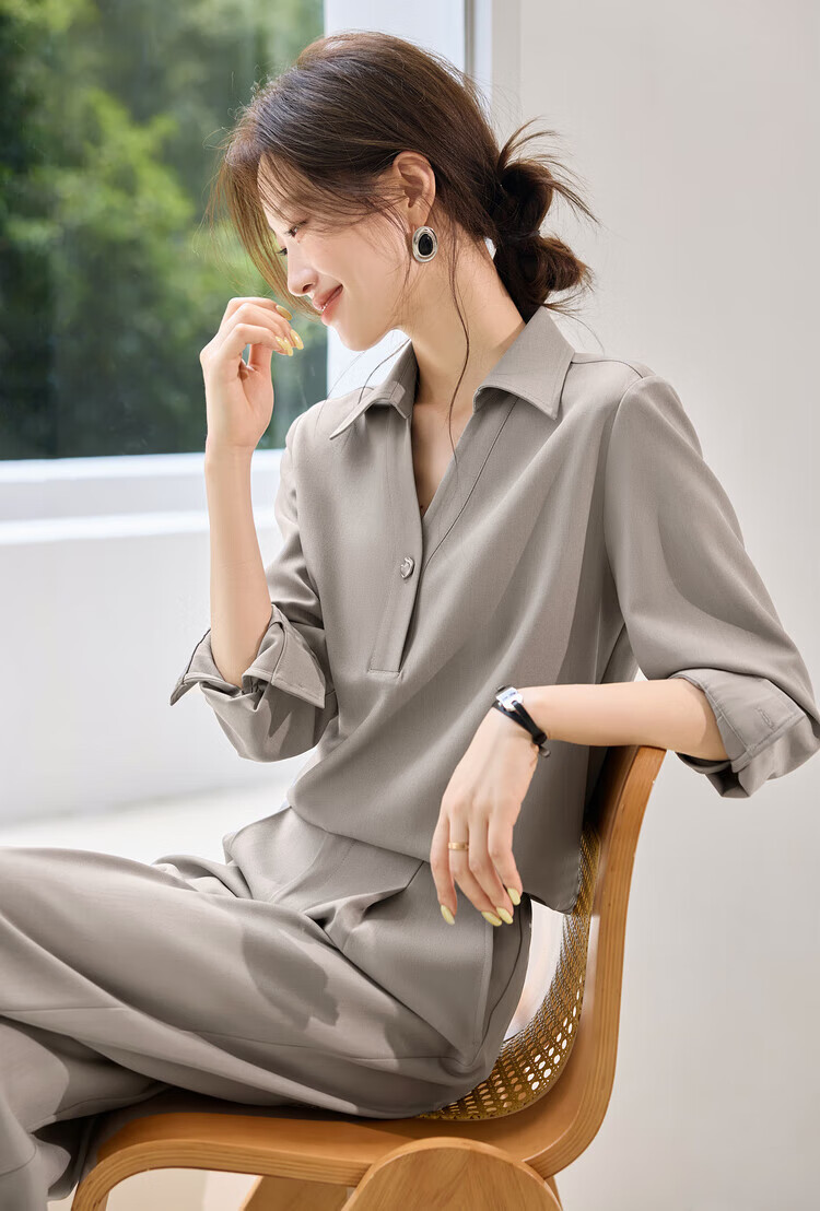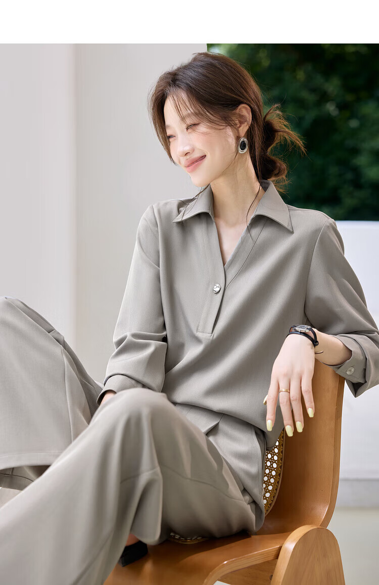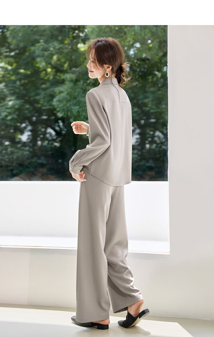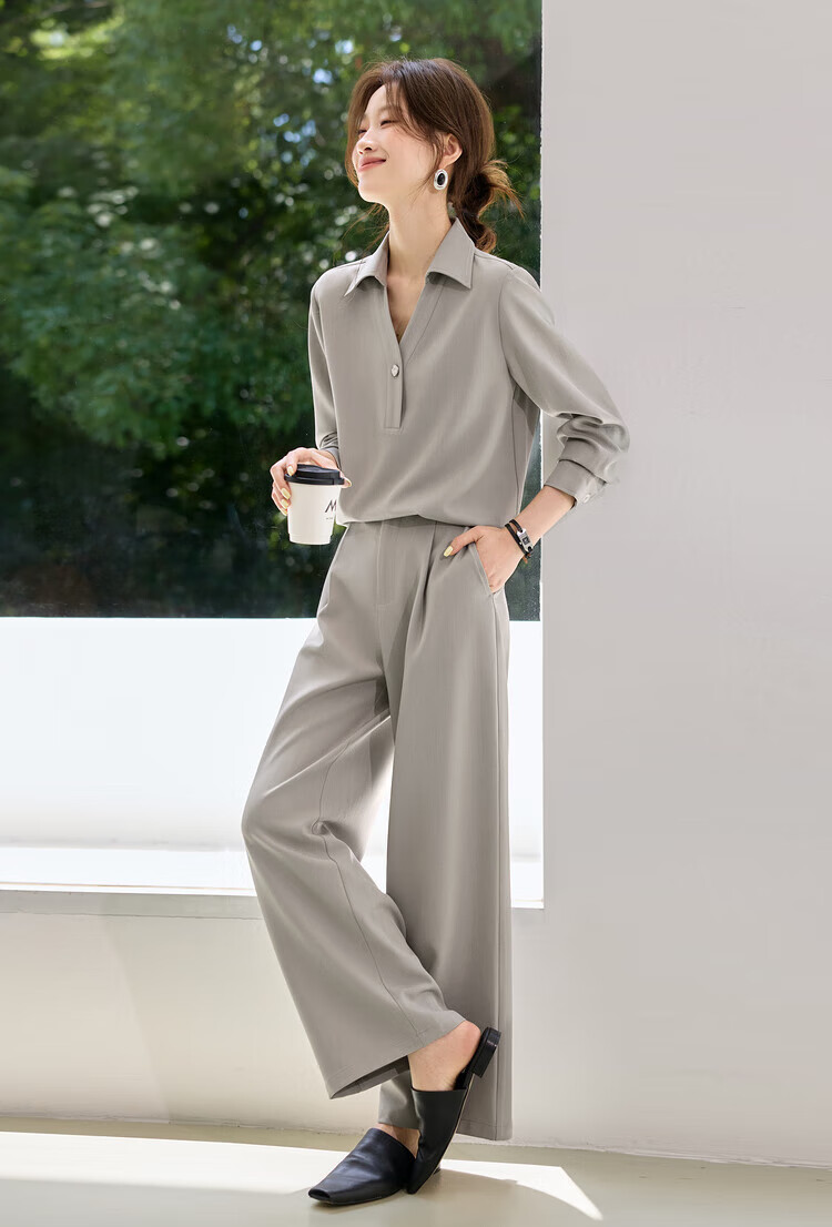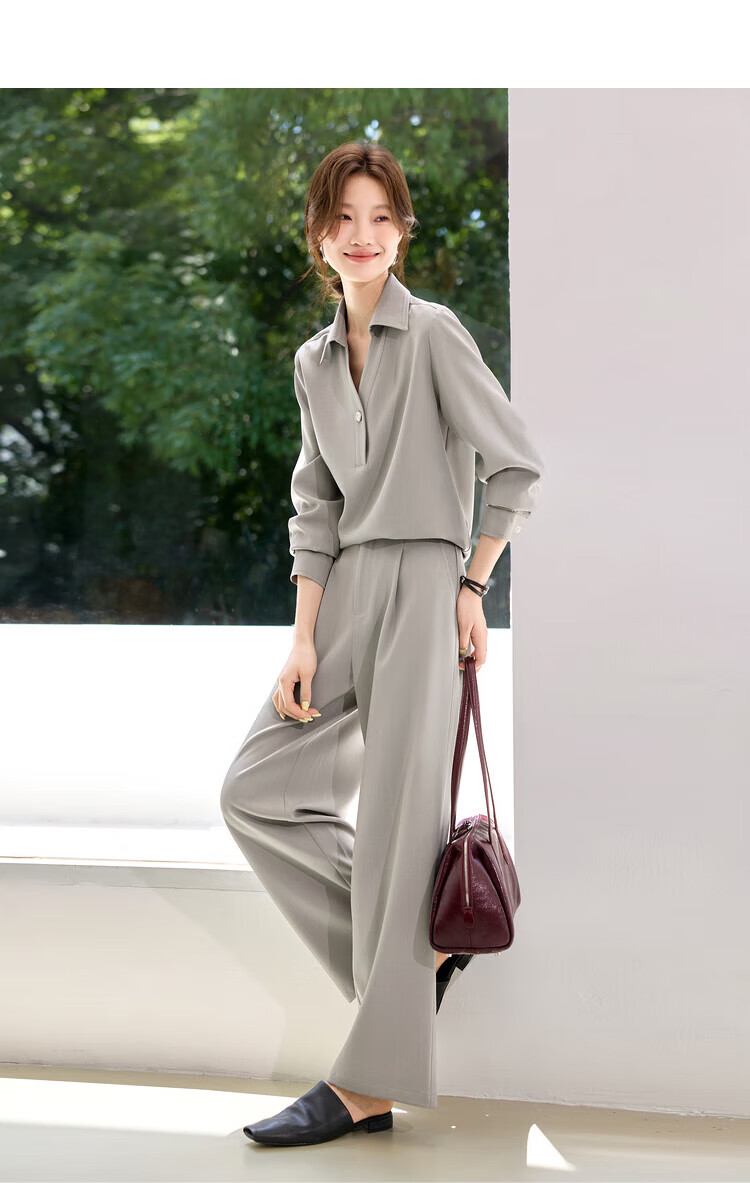 Mohan Yimei urban rights travel style suit 2025 autumn new old money style lapel shirt wide leg pants two-piece set
