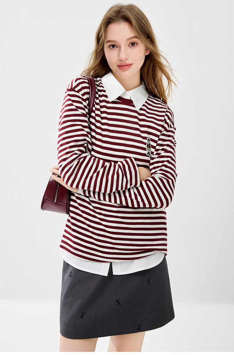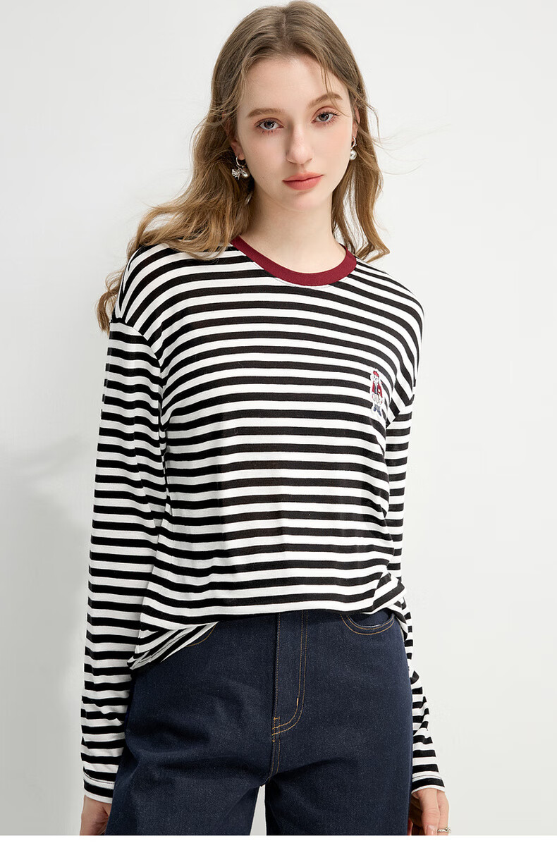 Qiushui Yiren Fashionable Simple Striped Top 2025 Spring New Commuting Style Contrast Color Ribbed Collar