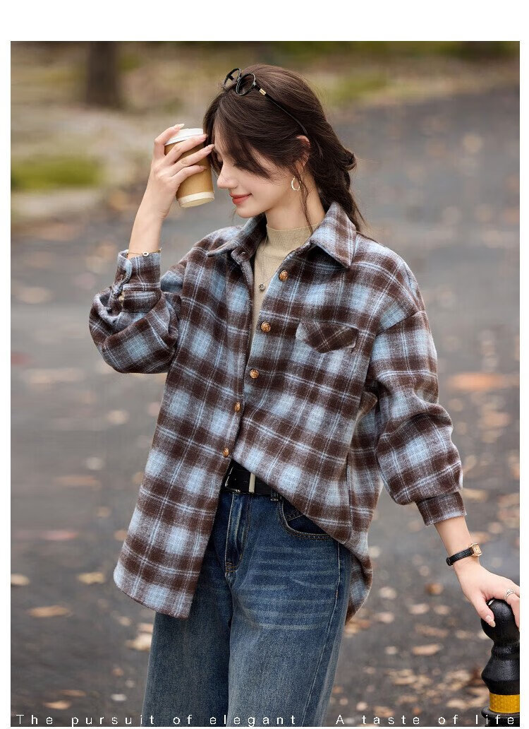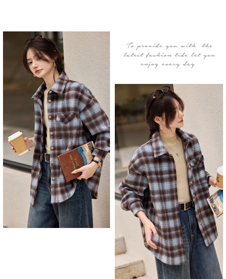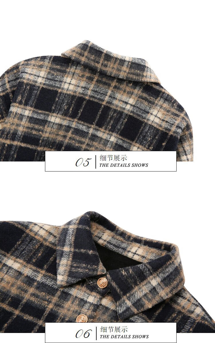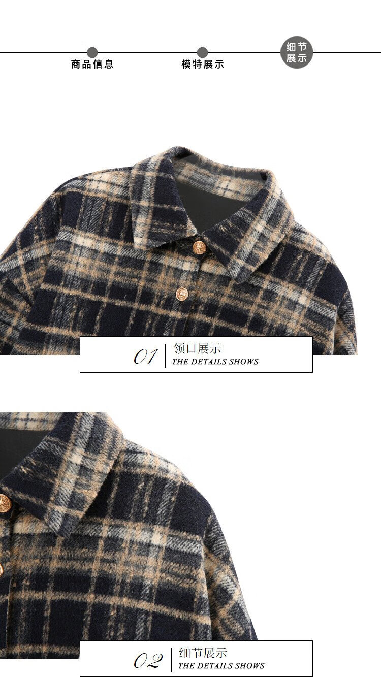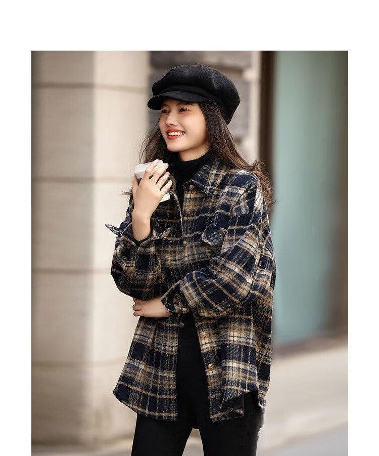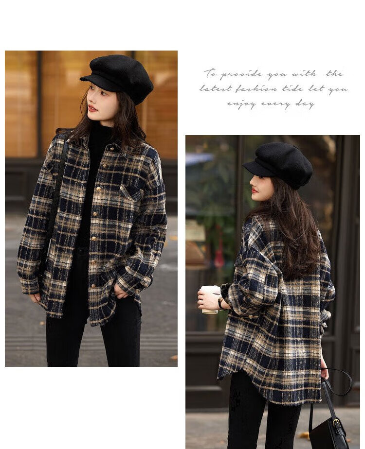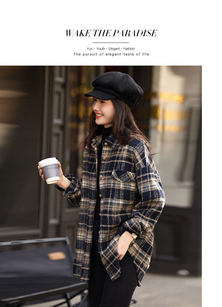 Awakening Paradise Winter Fashion Temperament Versatile Velvet Single-Breasted Thick Plaid Shirt Loose Slim Jacket Navy XL