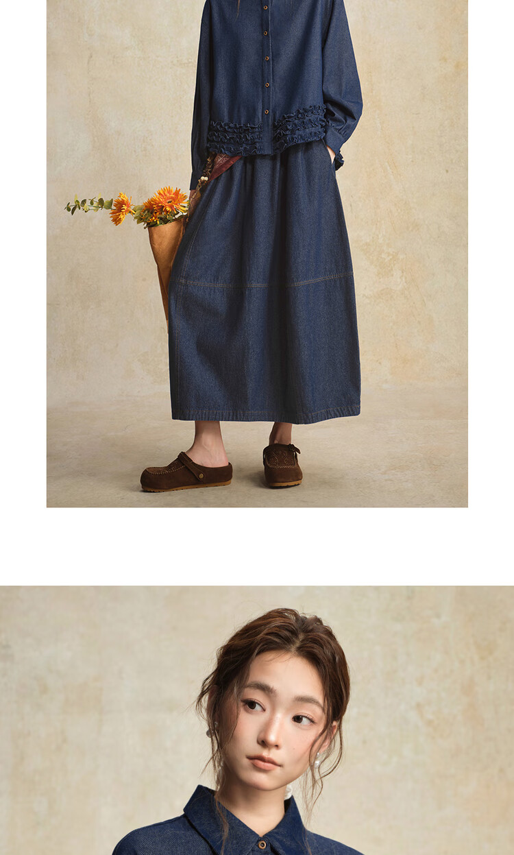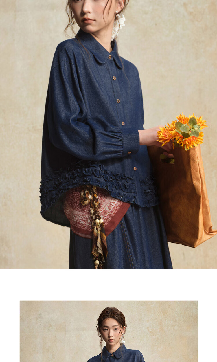 Giordano designer women's autumn and winter new ruffled loose lapel long-sleeved denim shirt 18345222