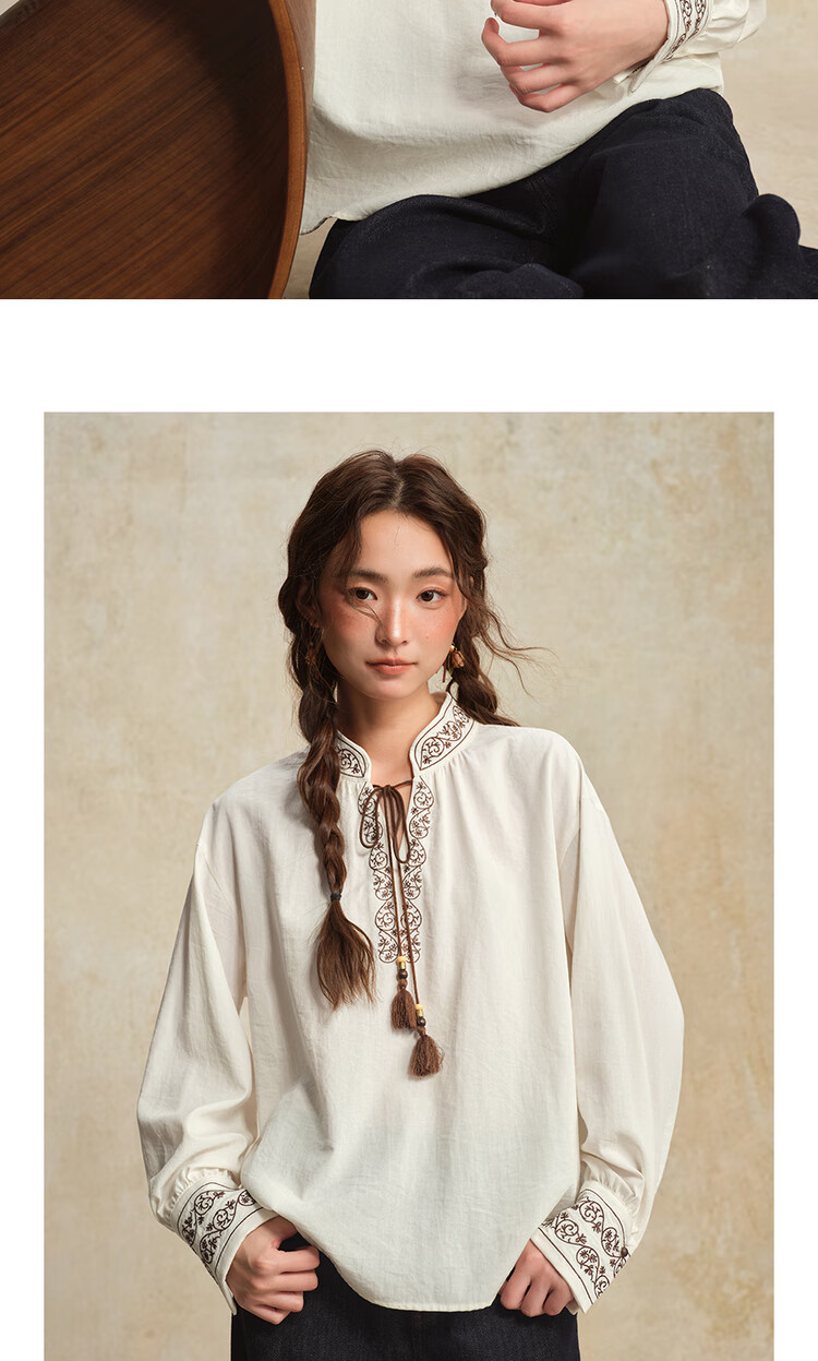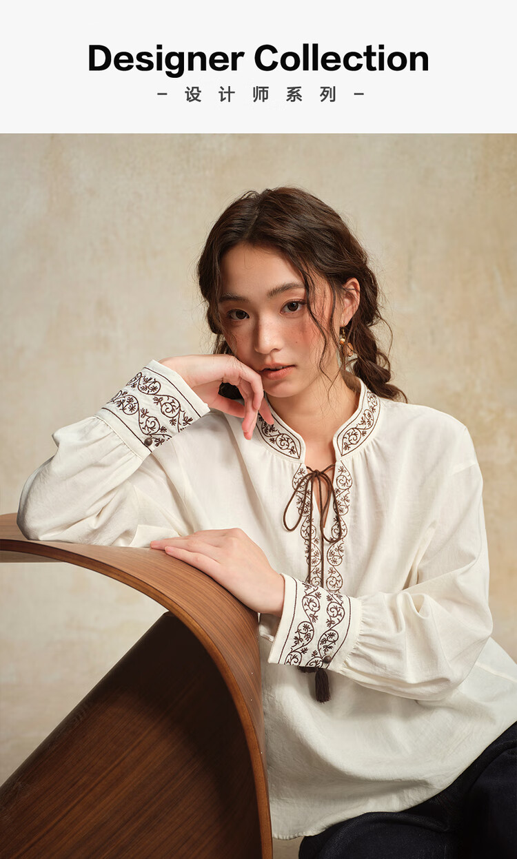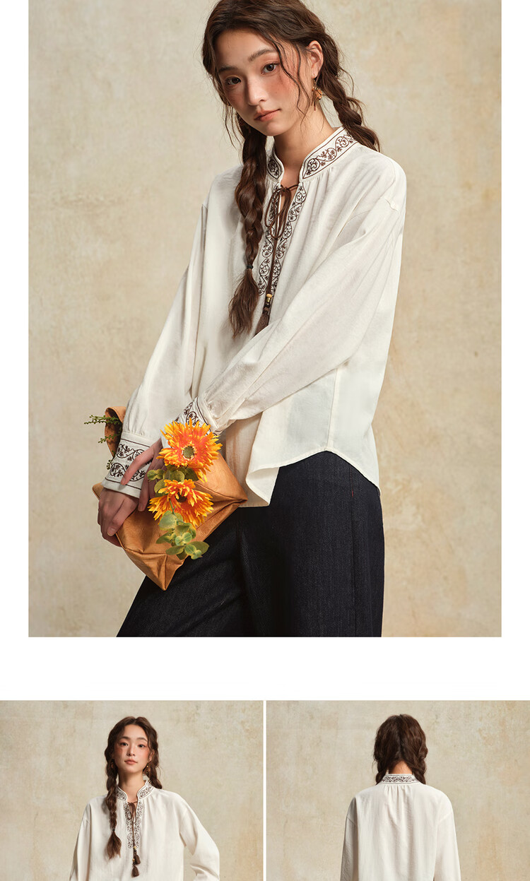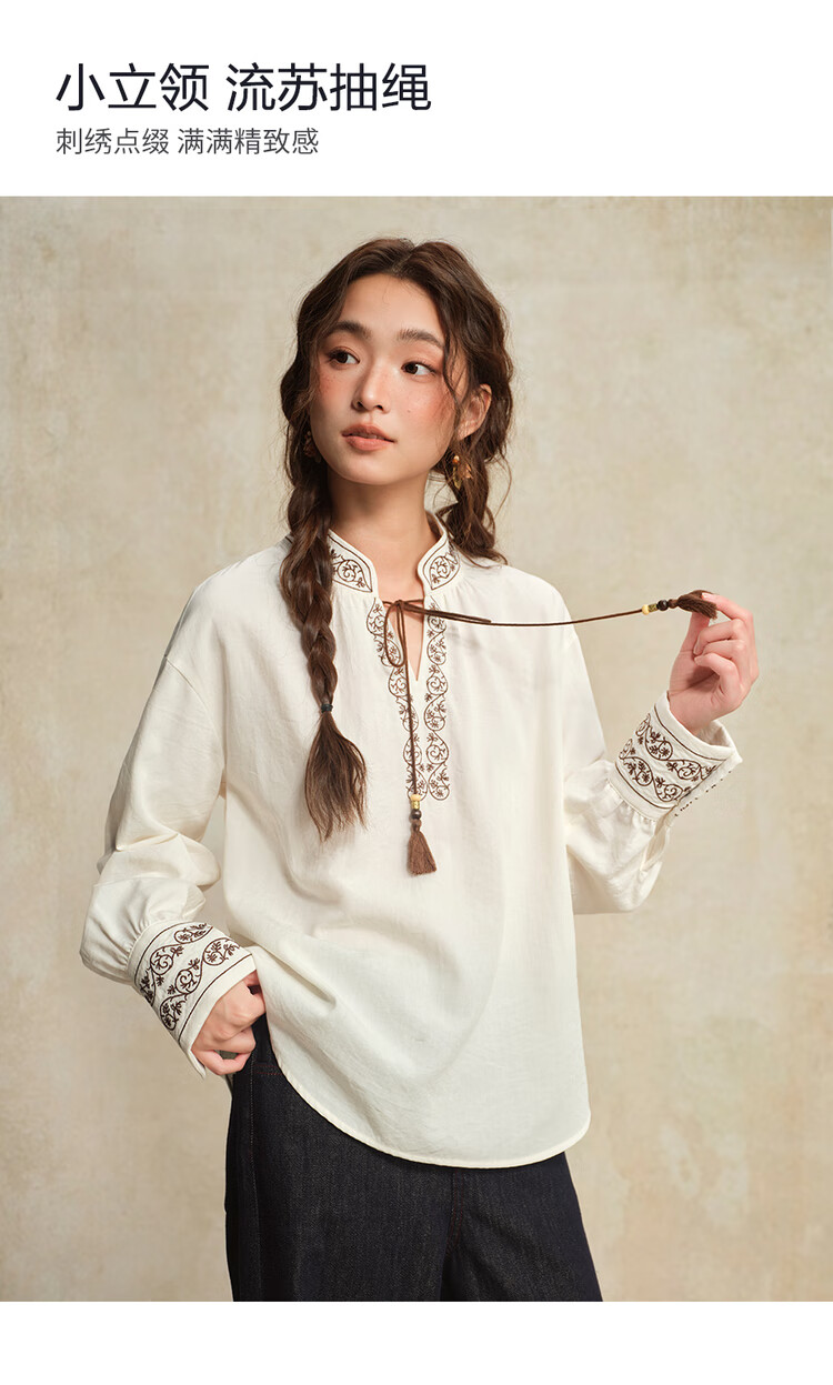 Giordano designer women's new Chinese style embroidered strappy stand collar loose long-sleeved shirt 18345828