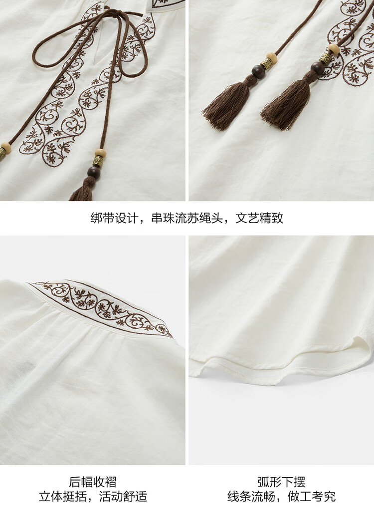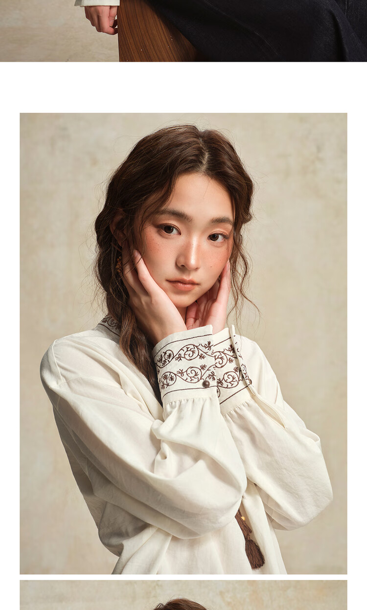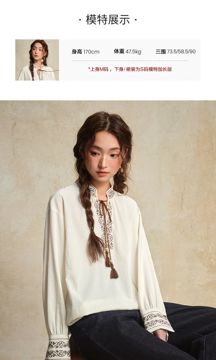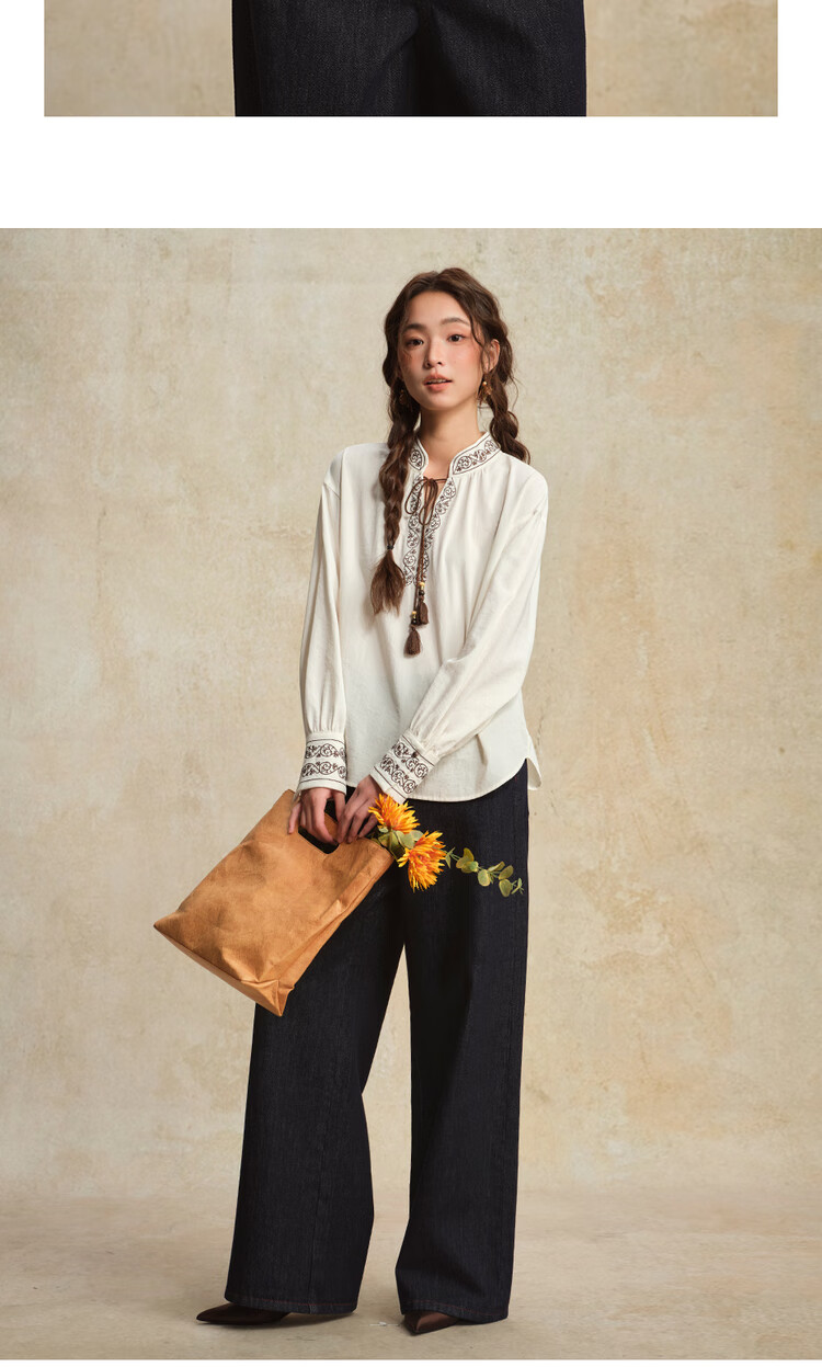 Giordano designer women's new Chinese style embroidered strappy stand collar loose long-sleeved shirt 18345828