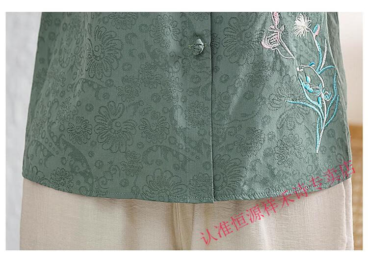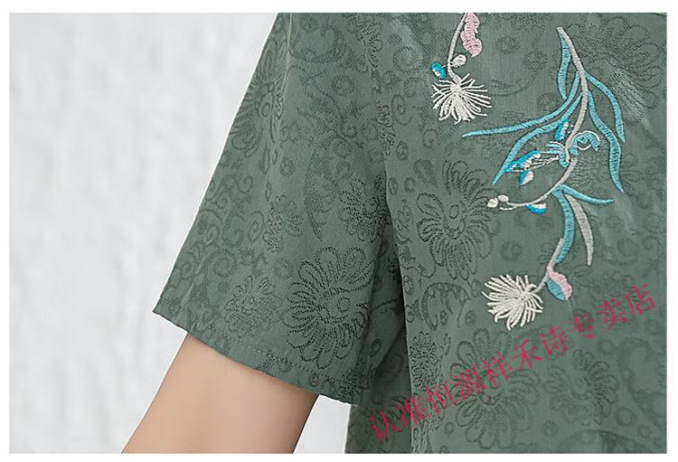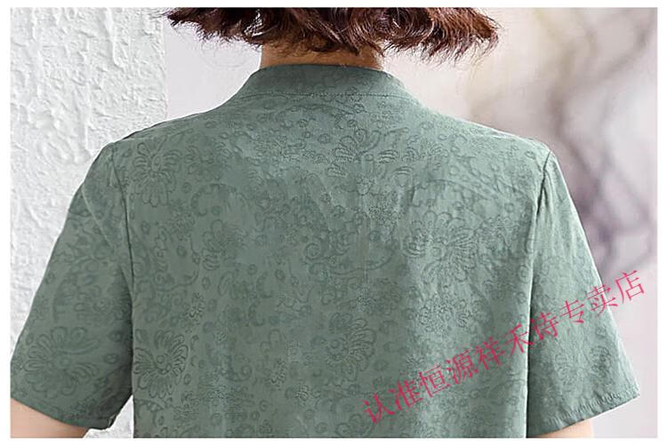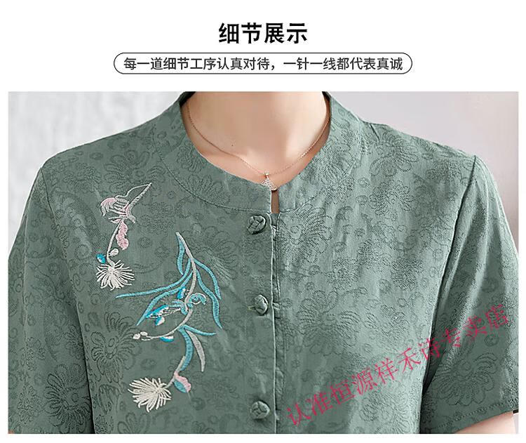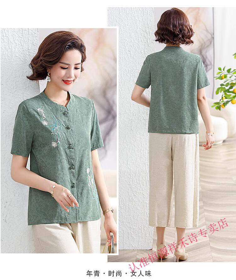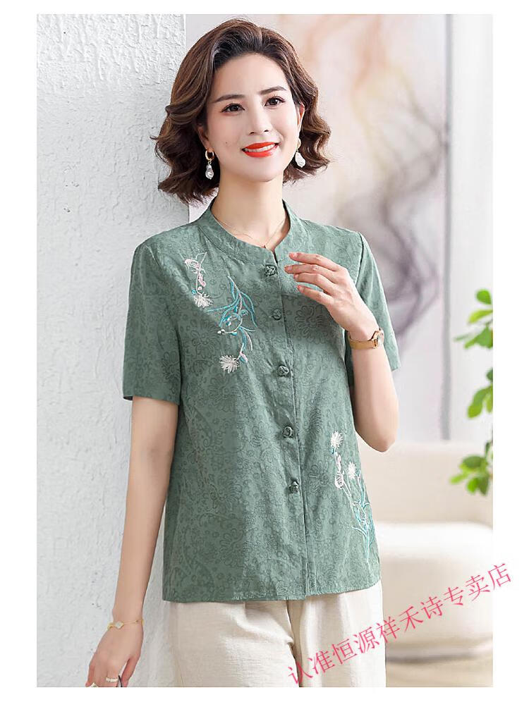 Hengyuanxiang middle-aged and elderly summer wear pure cotton cardigan top short-sleeved shirt women's embroidered ethnic style clothing mother's wear shirt thin green 2XL 105-120Jin Jin equals 0.5 kg