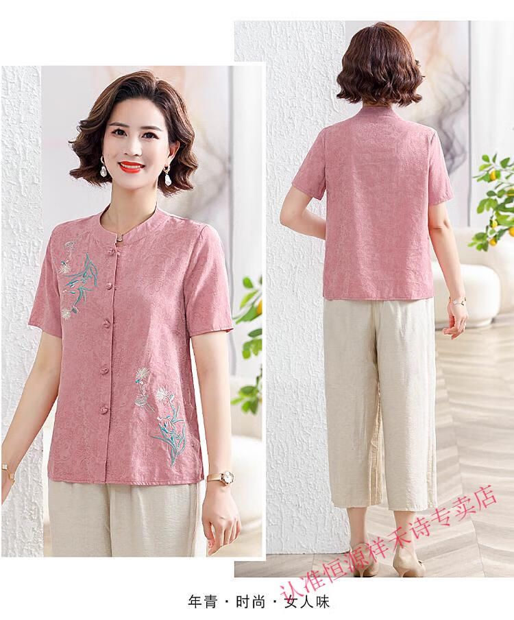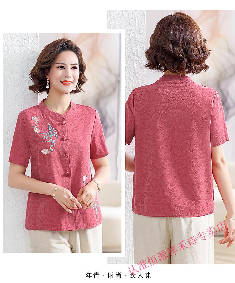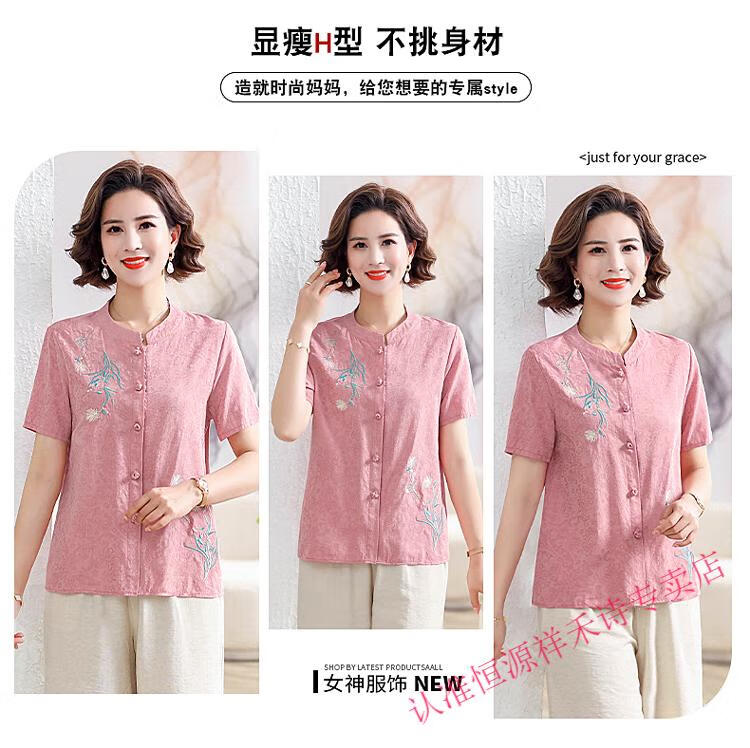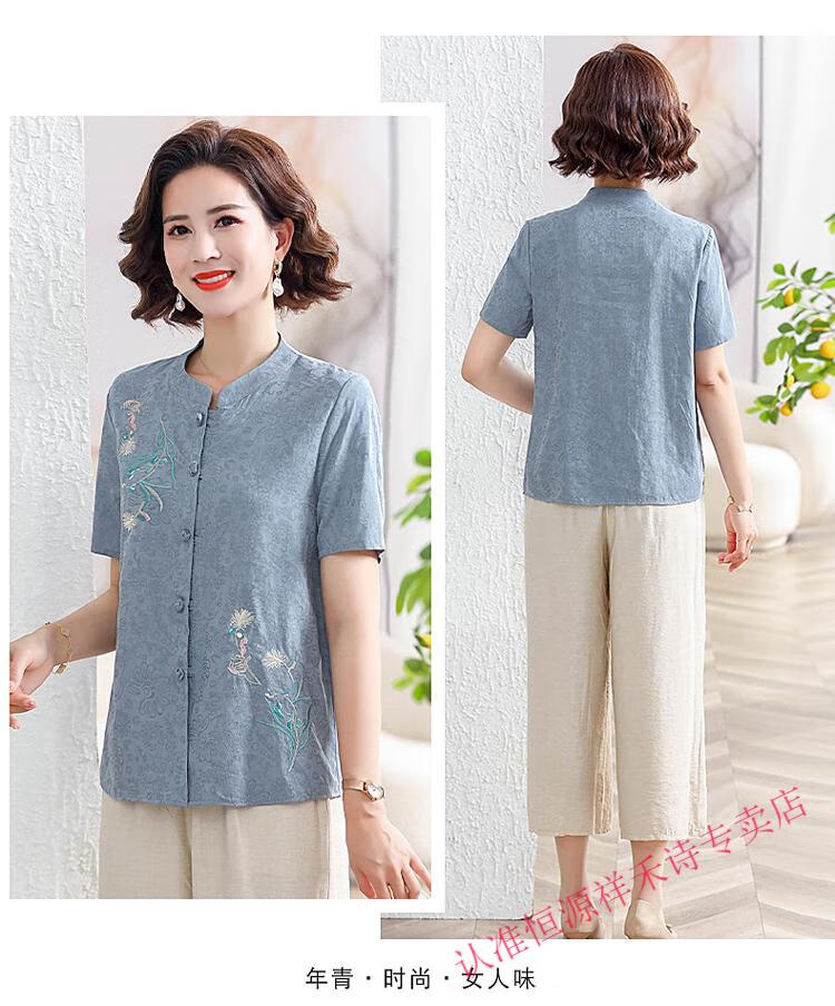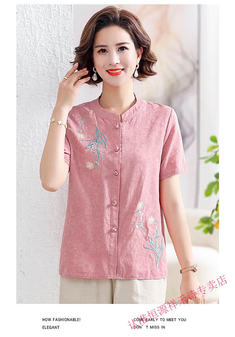 Hengyuanxiang middle-aged and elderly summer wear pure cotton cardigan top short-sleeved shirt women's embroidered ethnic style clothing mother's wear shirt thin green 2XL 105-120Jin Jin equals 0.5 kg