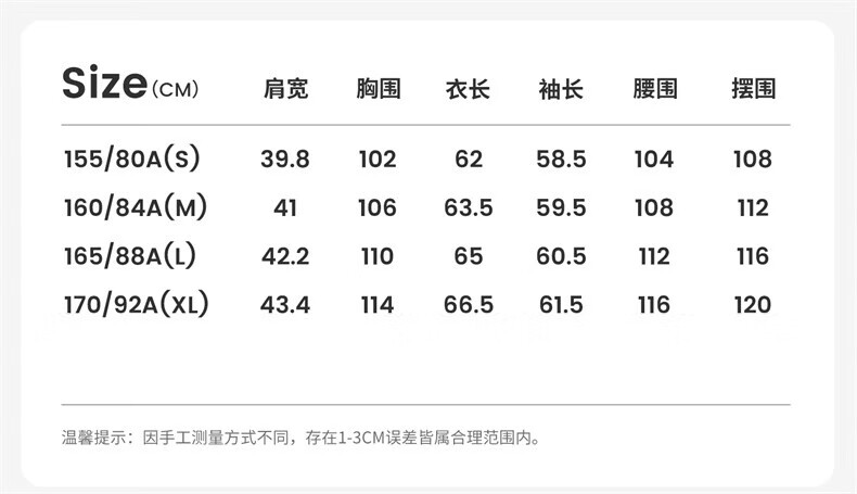 China (cm) 160-165/84-86 165-170 / 88-90 167-172 / 92-96 168-173 / 98-102 170-176 / 106-110