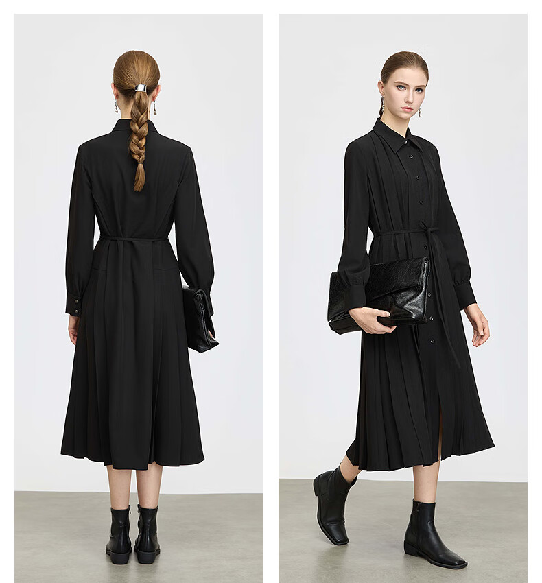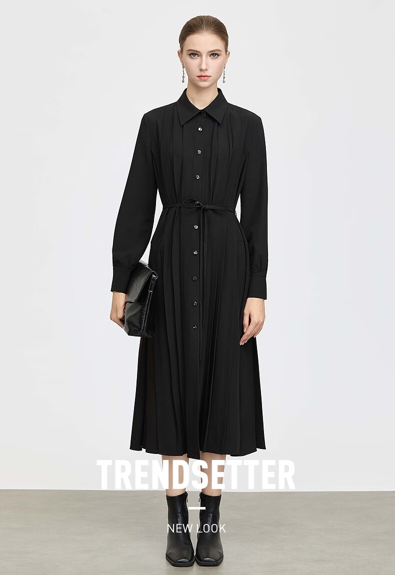 S.DEER Women's 25th New Hepburn Style Lapel Pleated Waist Shirt Dress S25361202 Black/91 S