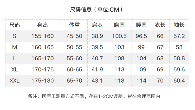 China (cm) 165 / 88-90 170 / 96-98 175 / 108-110 180 / 118-122 185 / 126-130