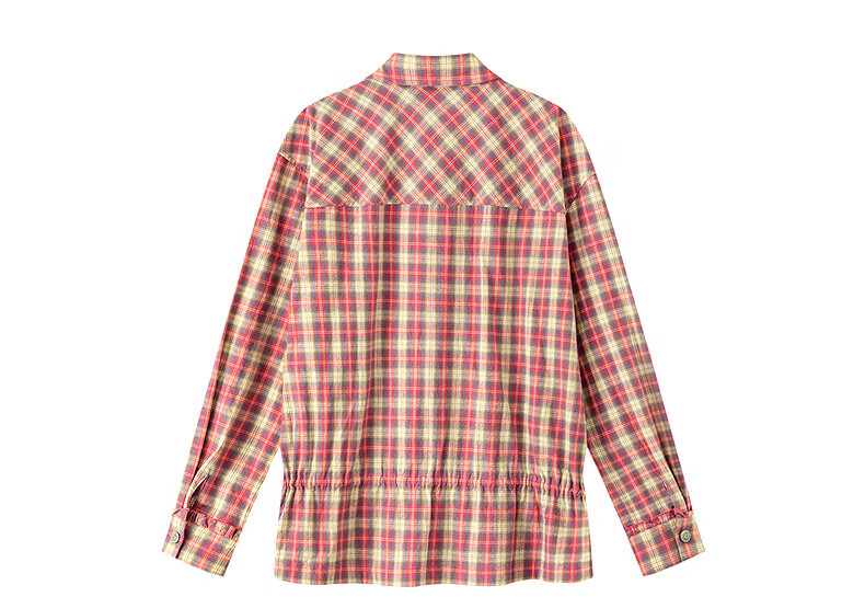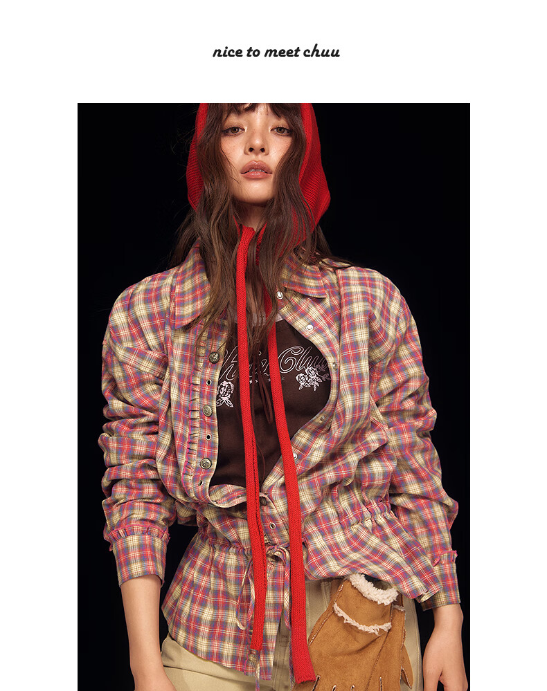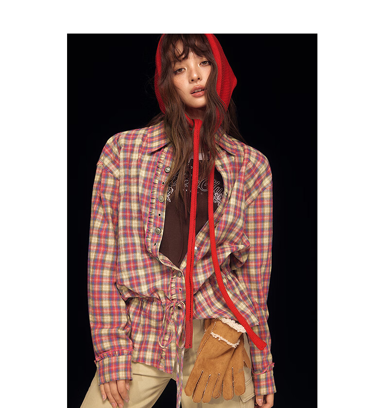 CHUU letter plaid shirt for women 2025 winter new embroidered fungus lace-up lapel long-sleeved top pink plaid one size
