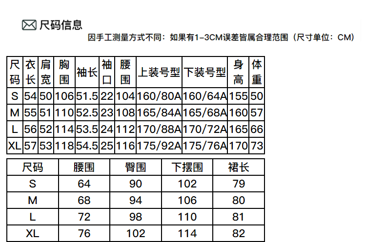 China (cm) 160-165/84-86 165-170 / 88-90 167-172 / 92-96 168-173 / 98-102 170-176 / 106-110