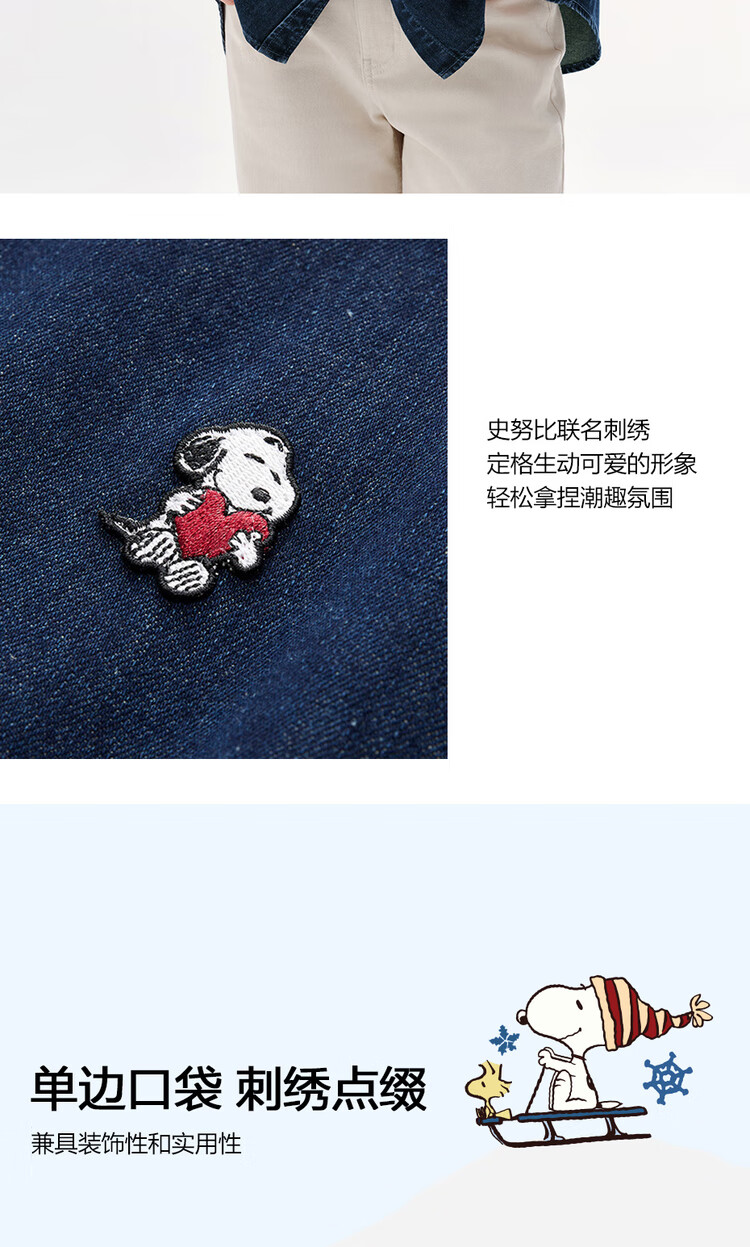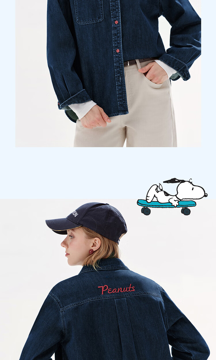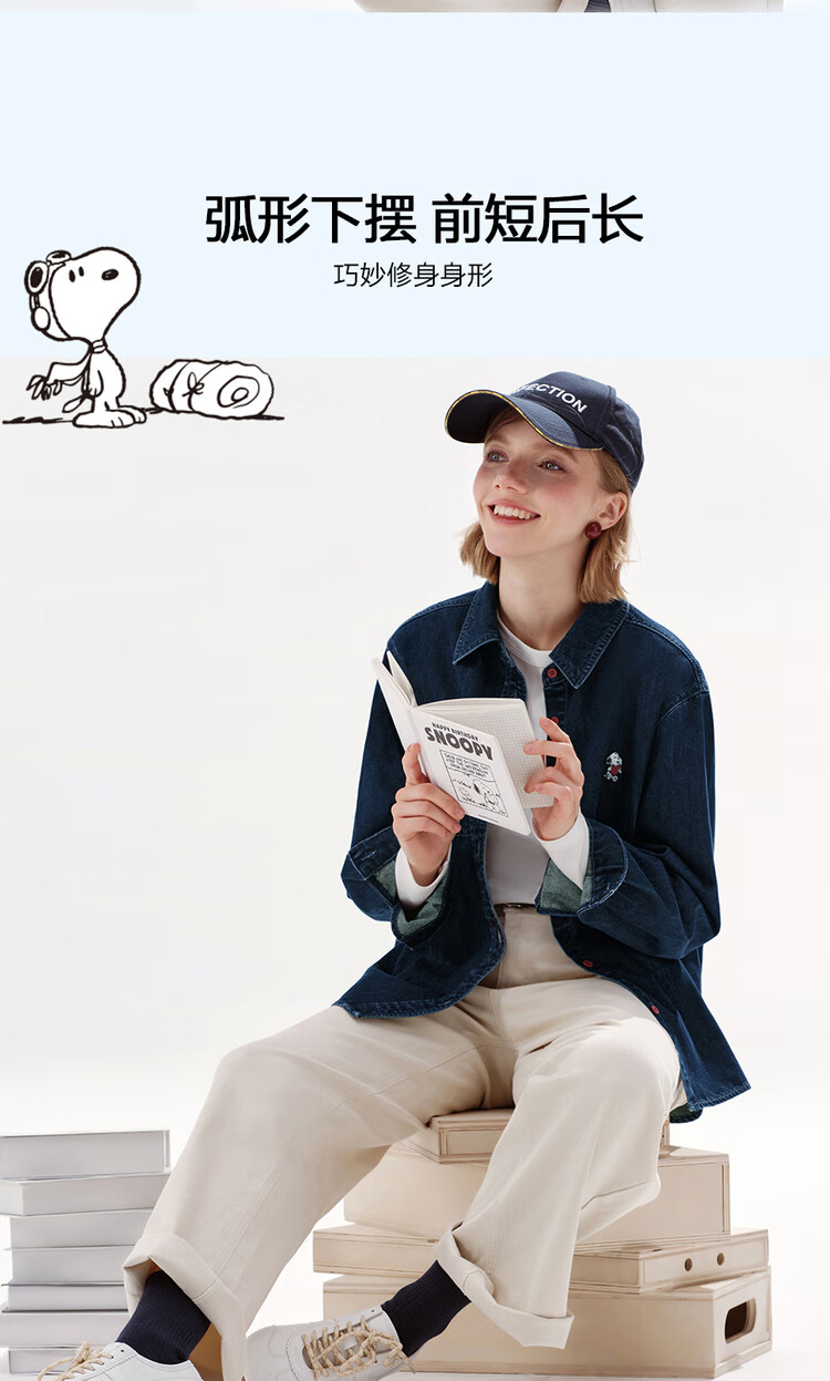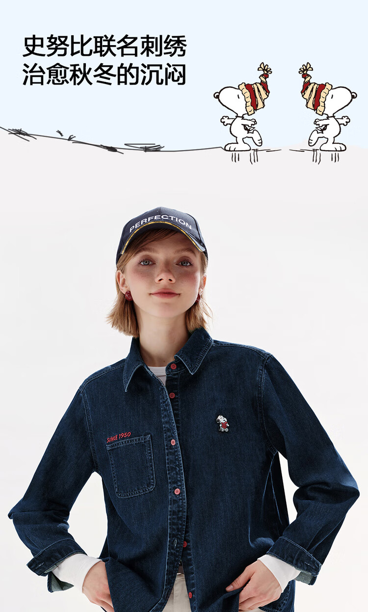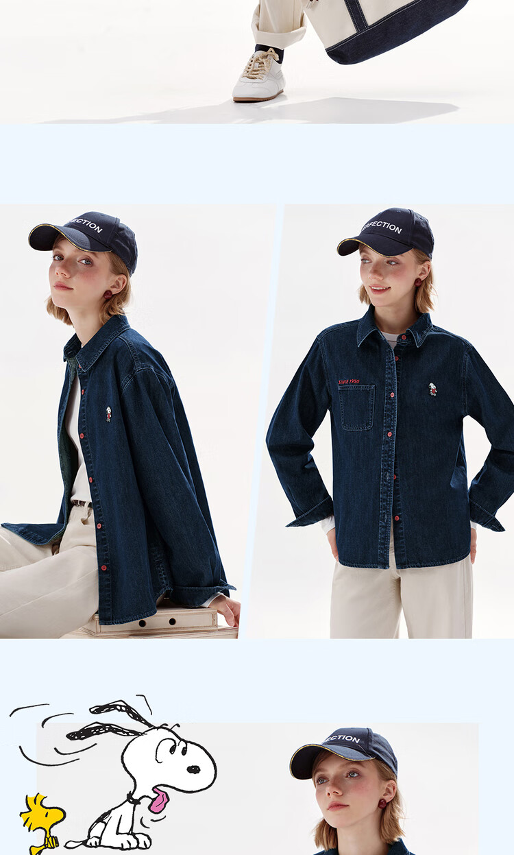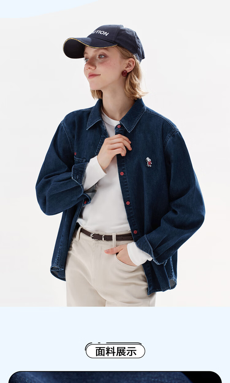Giordano Snoopy co-branded retro new embroidered pocket loose denim shirt women's long sleeve 18345704 62 denim blue S